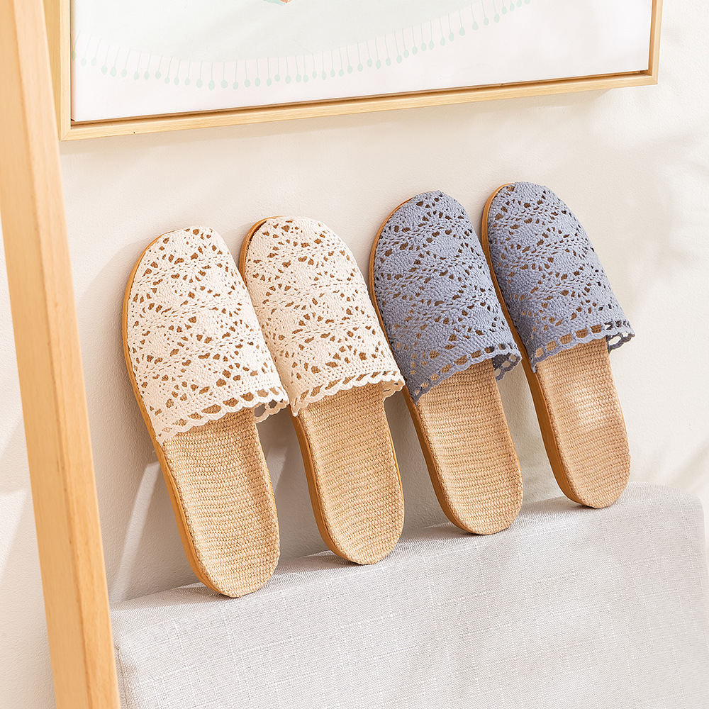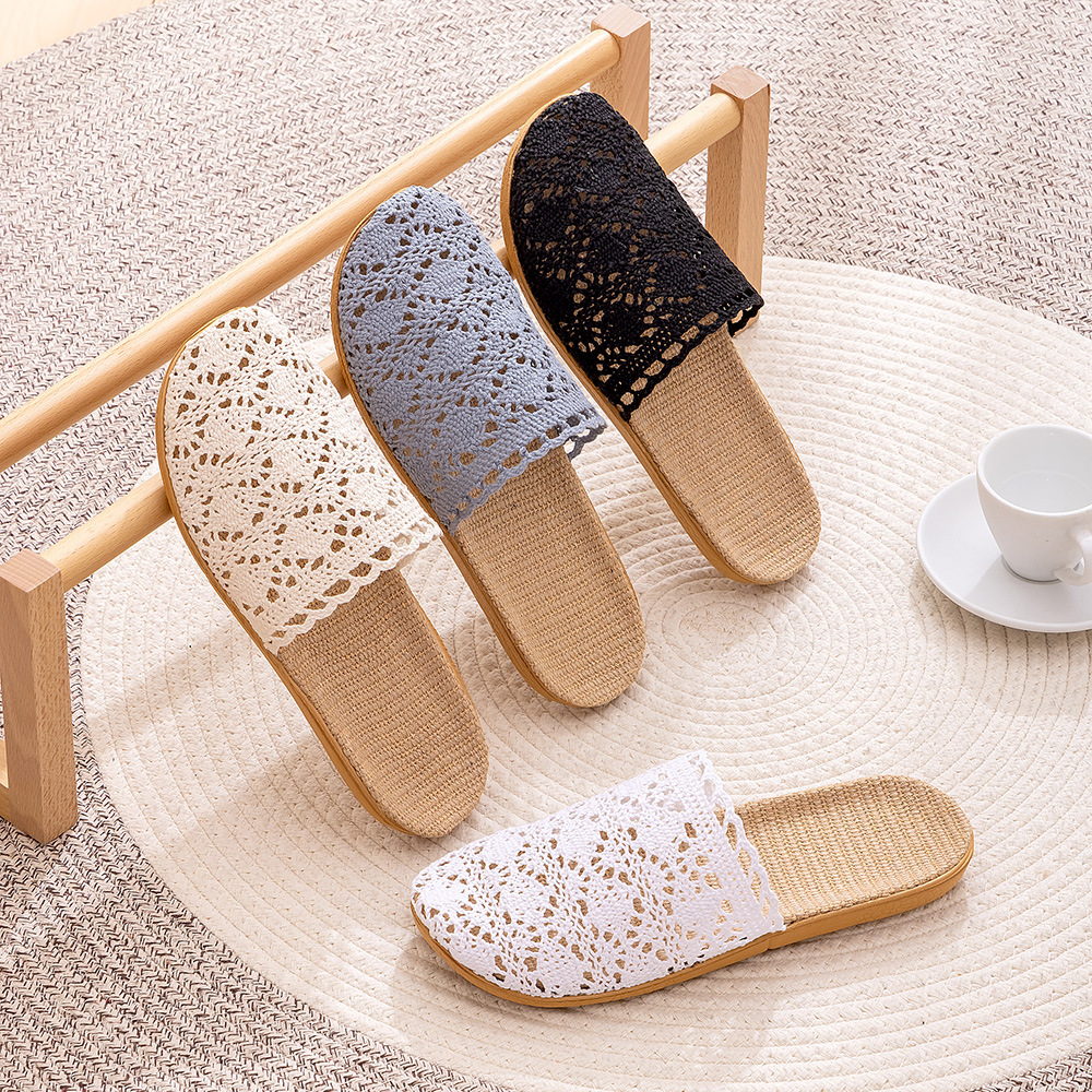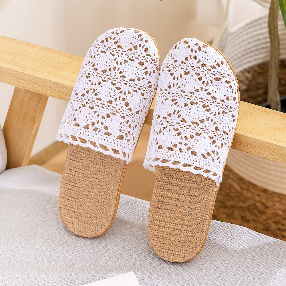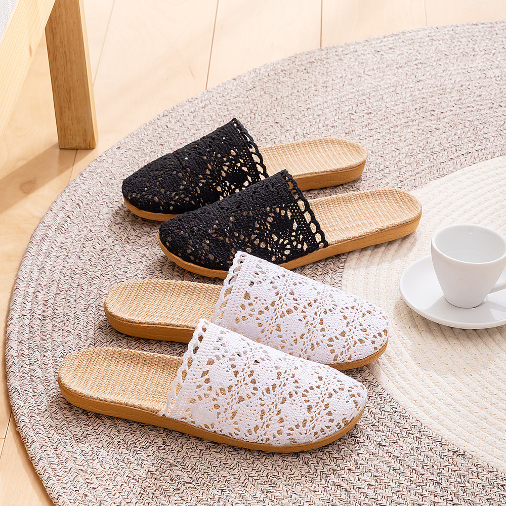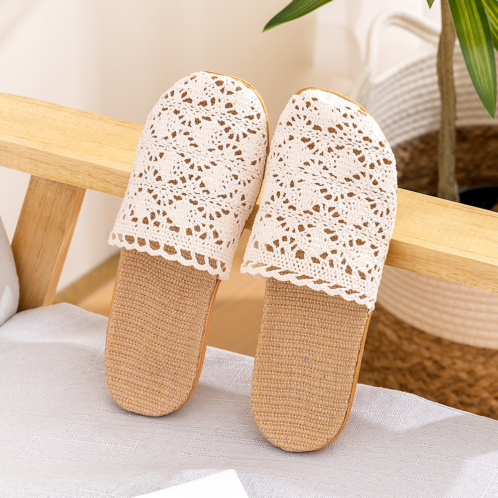 새로운 사계절 바오터우 레이스 홈 리넨 여성 슬리퍼 실내 미끄럼 방지 홈 나무 바닥 침묵 슬리퍼