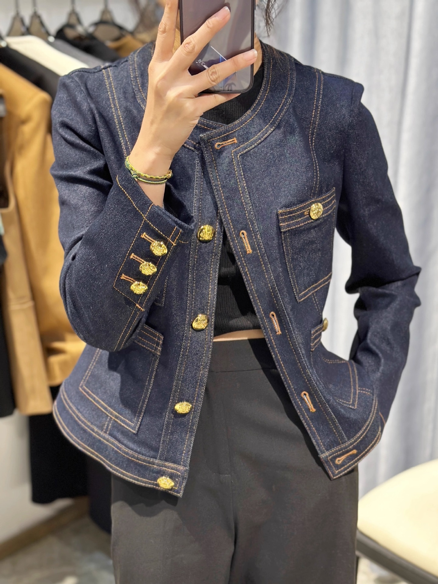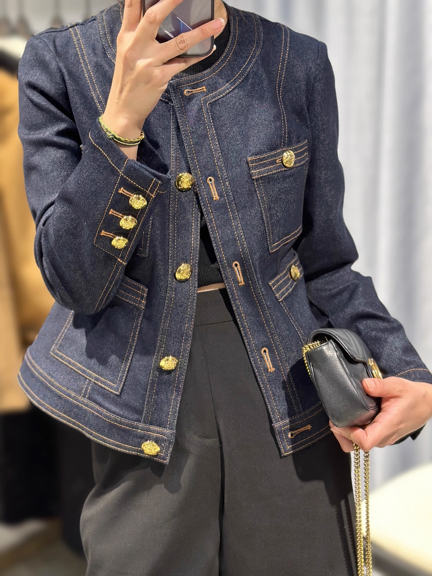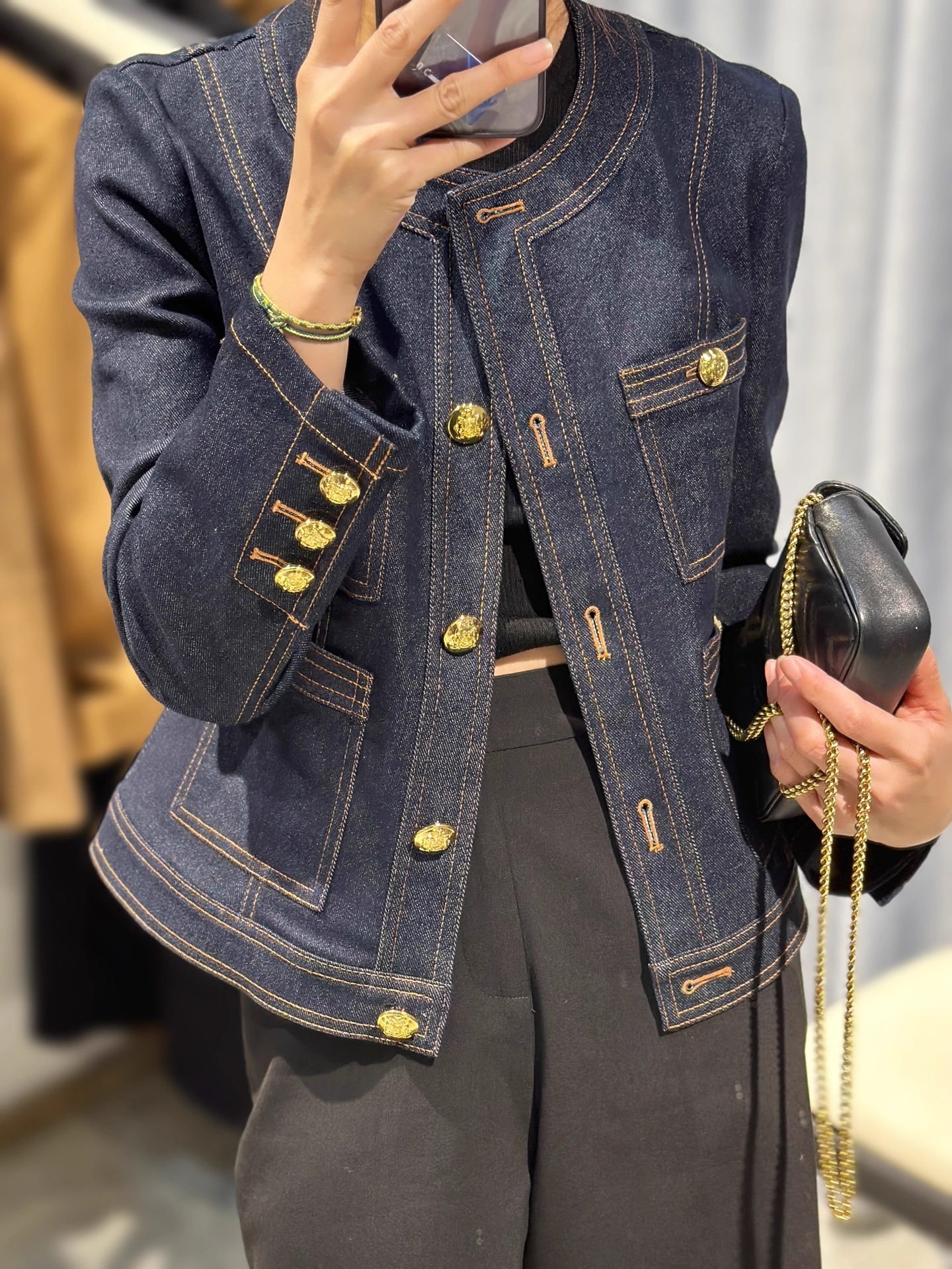 2025 이른 봄과 가을 새로운 스타일 데님 짧은 코트 여성의 작은 샤넬 스타일 대비 컬러 밝은 라인 골든 버튼스토어 가기