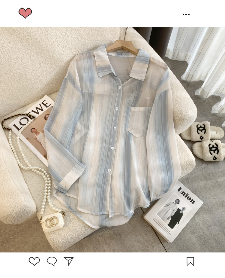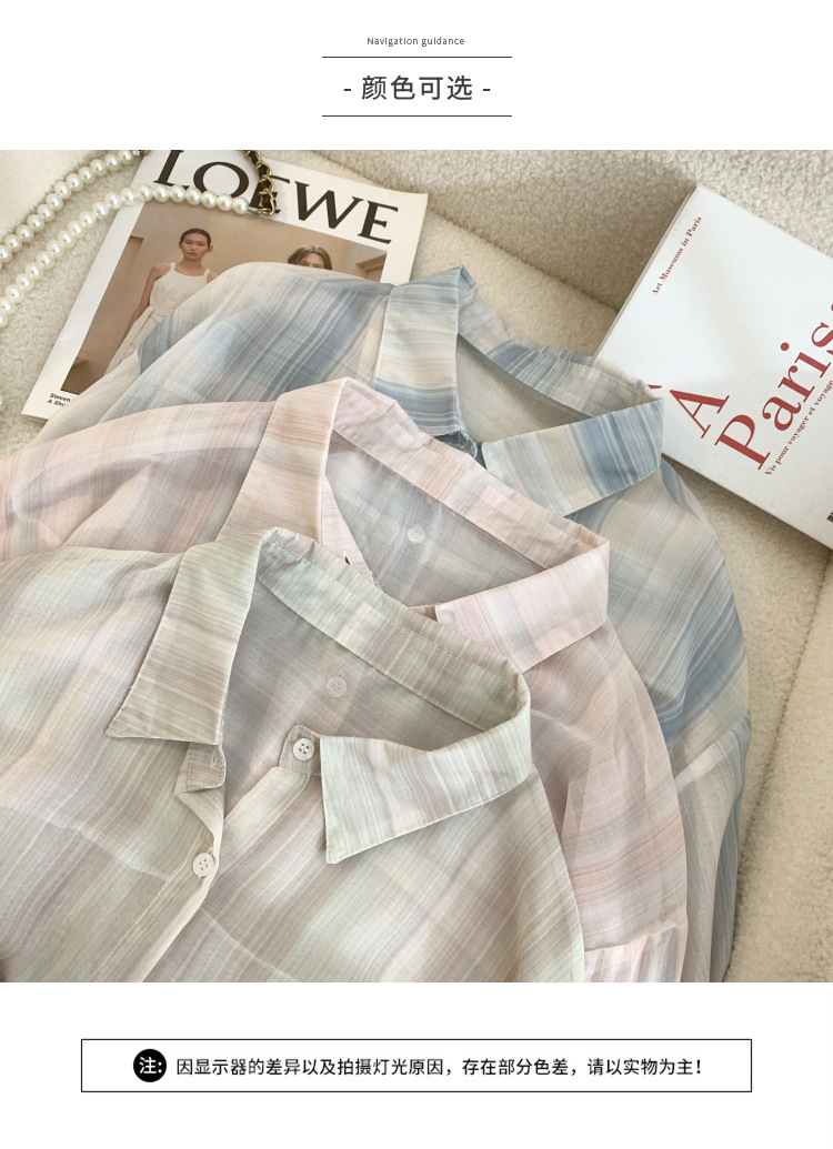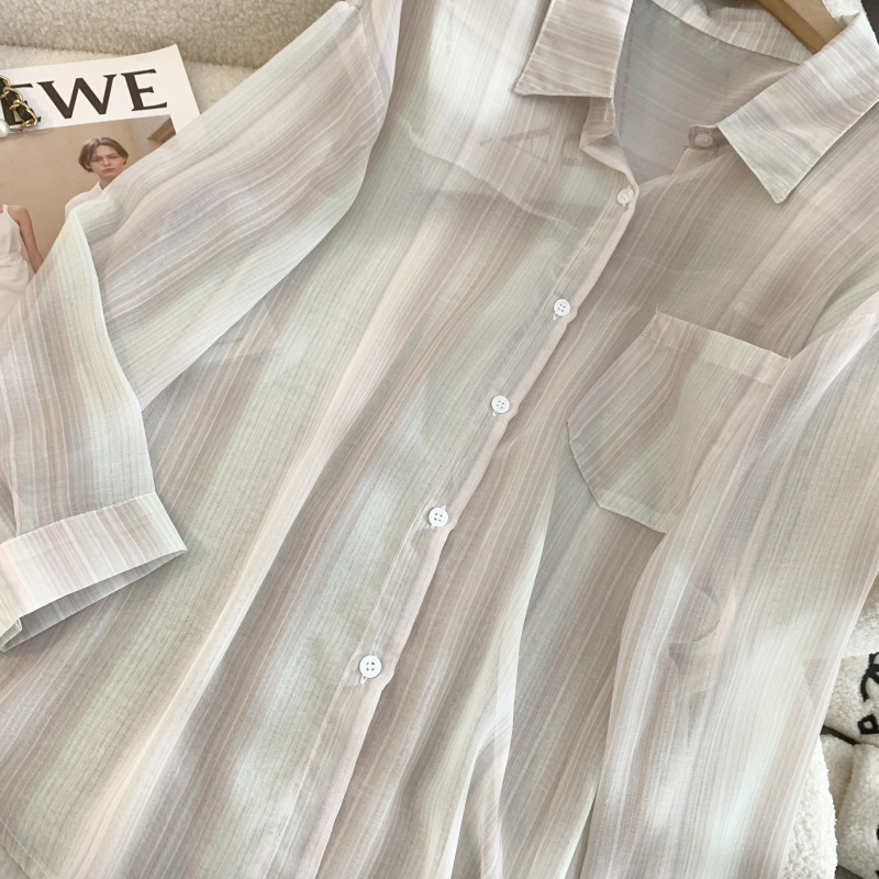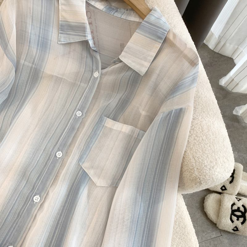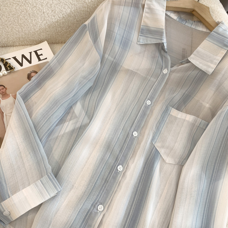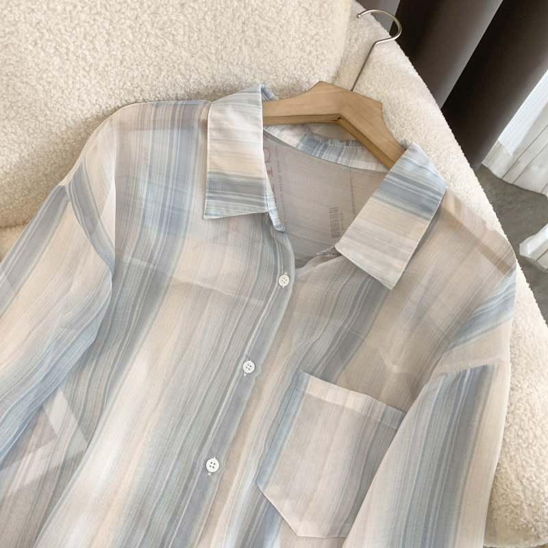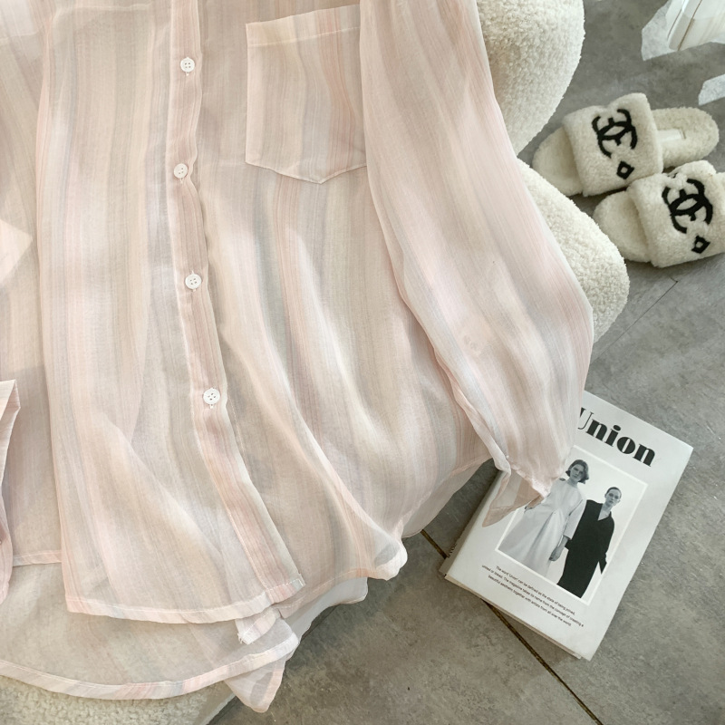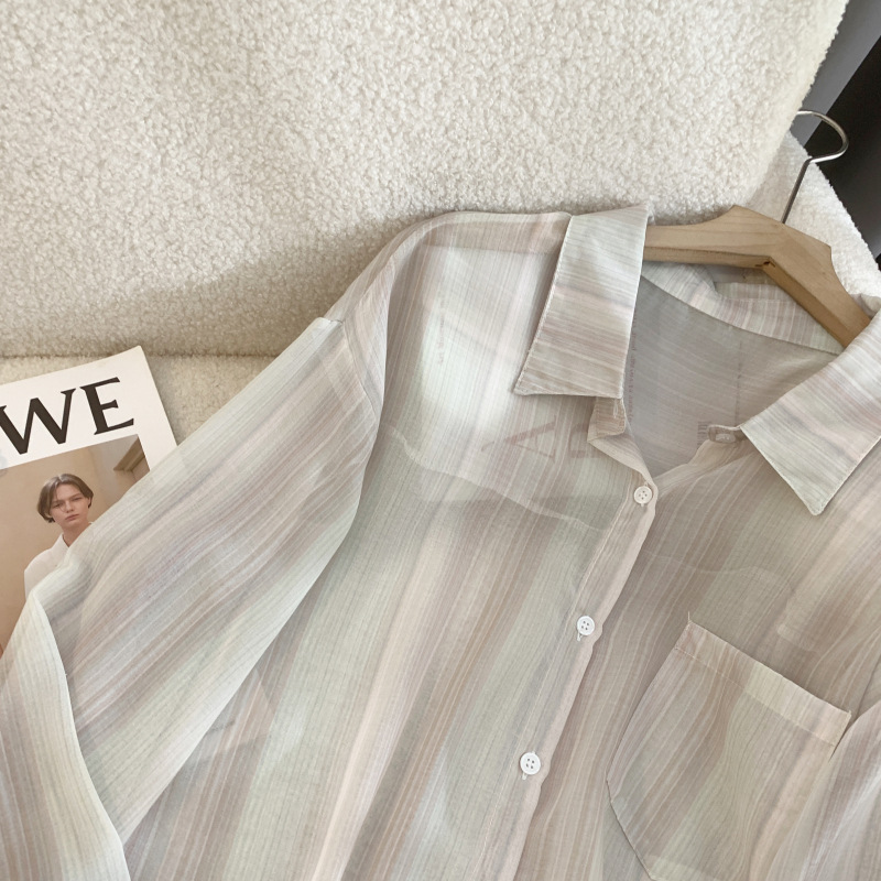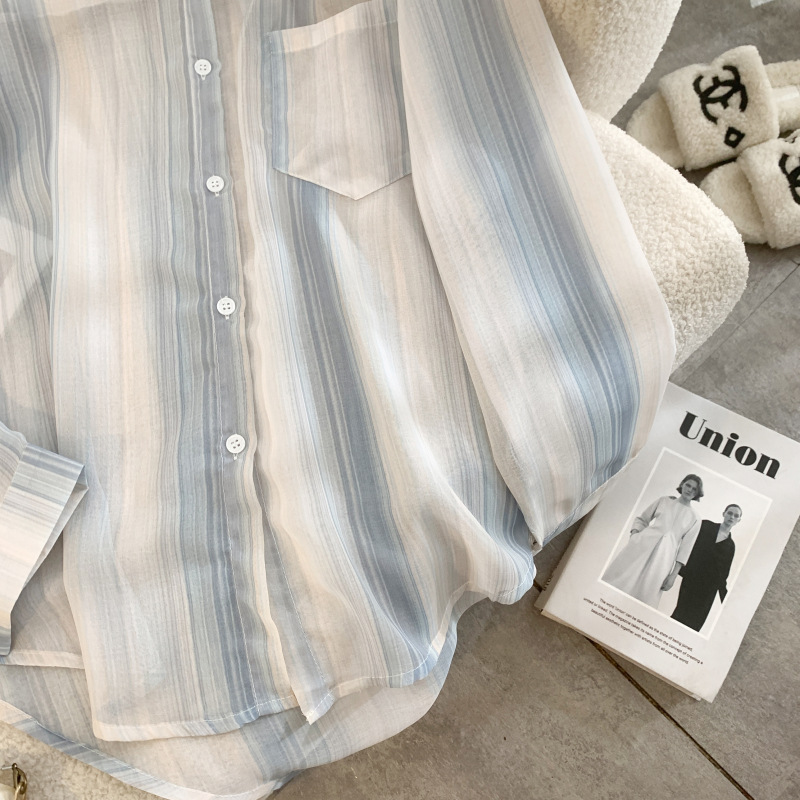 2025 여름 새로운 컬러 스트라이프 긴팔 셔츠 진주 빛 아름다운 그라디언트 선 스크린 얇은 셔츠 여성 트렌드스토어 가기