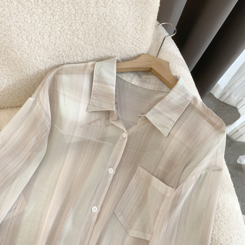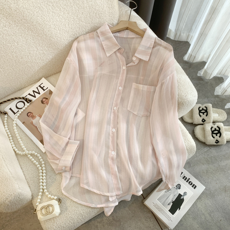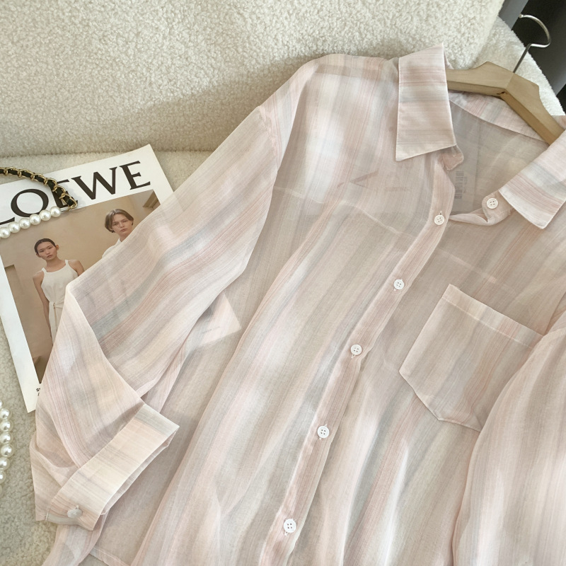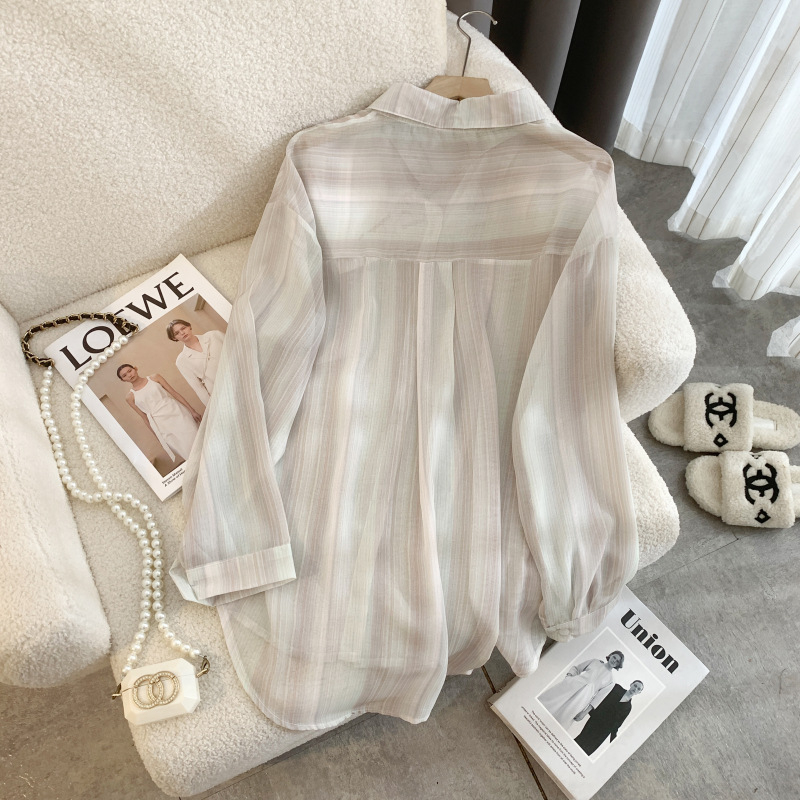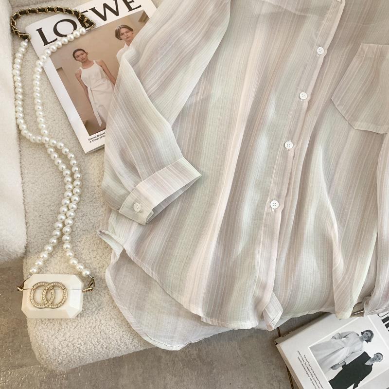 2025 여름 새로운 컬러 스트라이프 긴팔 셔츠 진주 빛 아름다운 그라디언트 선 스크린 얇은 셔츠 여성 트렌드