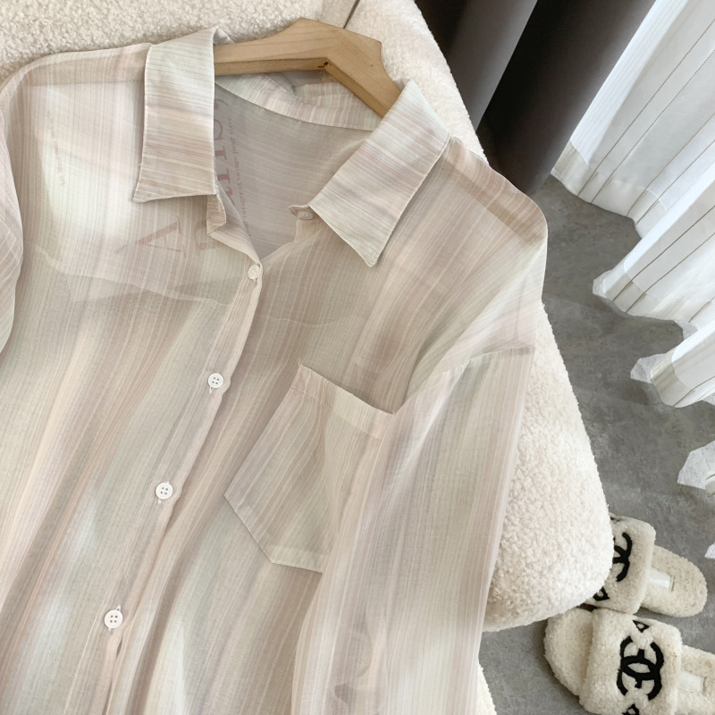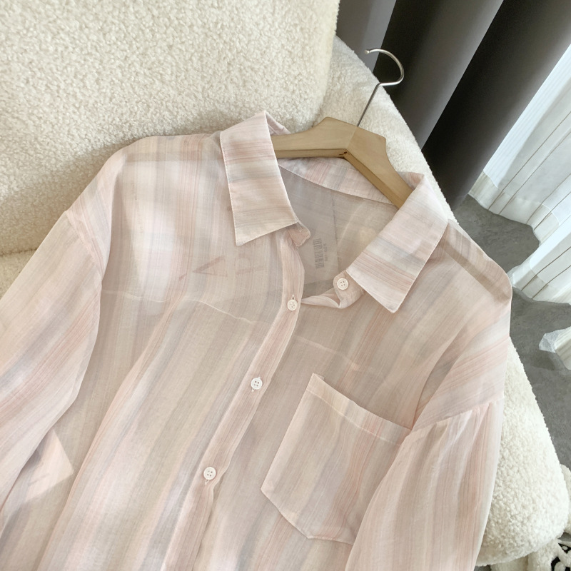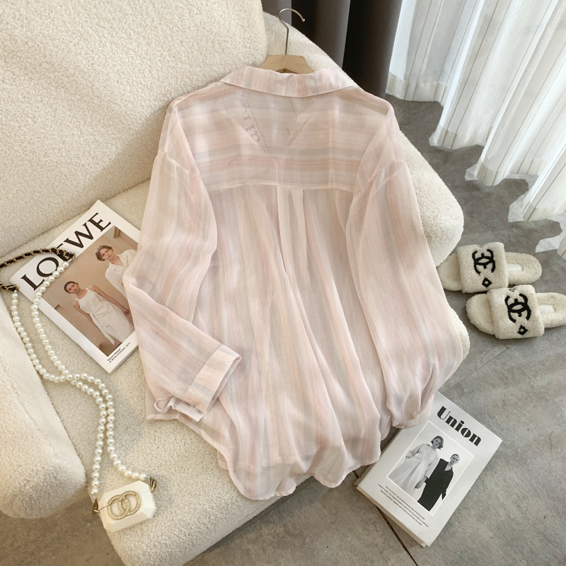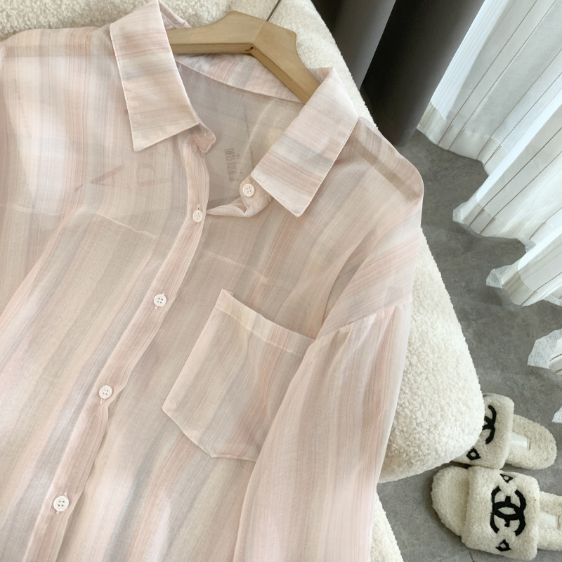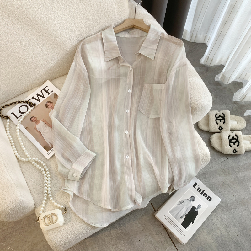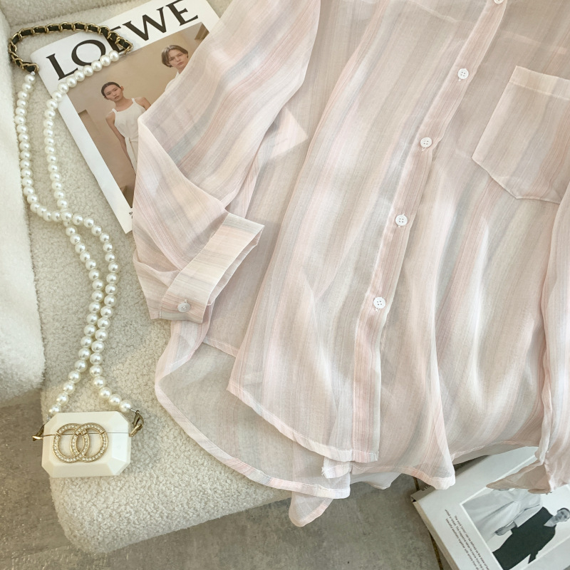 2025 여름 새로운 컬러 스트라이프 긴팔 셔츠 진주 빛 아름다운 그라디언트 선 스크린 얇은 셔츠 여성 트렌드
