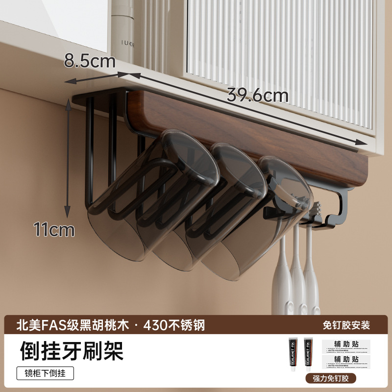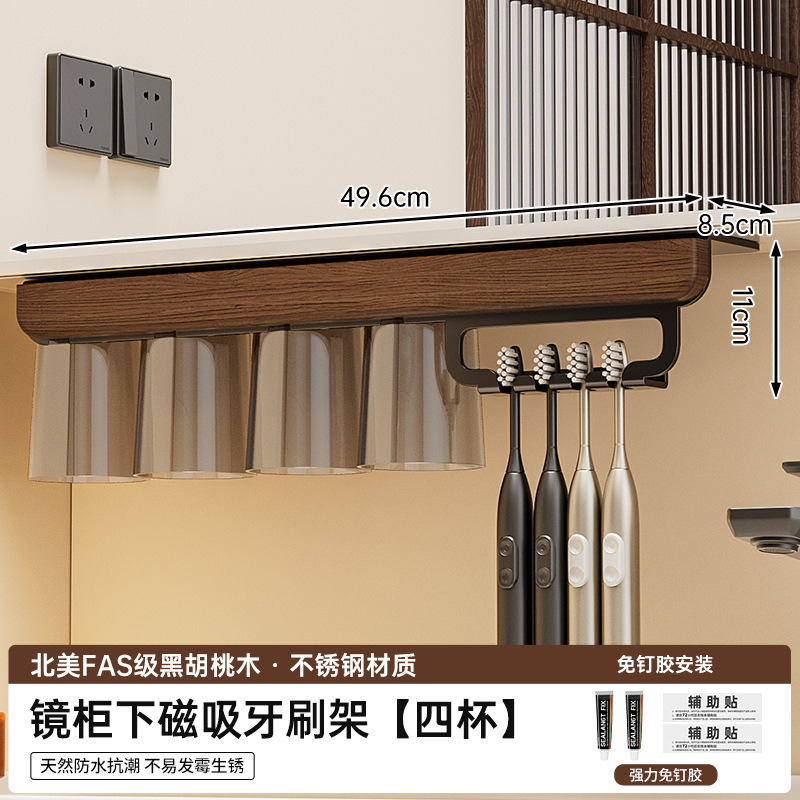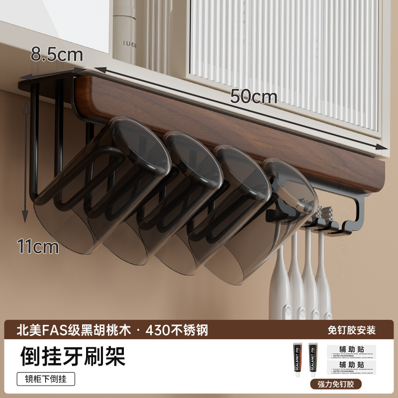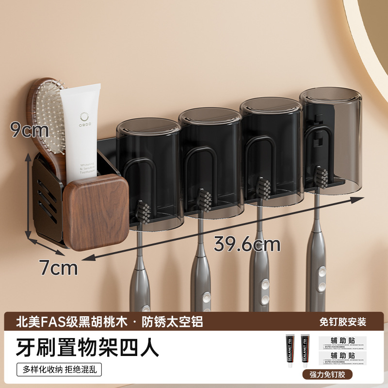 • 호두나무 칫솔꽂이 4인용 - 투명 회색 컵