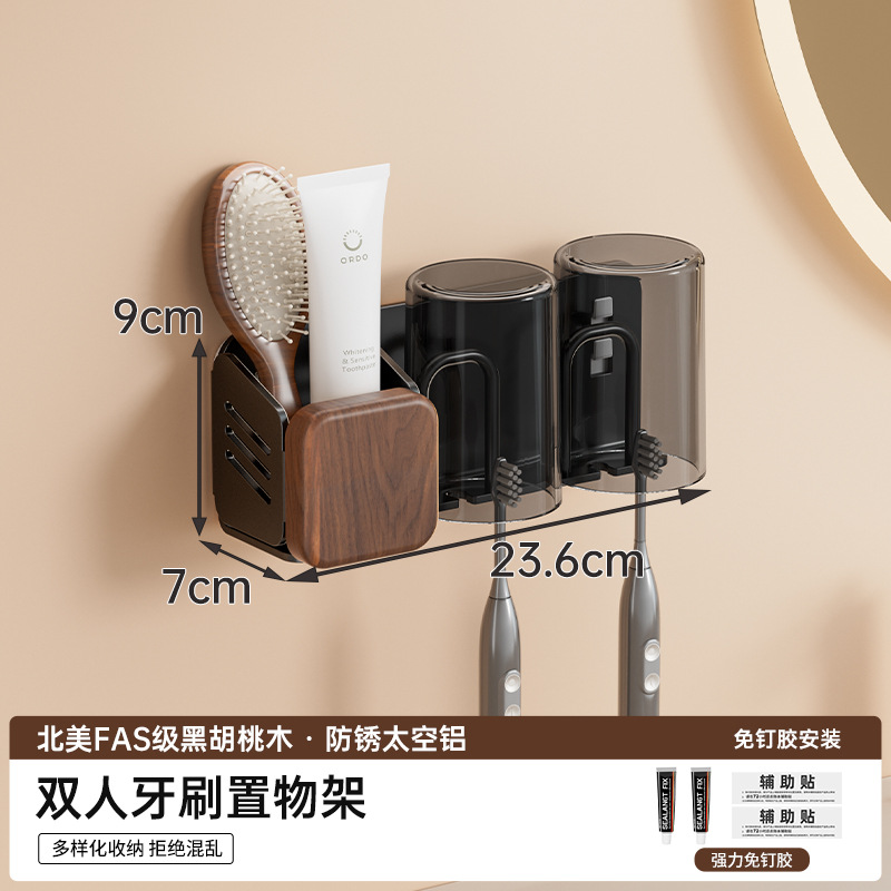 • 호두나무 칫솔꽂이 2인용 - 투명 회색 컵