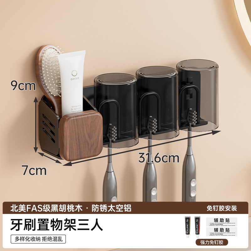 • 호두나무 칫솔꽂이 3인용 - 투명 회색 컵