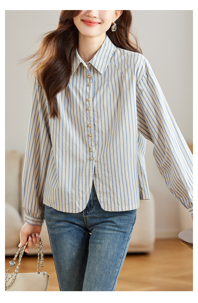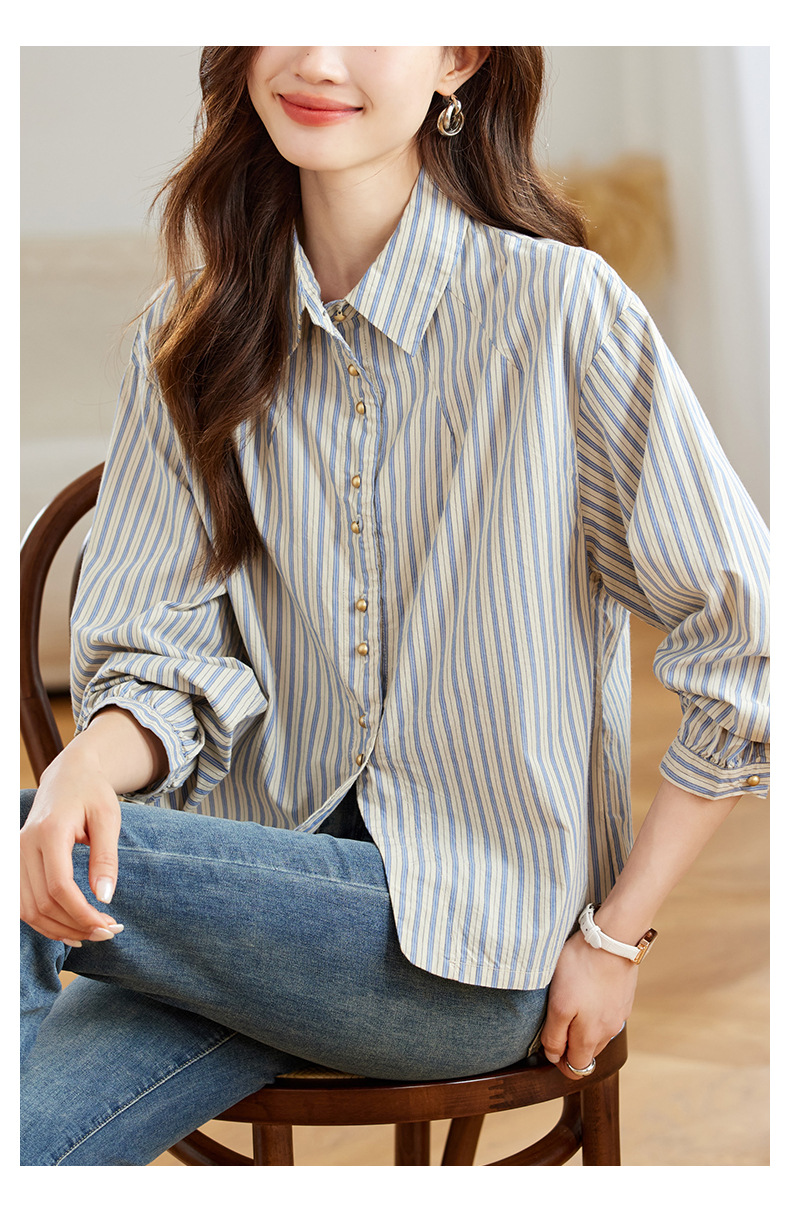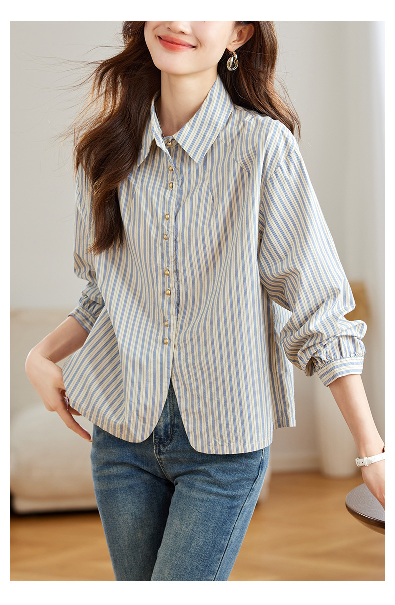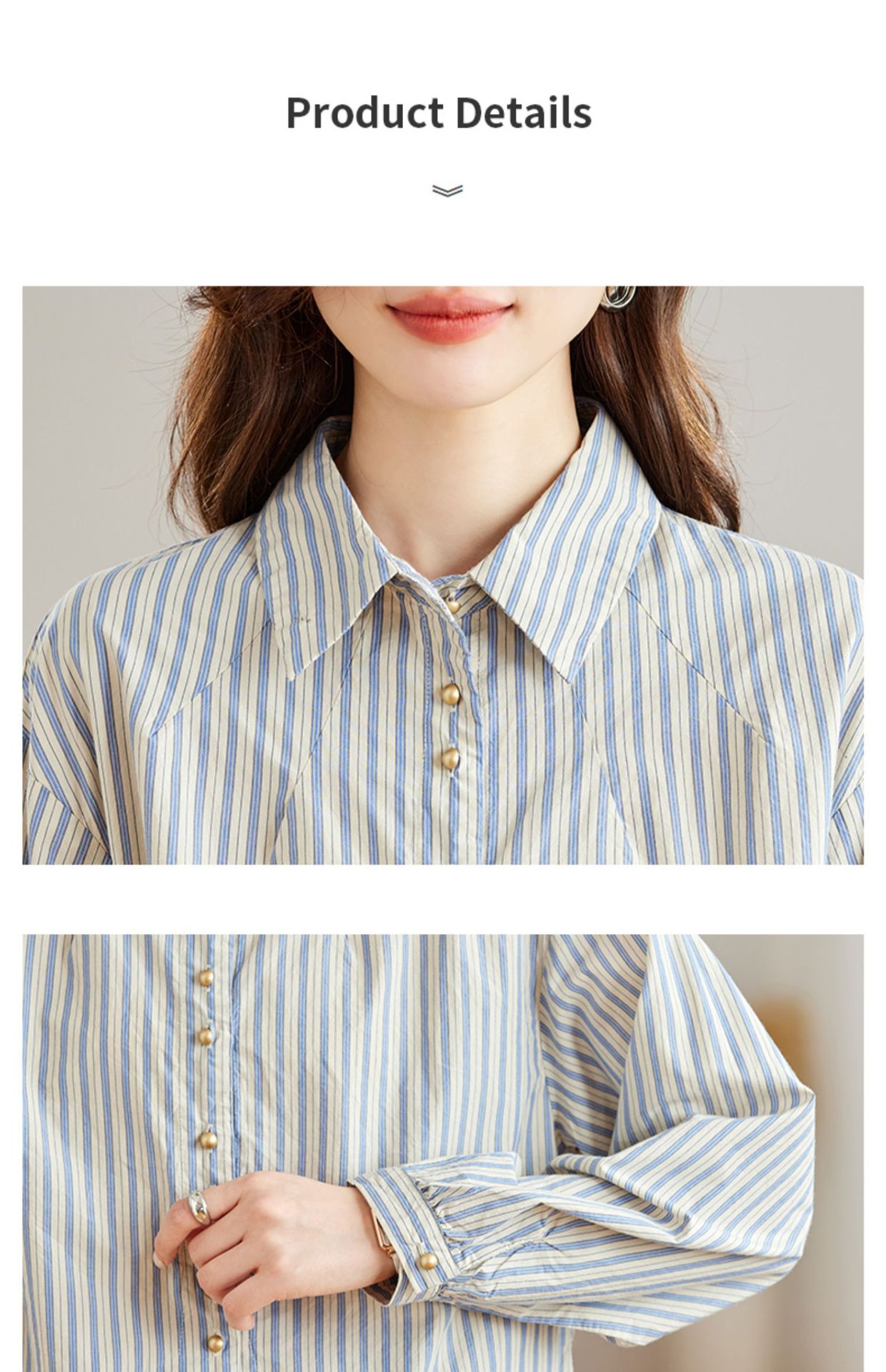 줄무늬 셔츠 여성 긴팔 2025 봄 가을 새 진주 버클 탑 한국 캐주얼 느슨한 면 셔츠스토어 가기