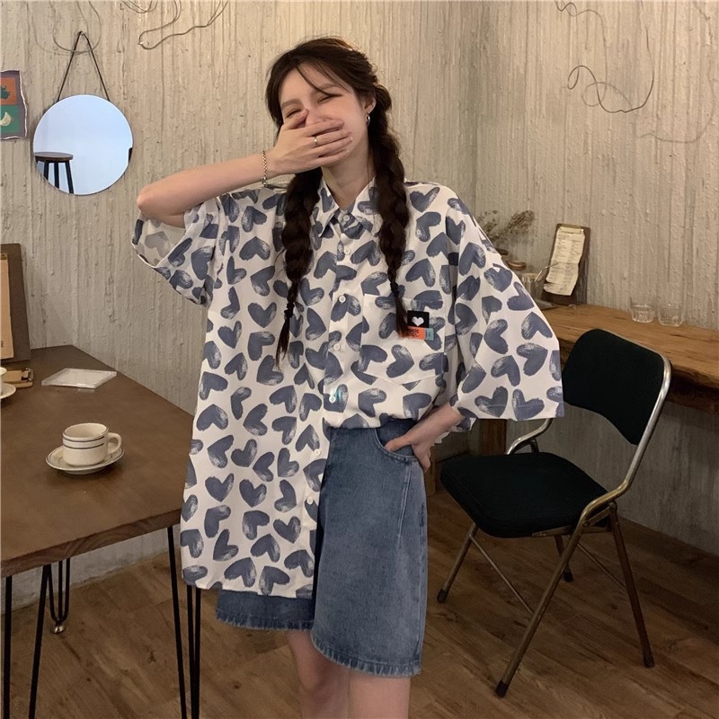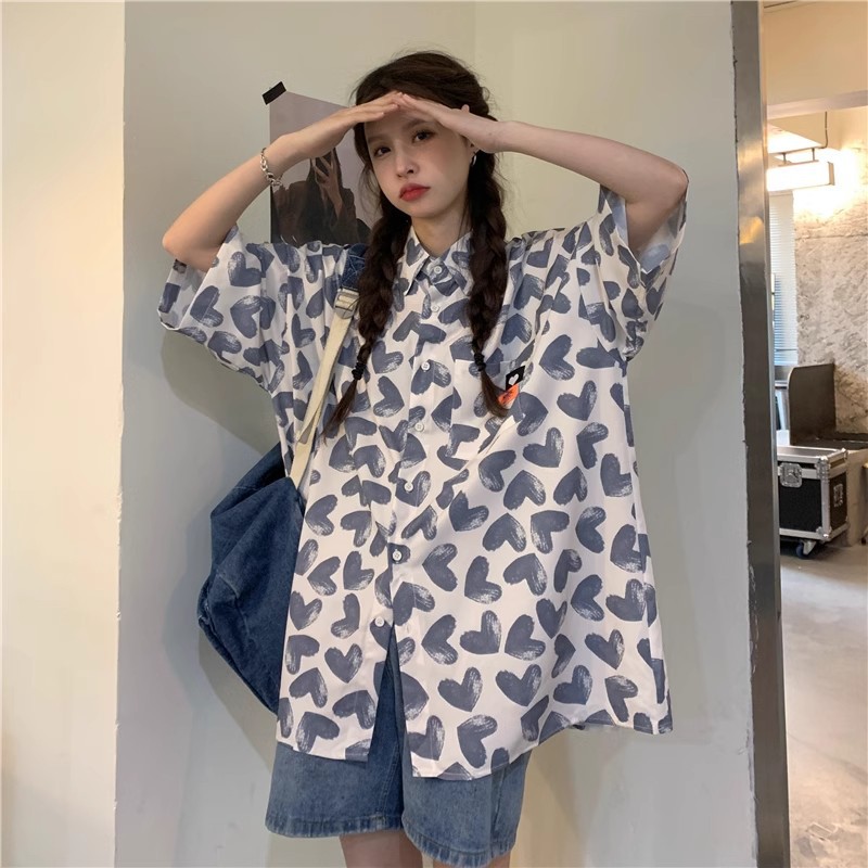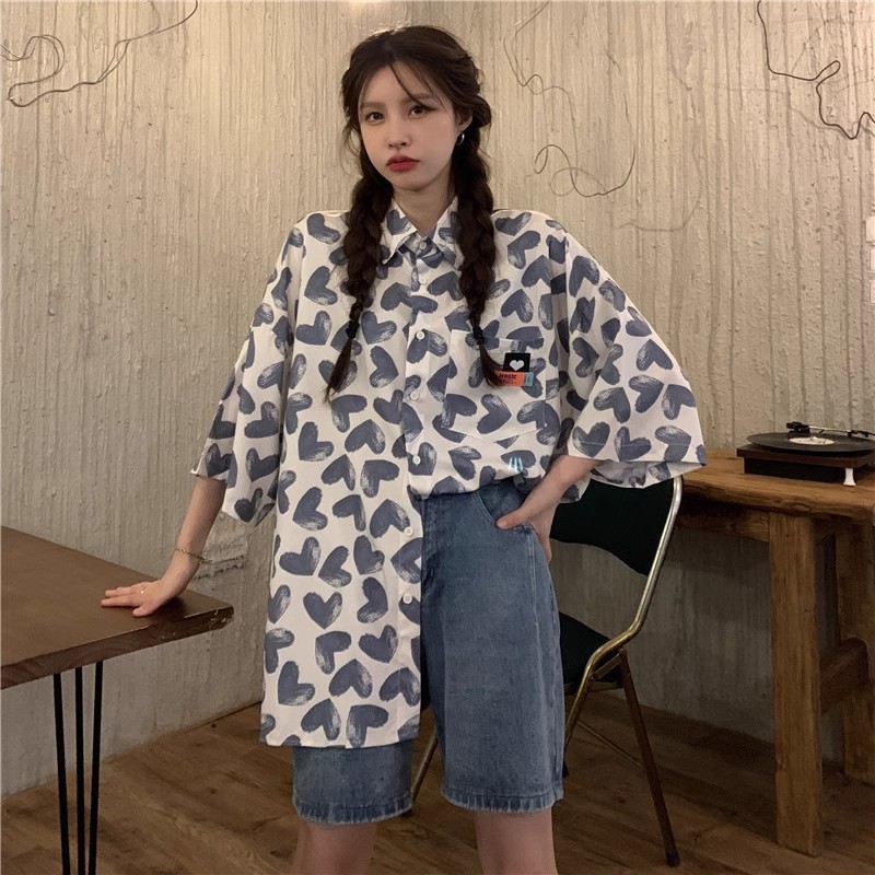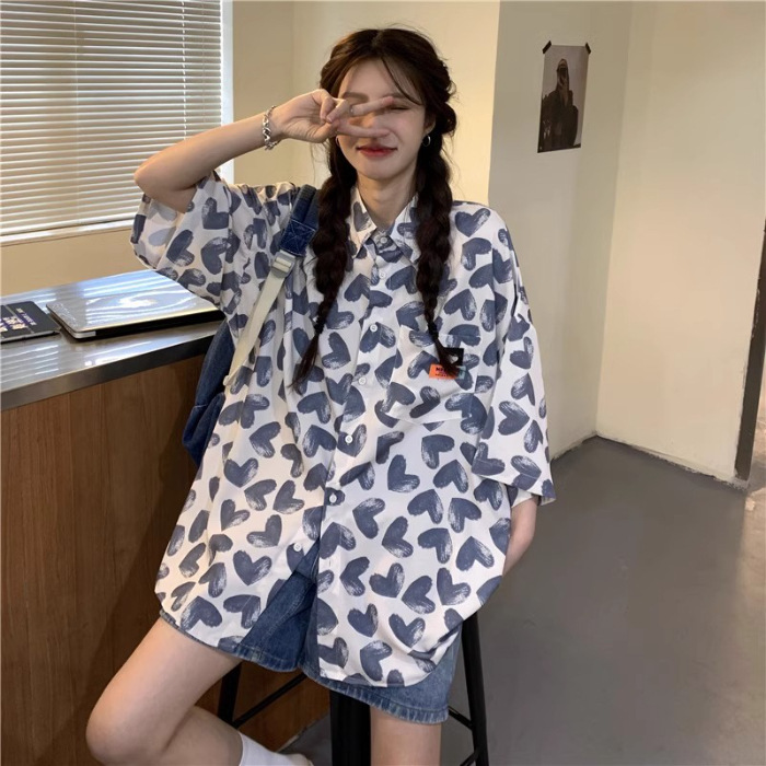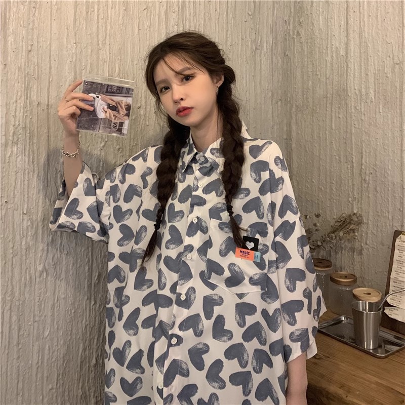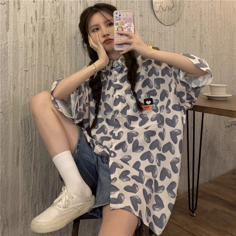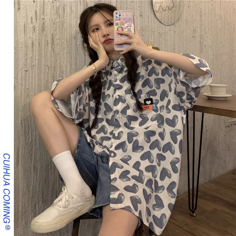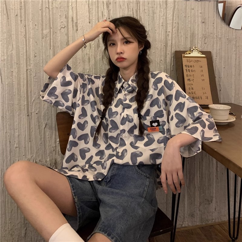미국식 하트 반팔 셔츠 여성용 여름 만화 얇은 스타일 대학풍 루즈 디자인 독특한 셔츠 자켓 트렌디