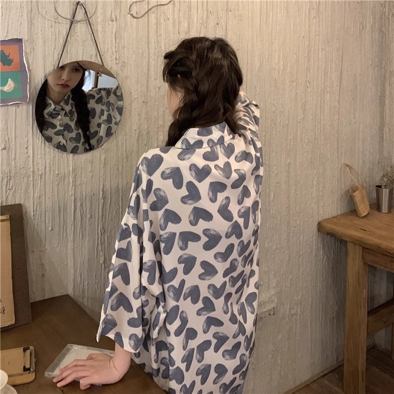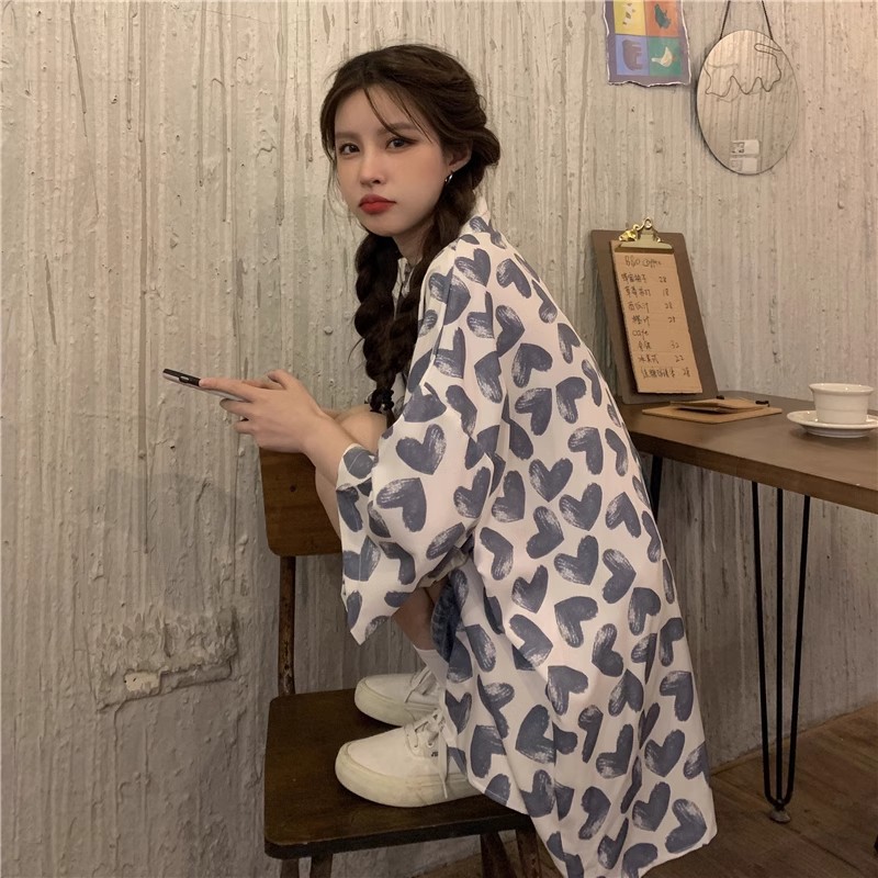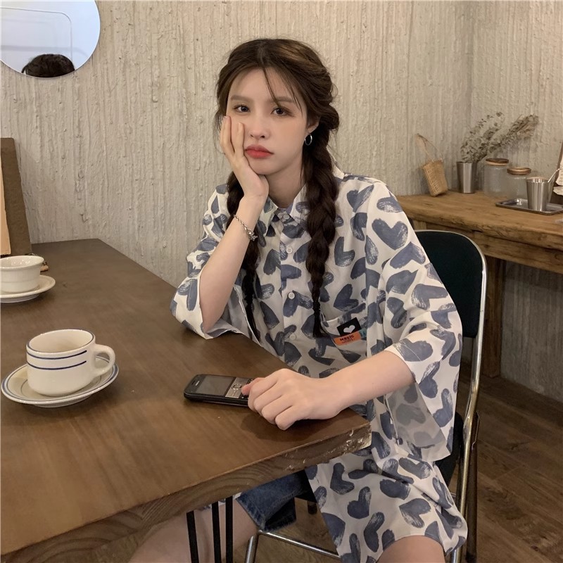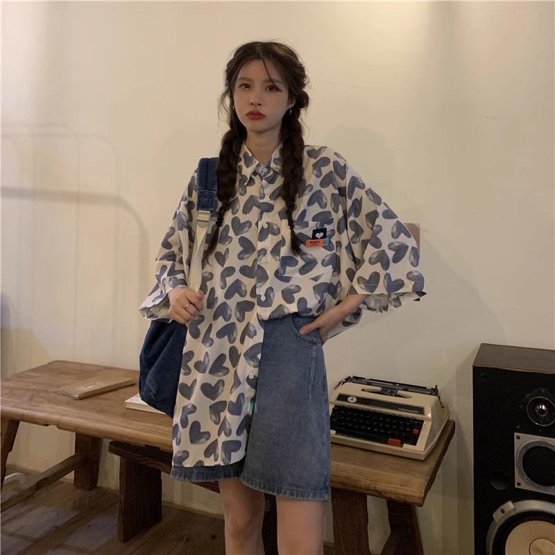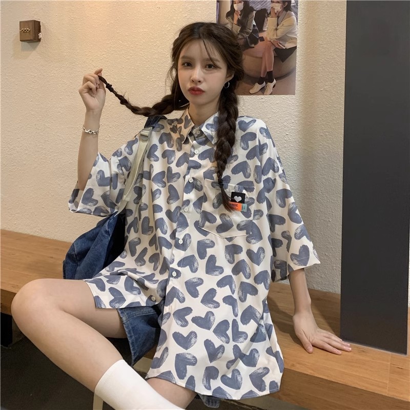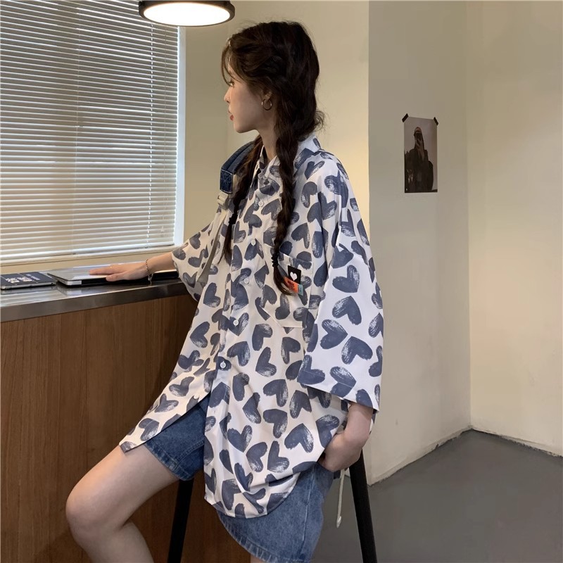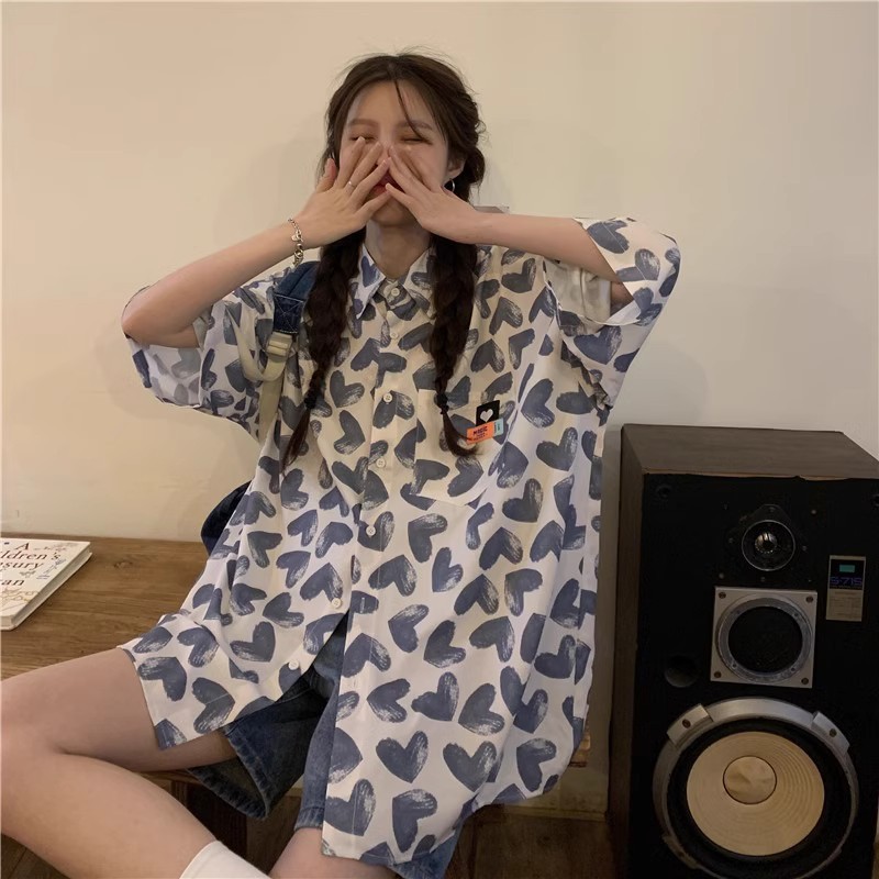 미국식 하트 반팔 셔츠 여성용 여름 만화 얇은 스타일 대학풍 루즈 디자인 독특한 셔츠 자켓 트렌디