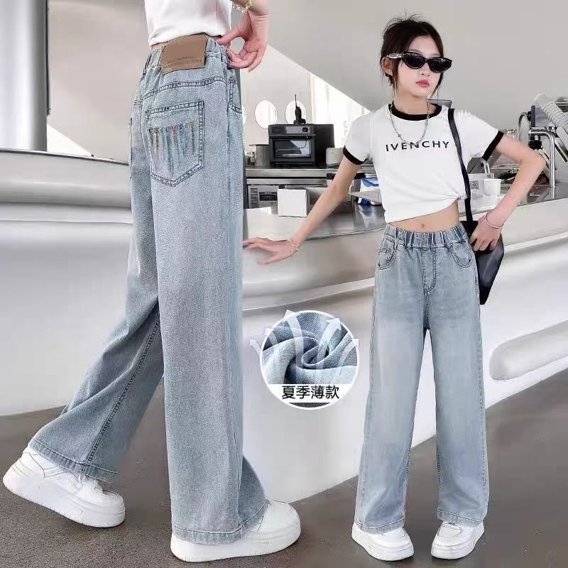소녀 데님 넓은 다리 바지 2025 새로운 소녀 봄 서양식 바지 대형 어린이 봄과 가을 유행 직선 바지