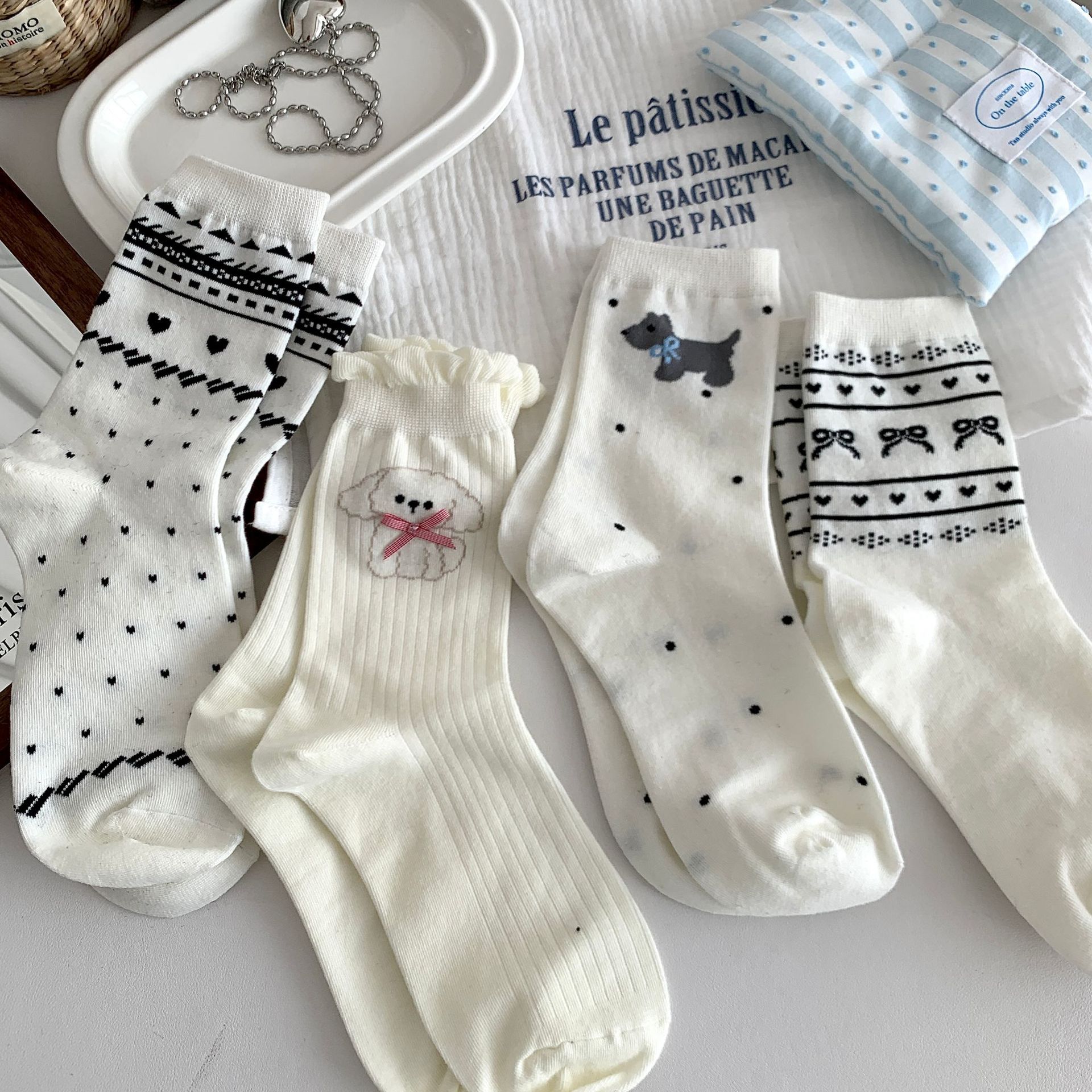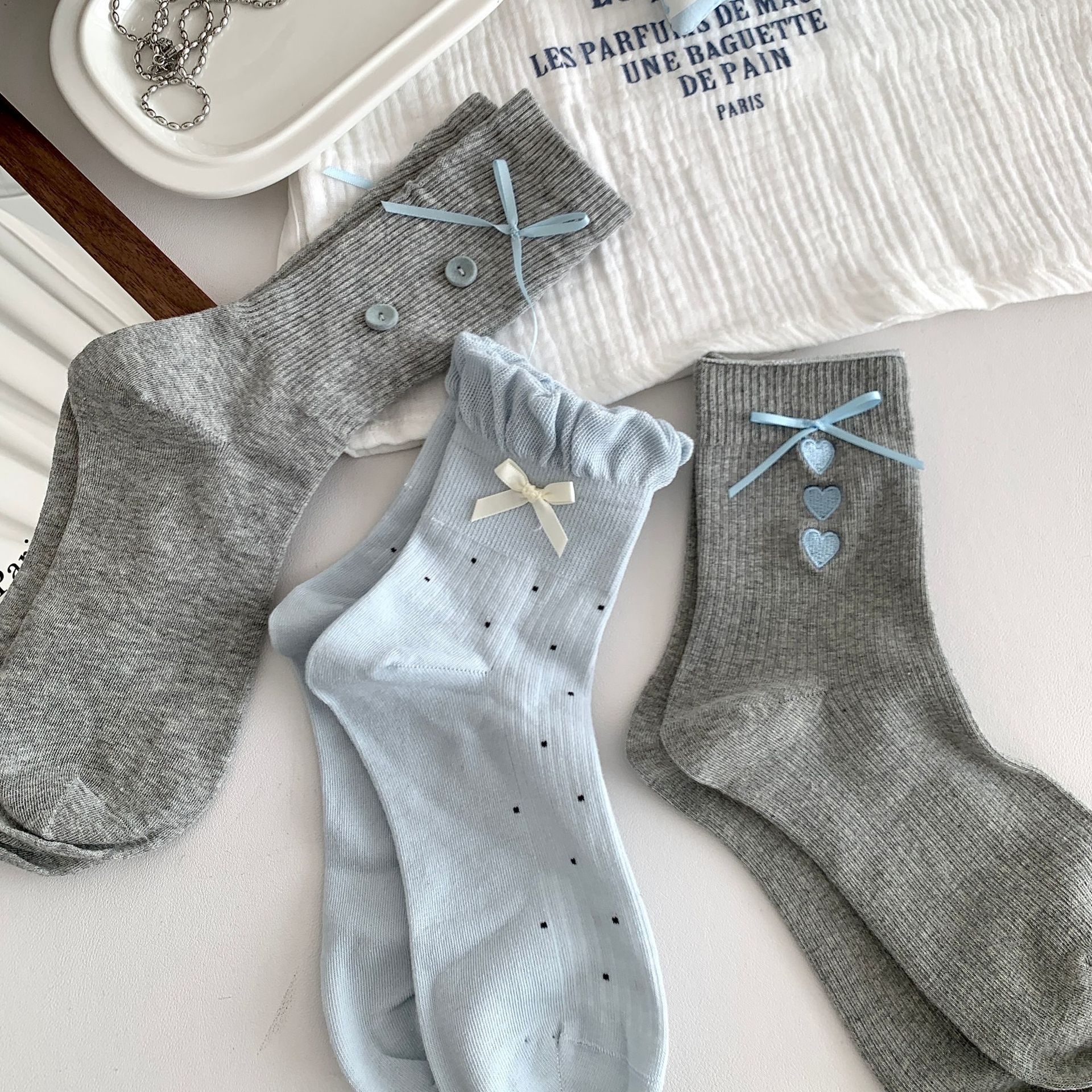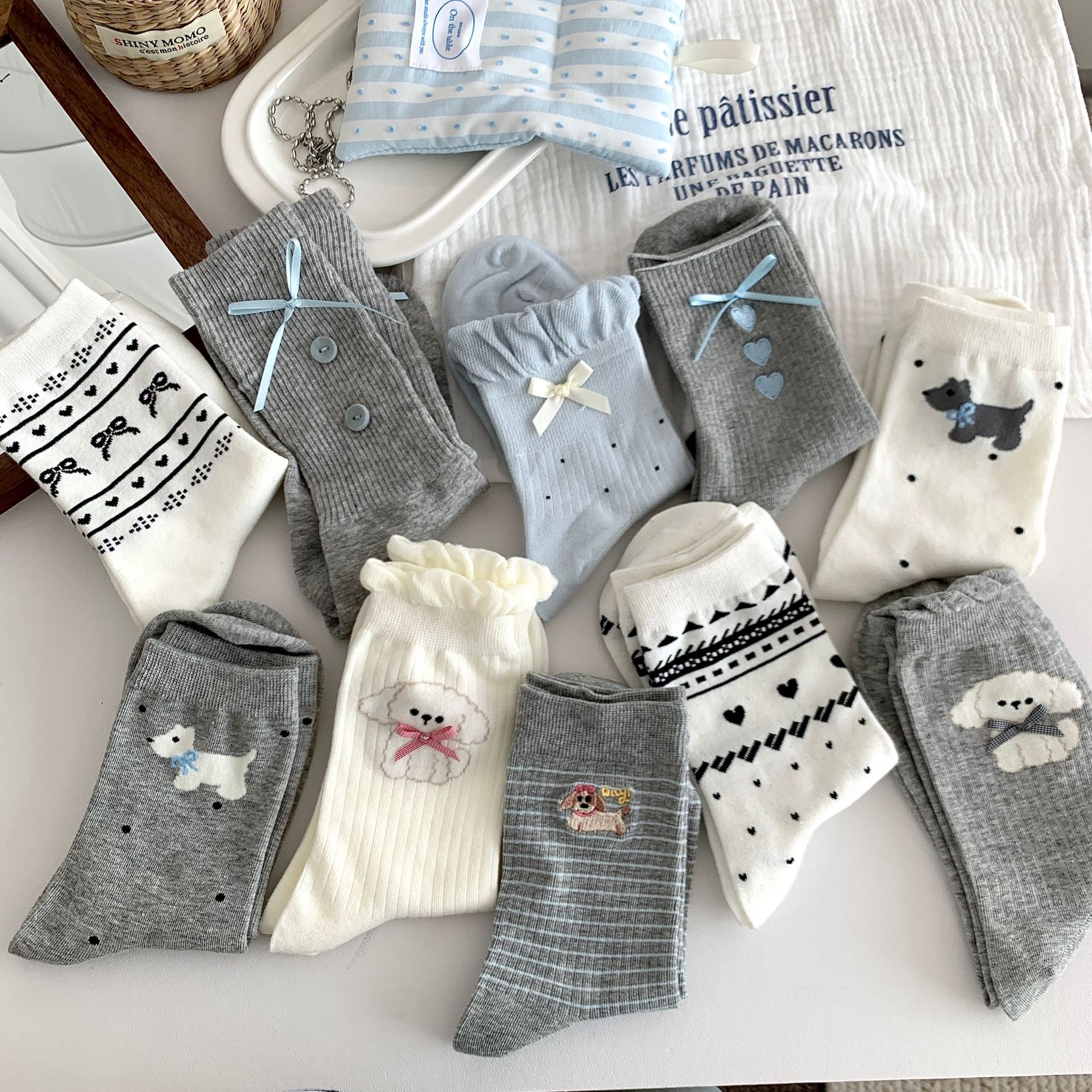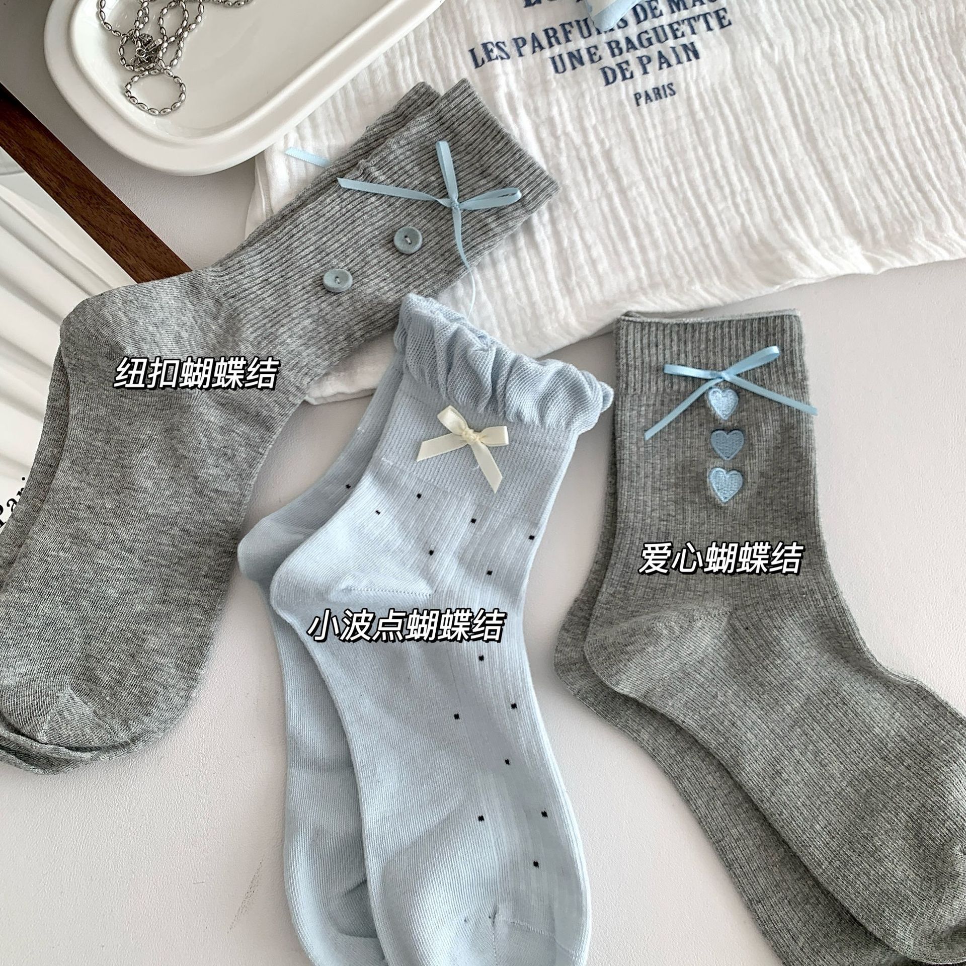 양말 여성의 봄과 여름 새로운 한국 스타일 Ins 화이트 블루와 화이트 보우 페어 아일랜드 코튼 미드 튜브 양말 얇은 통기성 스택 양말스토어 가기