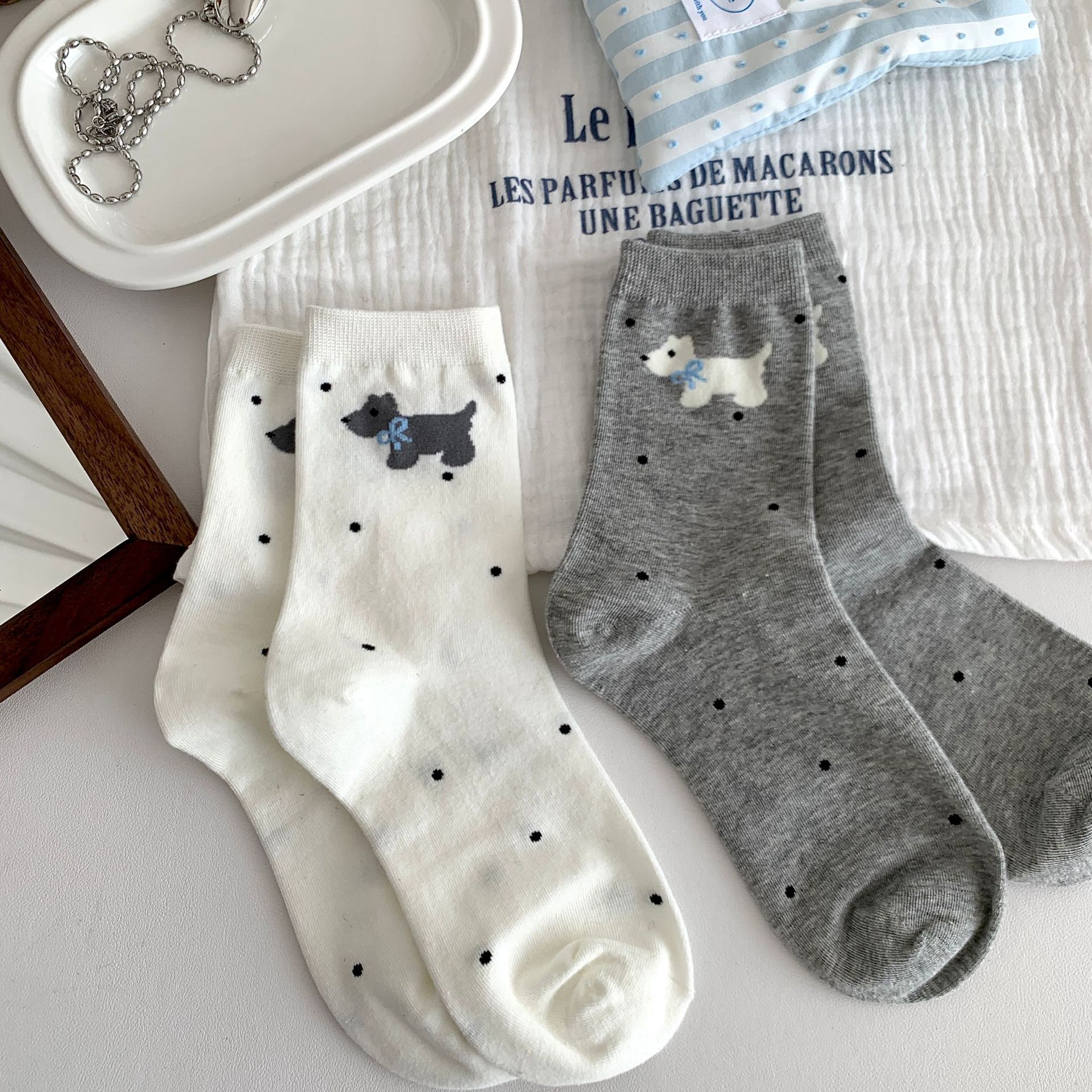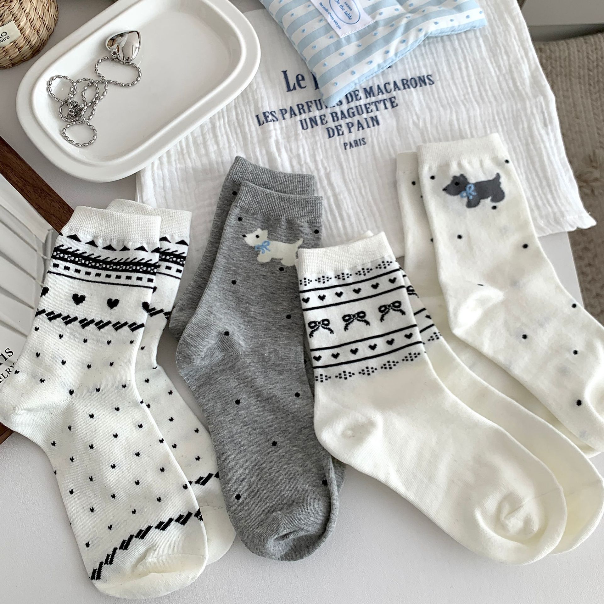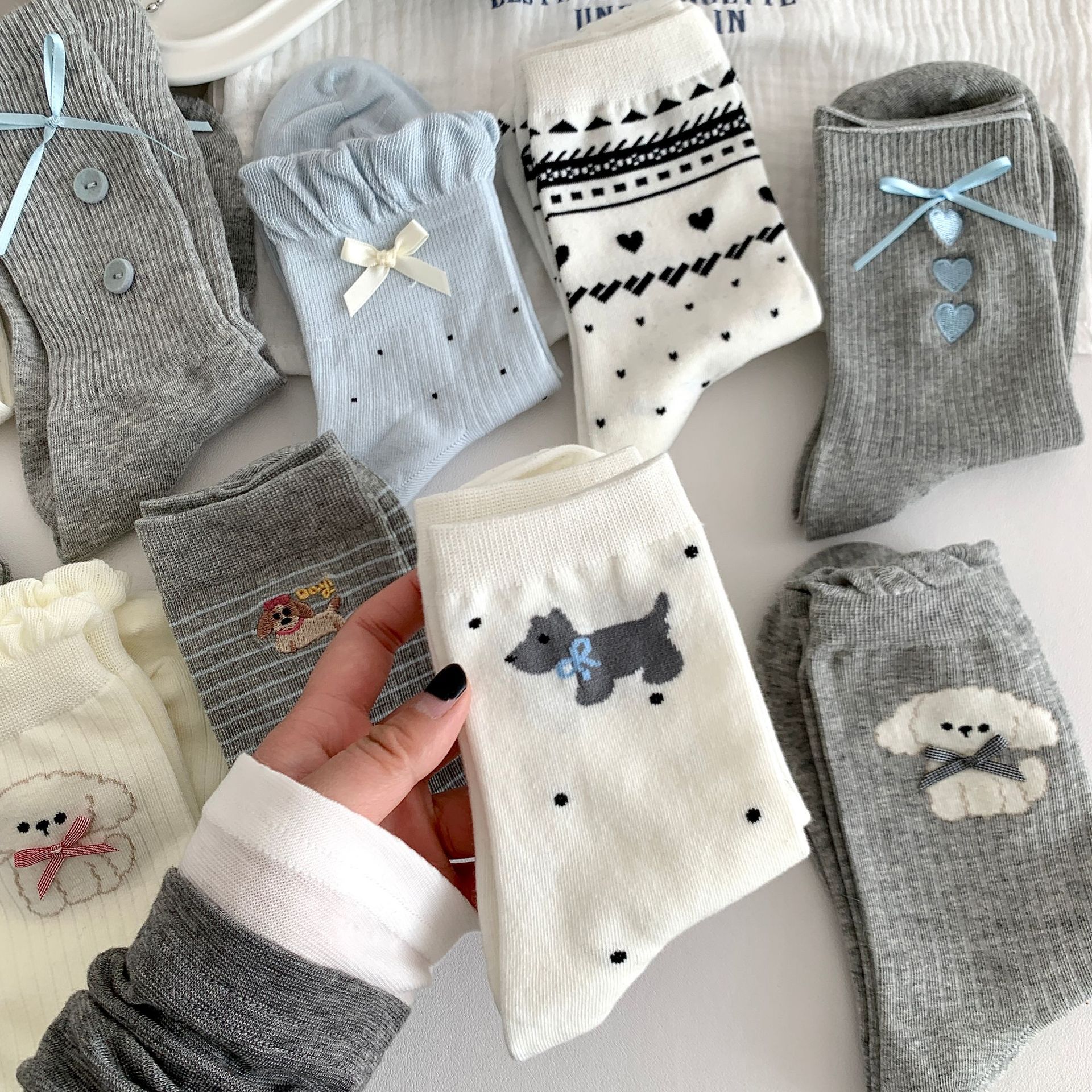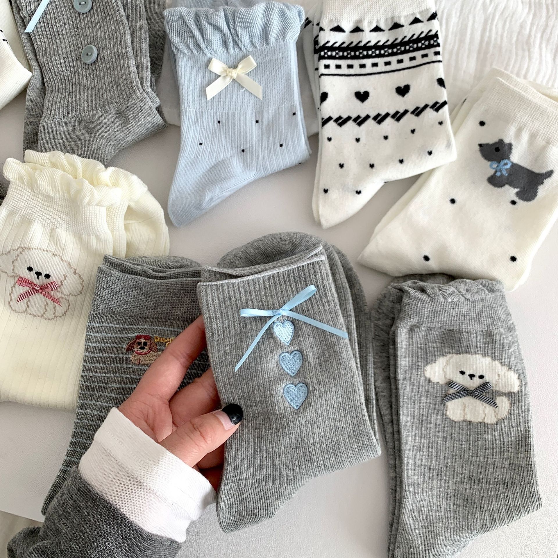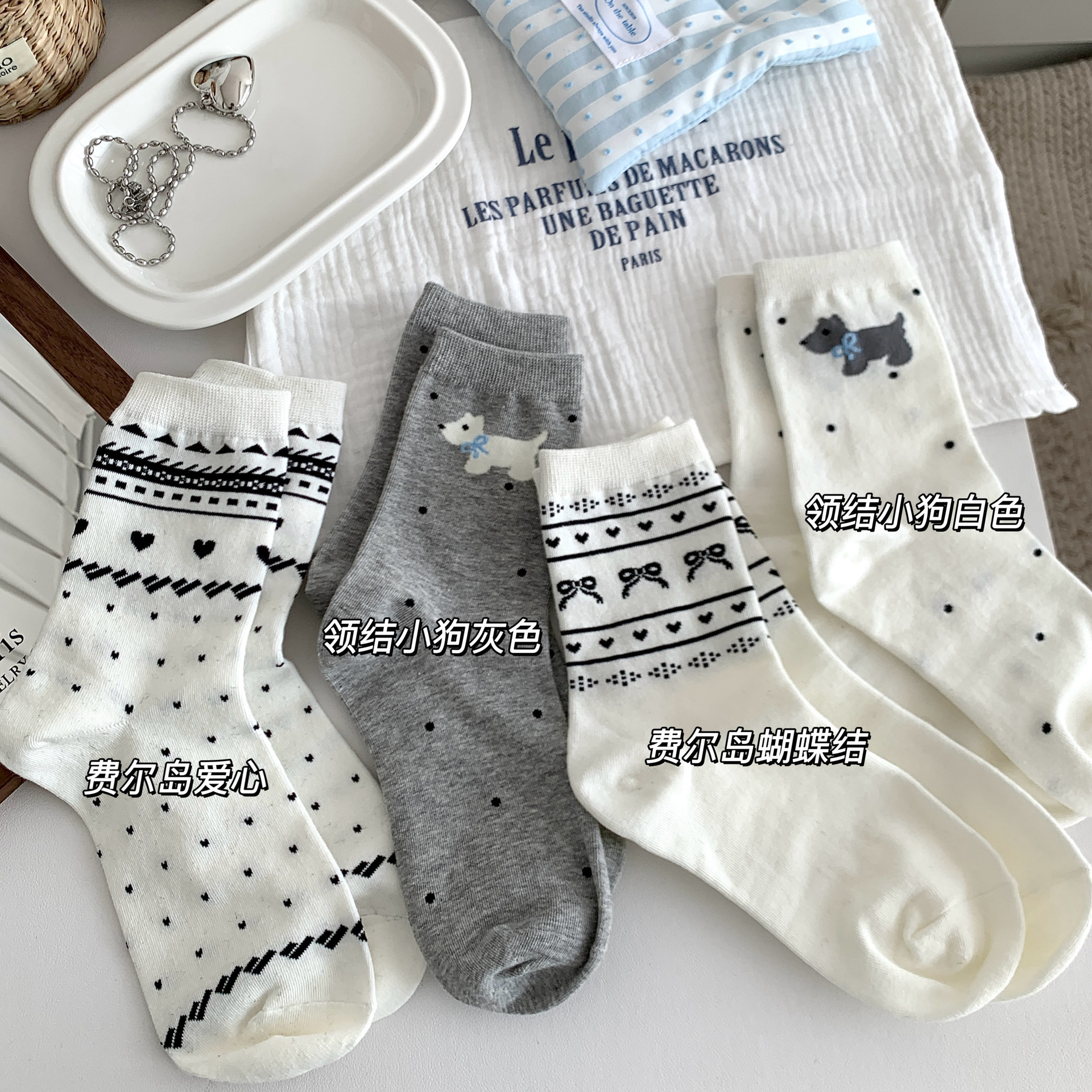 양말 여성의 봄과 여름 새로운 한국 스타일 Ins 화이트 블루와 화이트 보우 페어 아일랜드 코튼 미드 튜브 양말 얇은 통기성 스택 양말스토어 가기