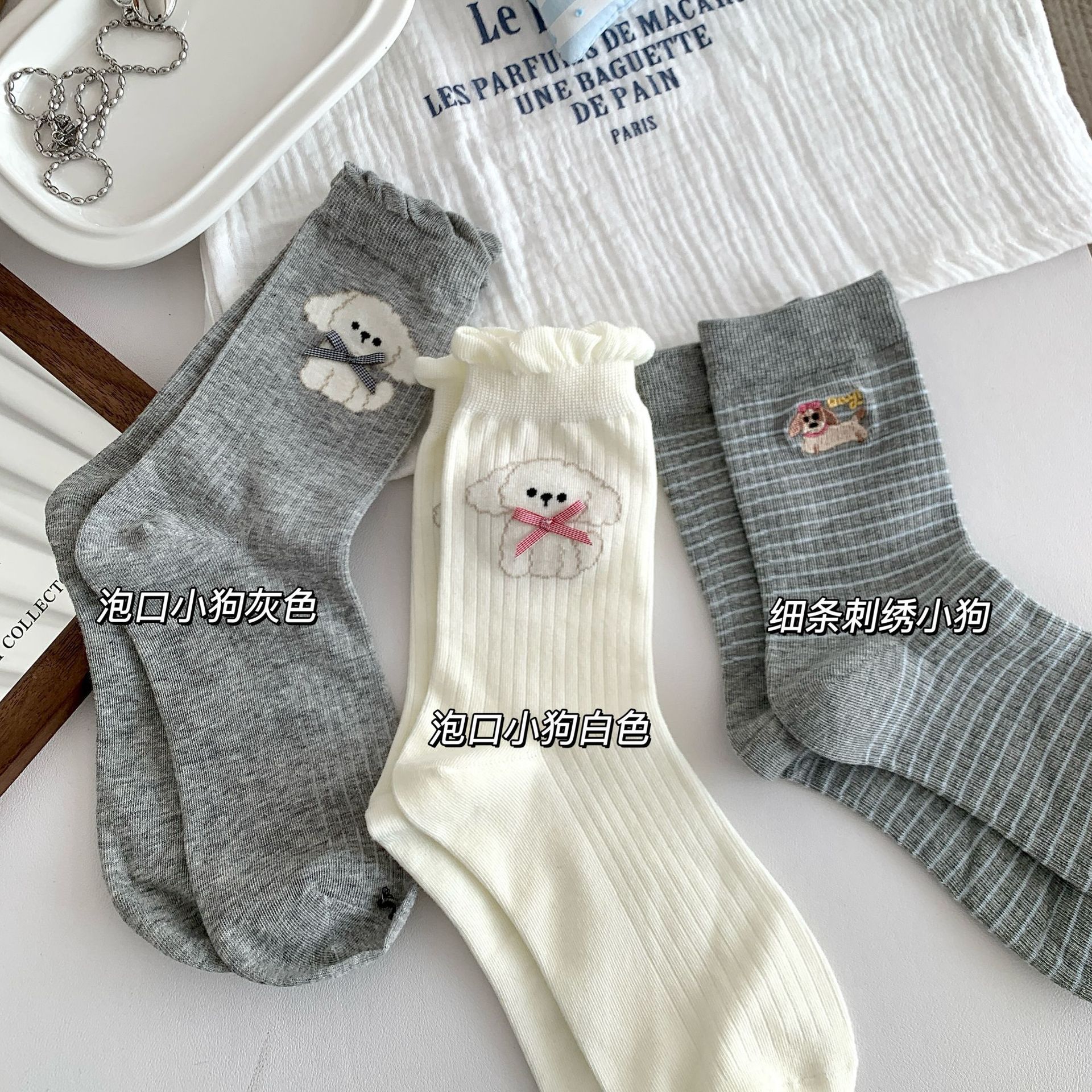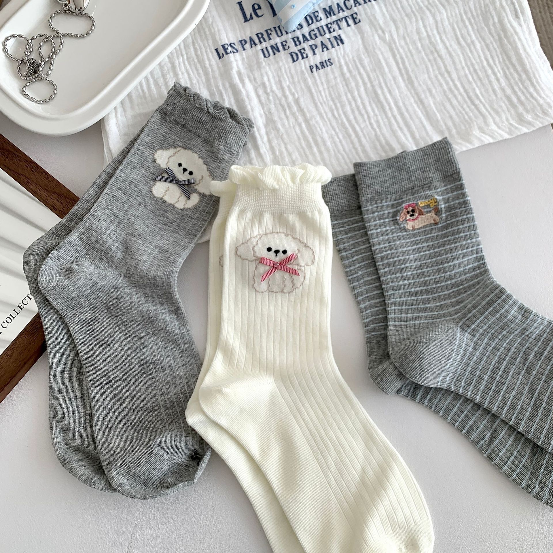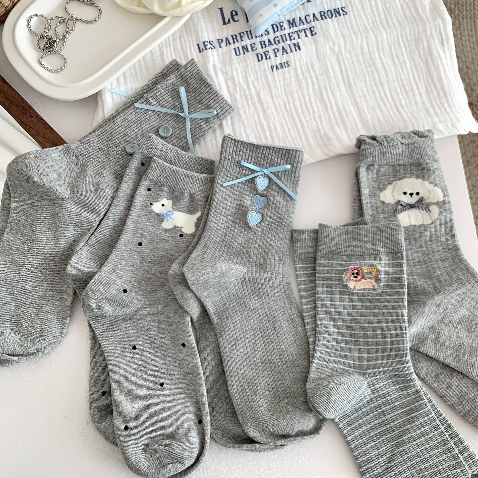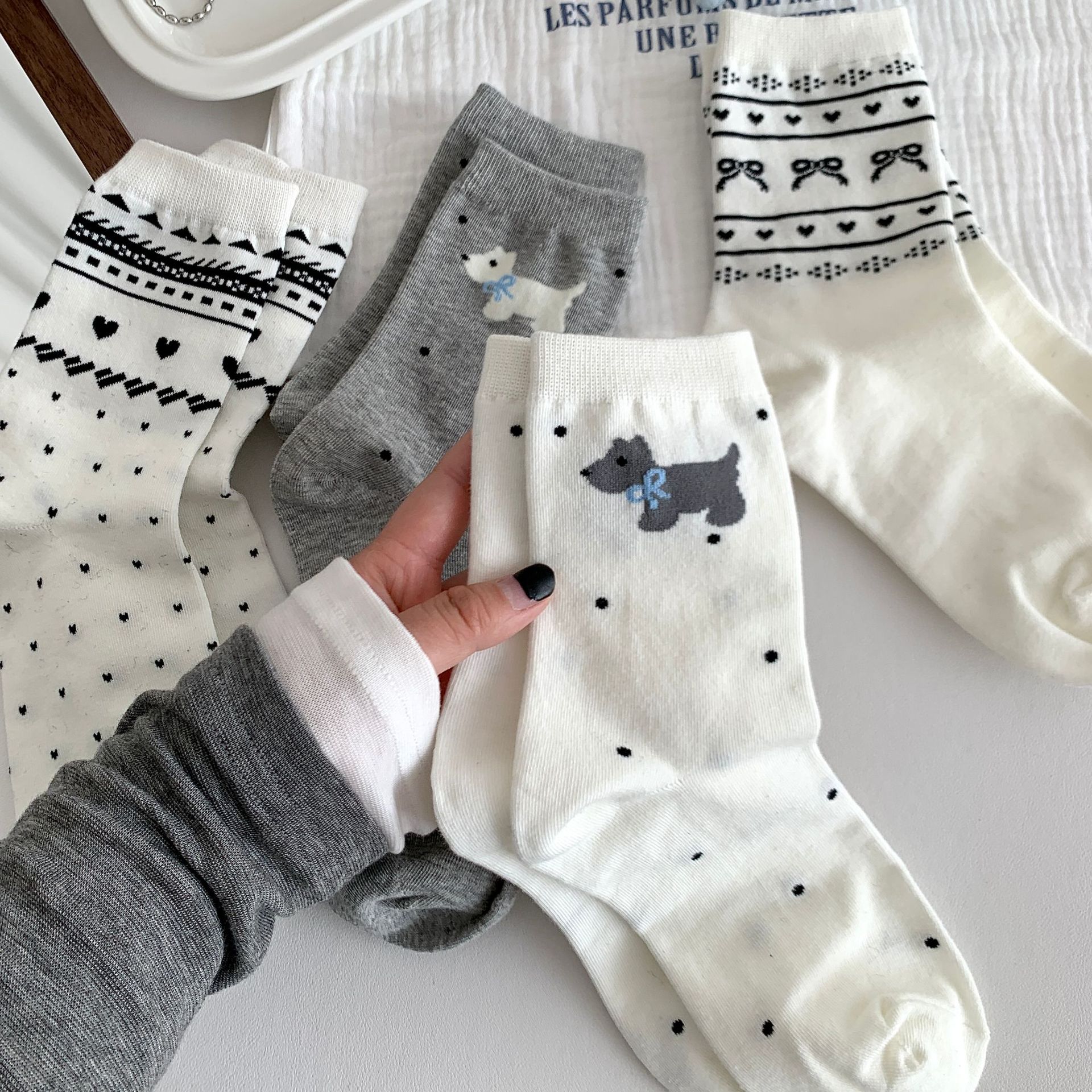 양말 여성의 봄과 여름 새로운 한국 스타일 Ins 화이트 블루와 화이트 보우 페어 아일랜드 코튼 미드 튜브 양말 얇은 통기성 스택 양말스토어 가기