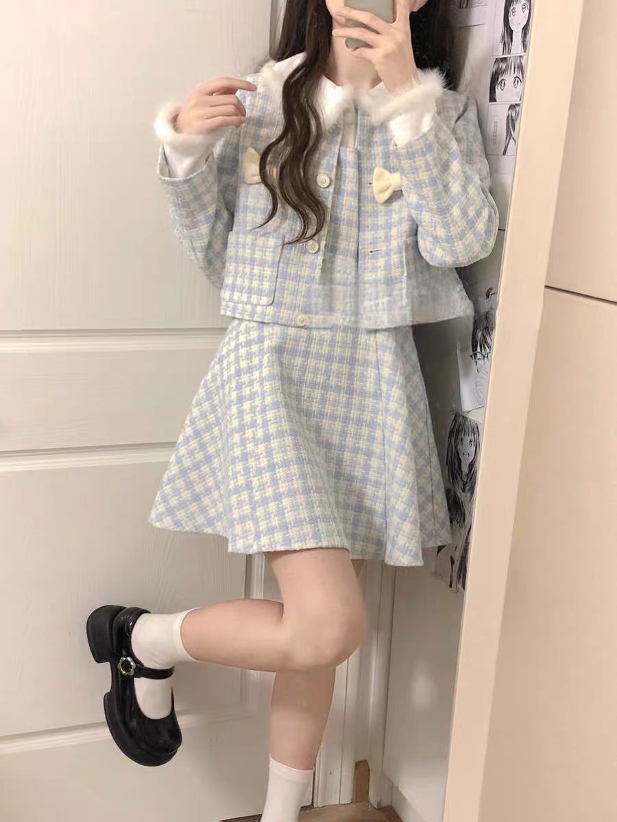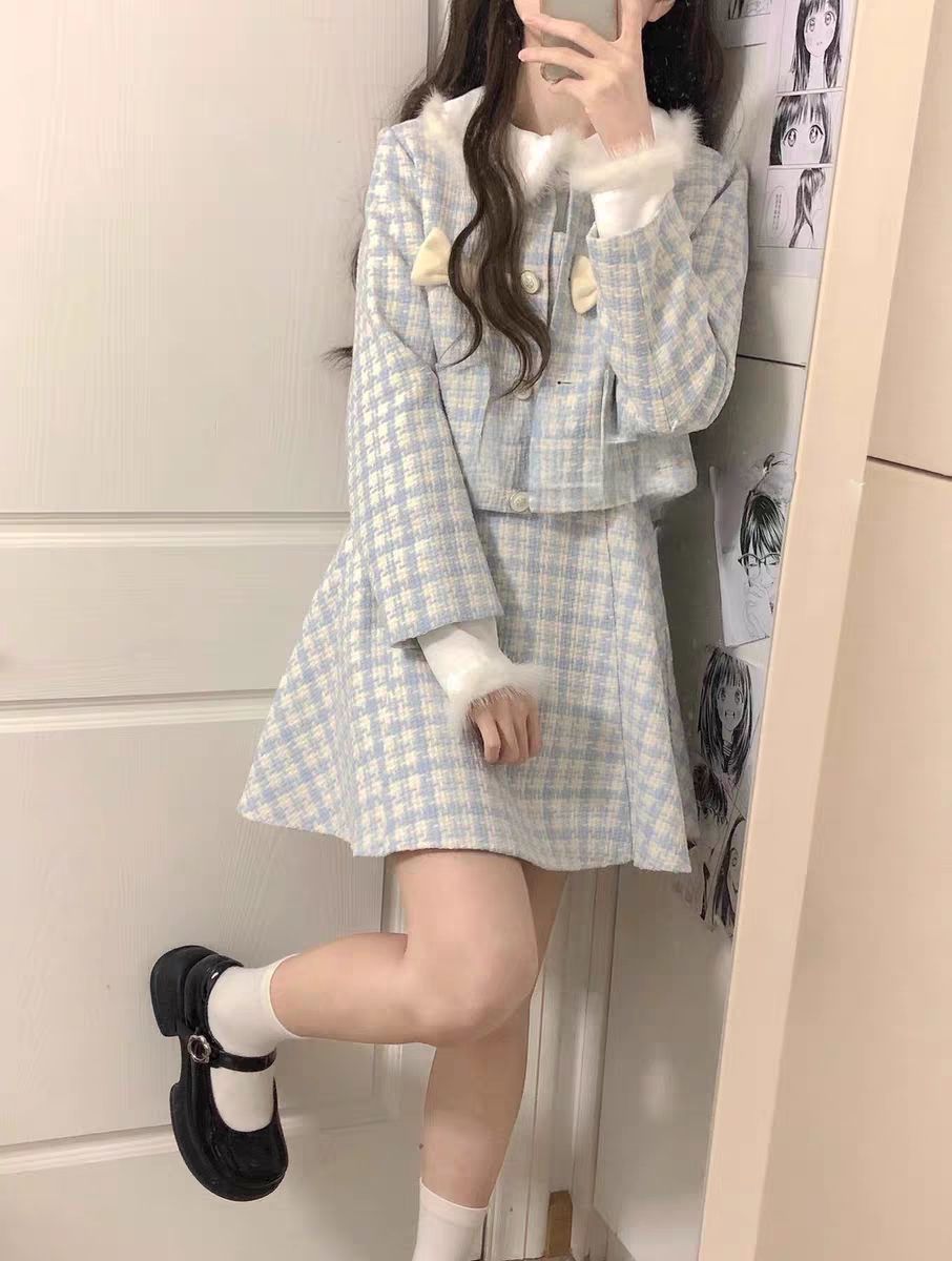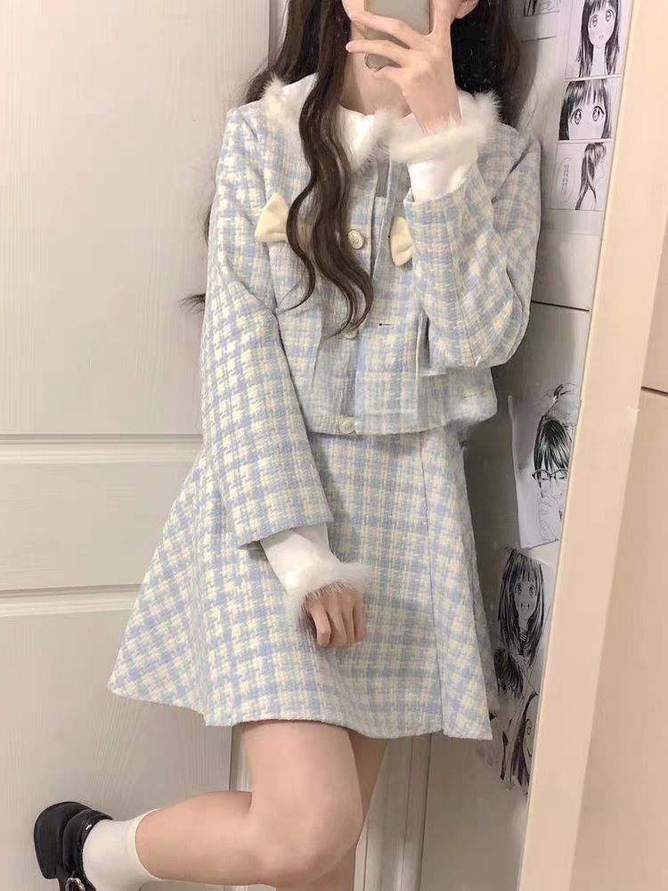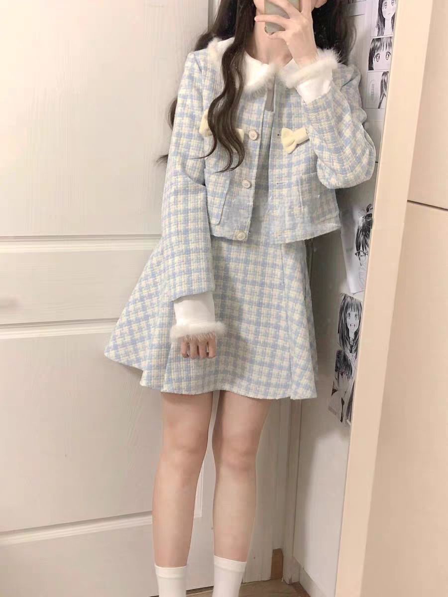 작은 샤넬 스타일 우아한 착용 3 조각 세트 여성 봉제 인형 칼라 탑 격자 무늬 카디건스토어 가기