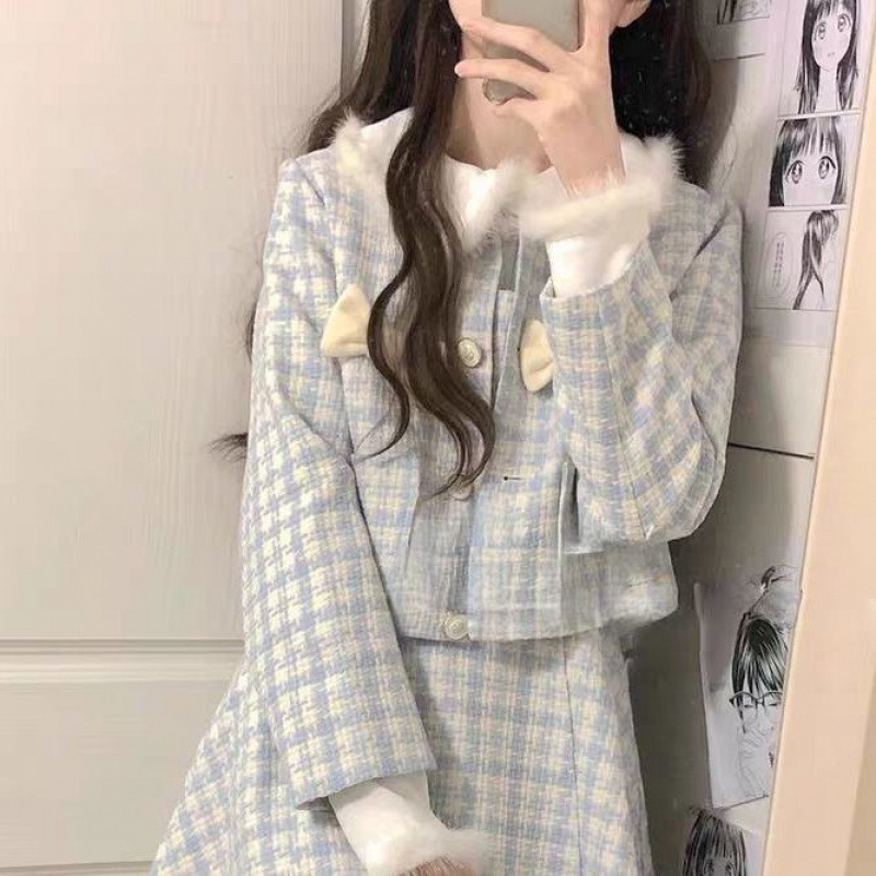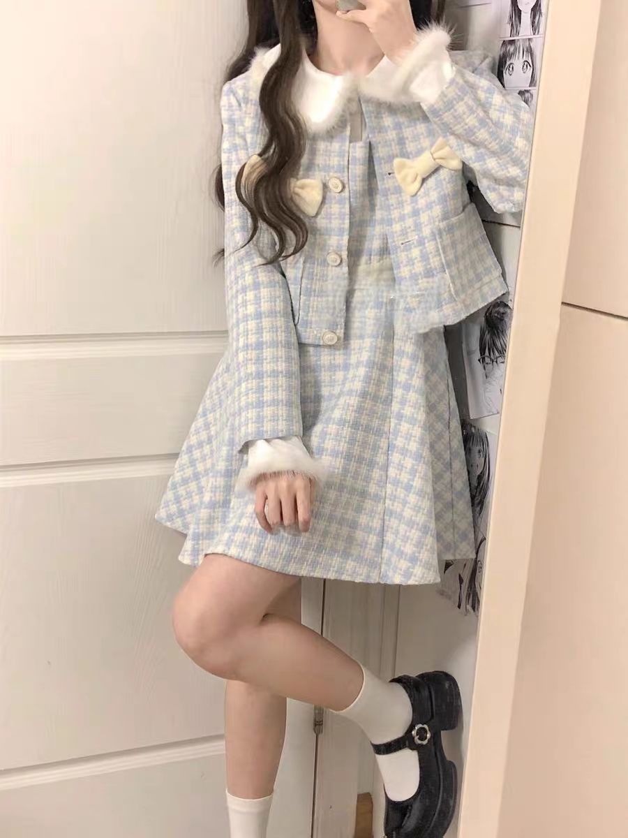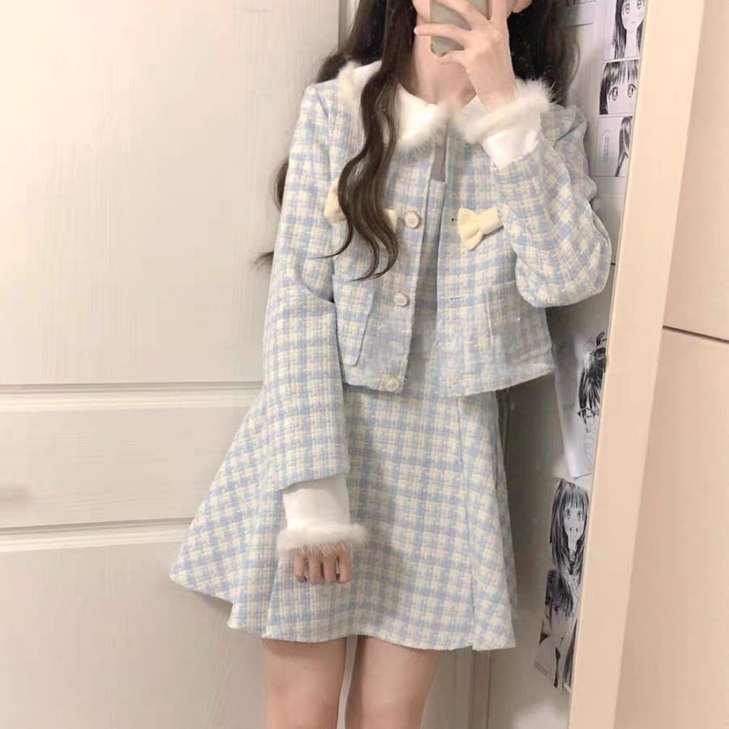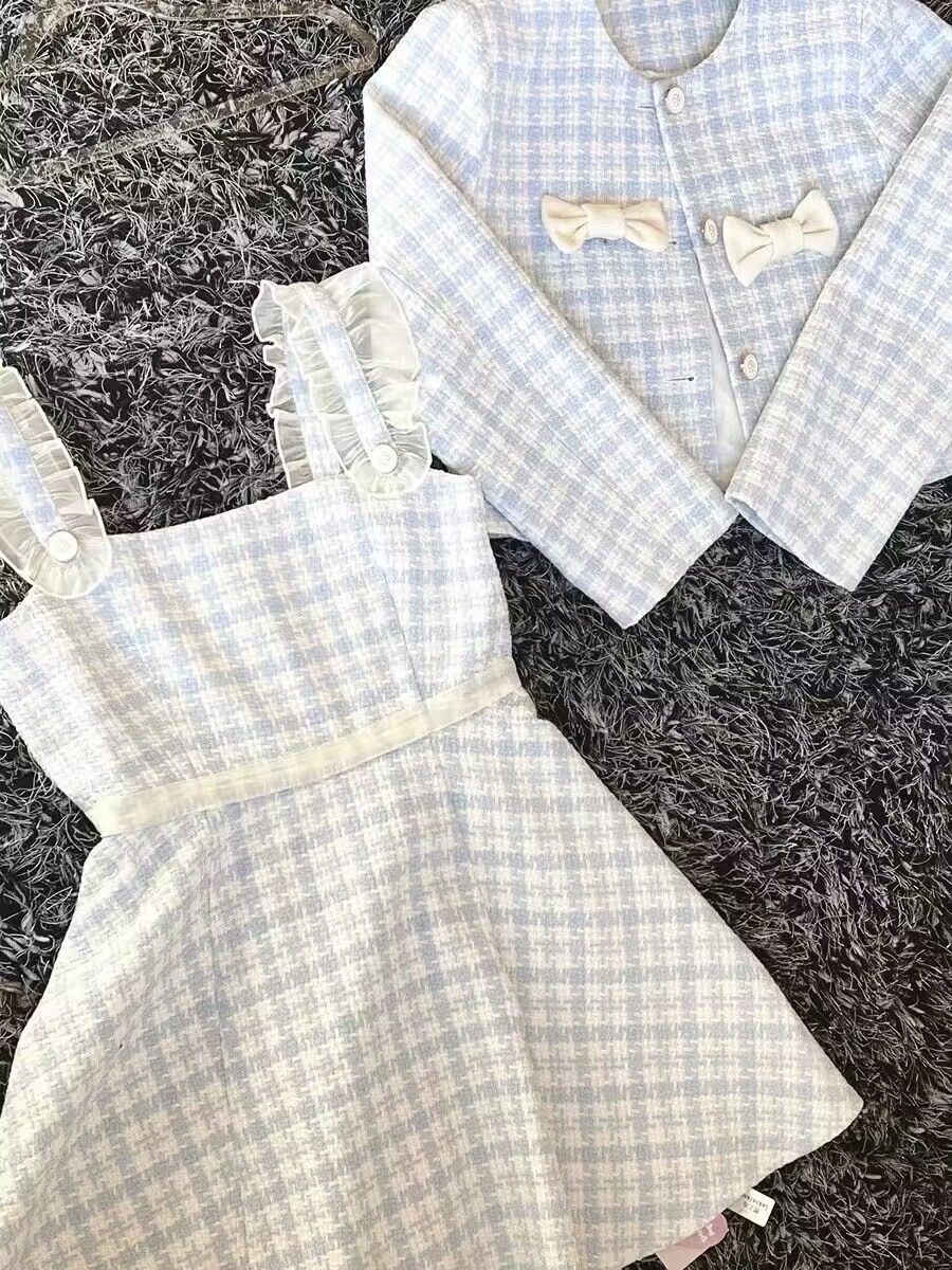 작은 샤넬 스타일 우아한 착용 3 조각 세트 여성 봉제 인형 칼라 탑 격자 무늬 카디건스토어 가기
