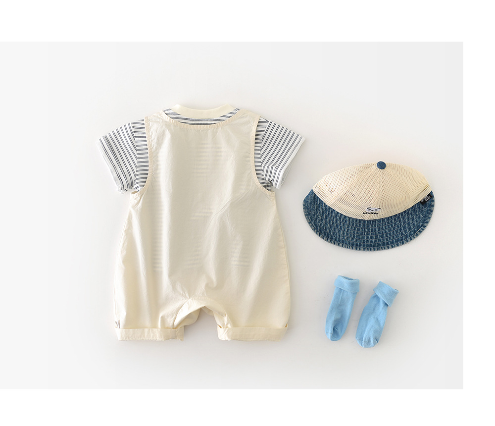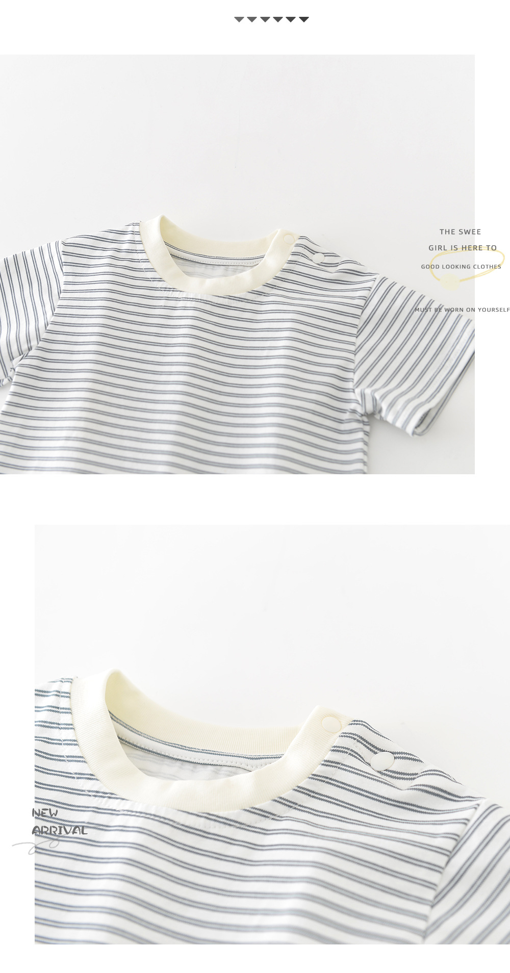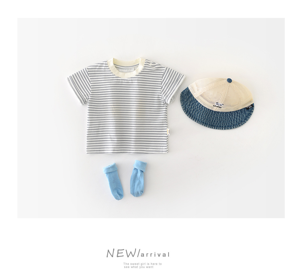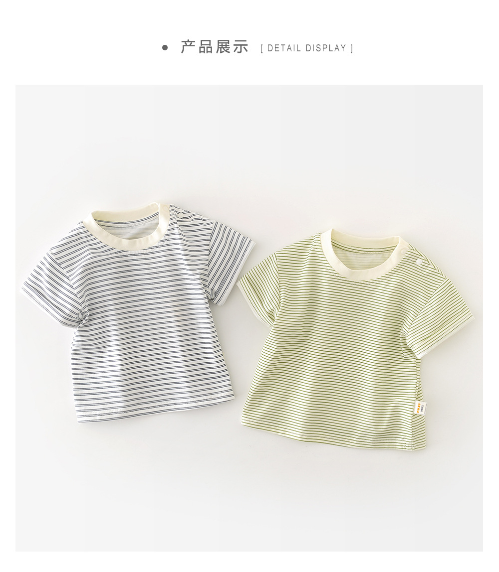 Yueji 2025 새로운 여름 스타일 아동용 스트라이프 반팔 티셔츠 한국 스타일 유아 및 어린이 라운드 넥 오픈 숄더 탑 52162스토어 가기