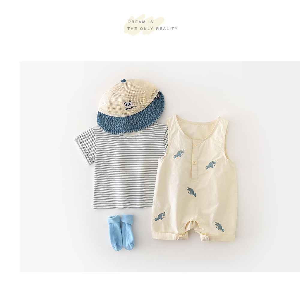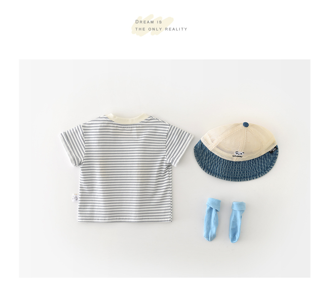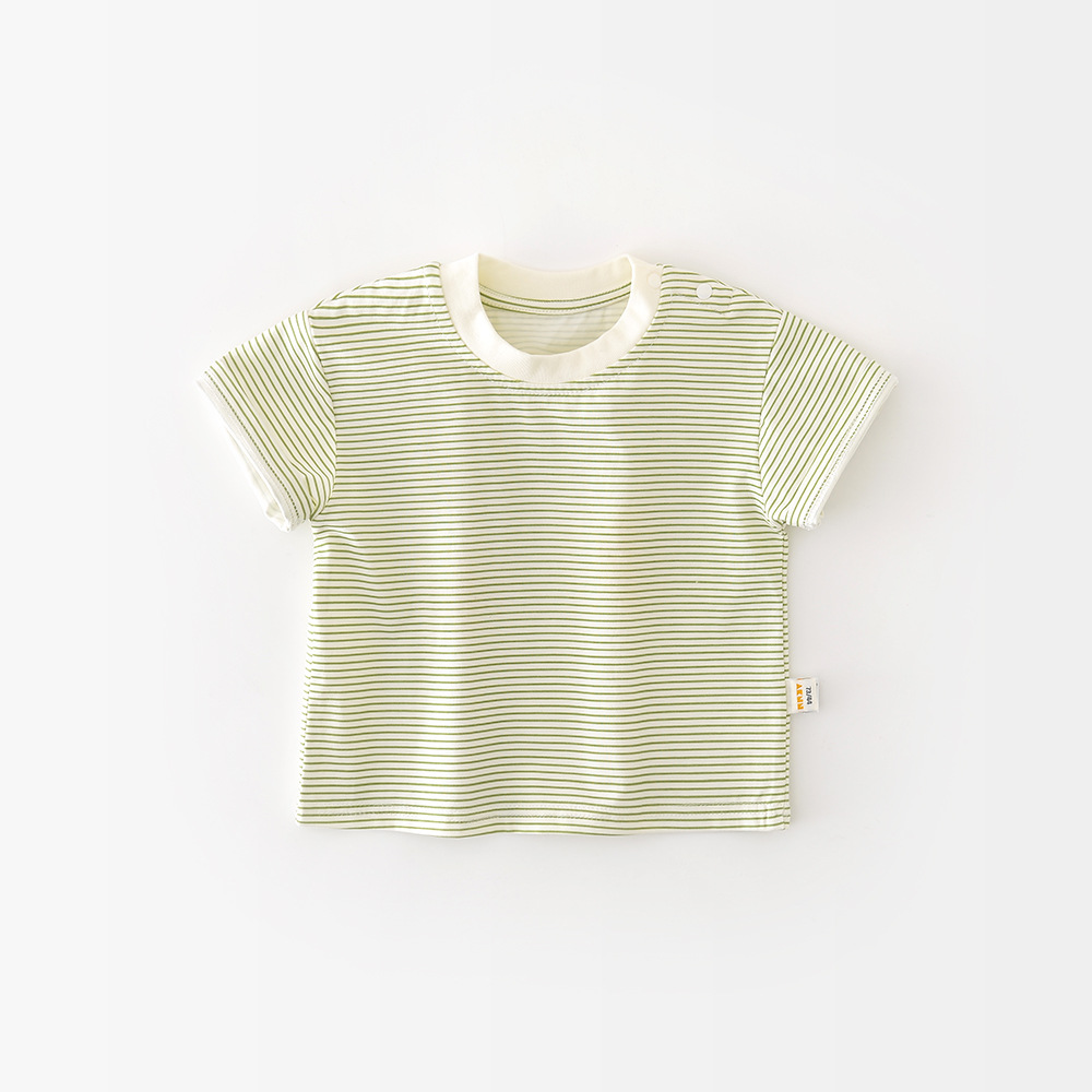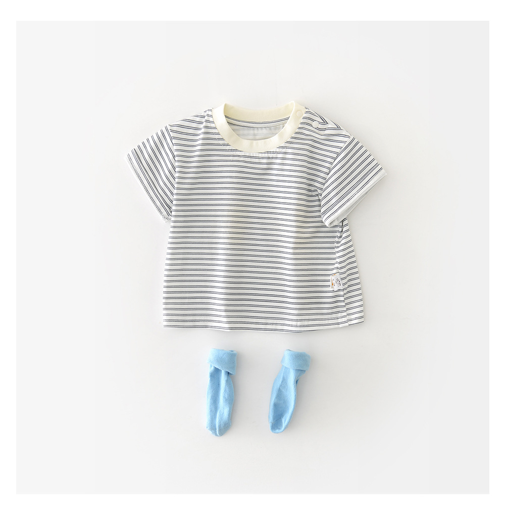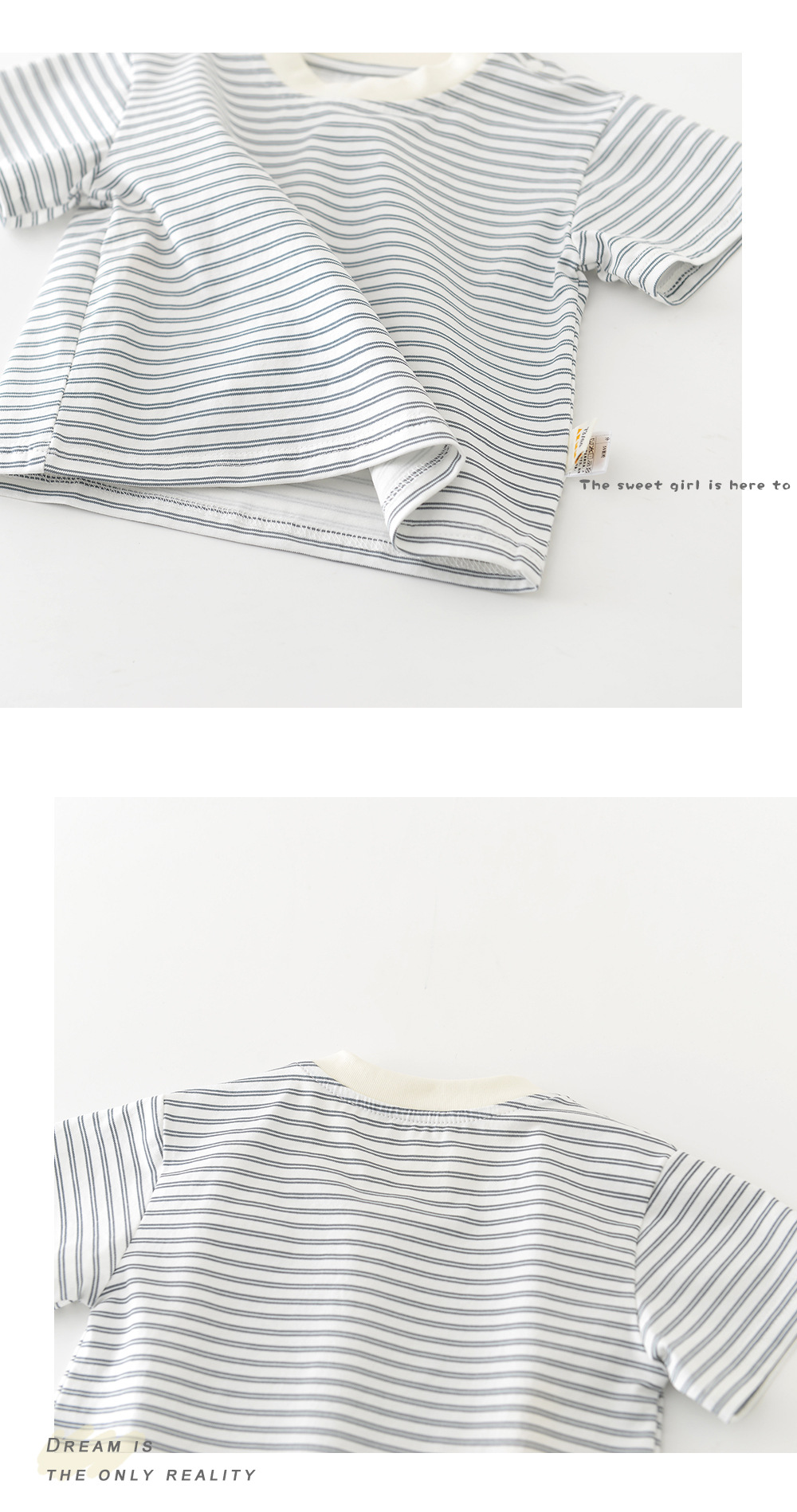 Yueji 2025 새로운 여름 스타일 아동용 스트라이프 반팔 티셔츠 한국 스타일 유아 및 어린이 라운드 넥 오픈 숄더 탑 52162