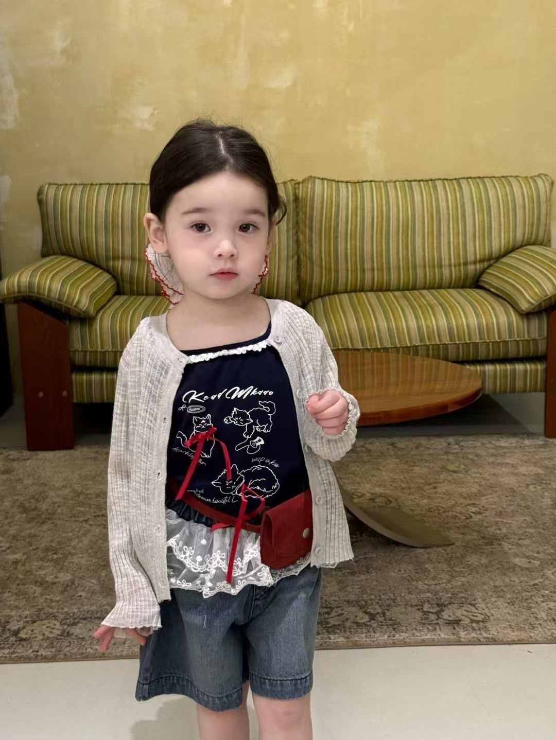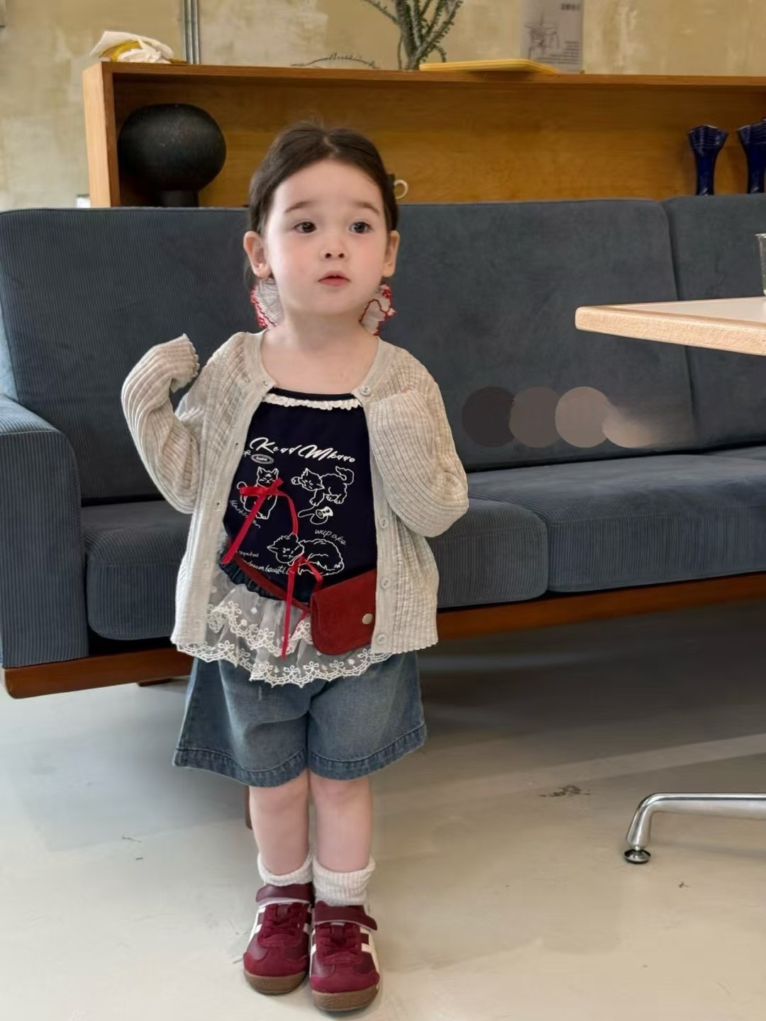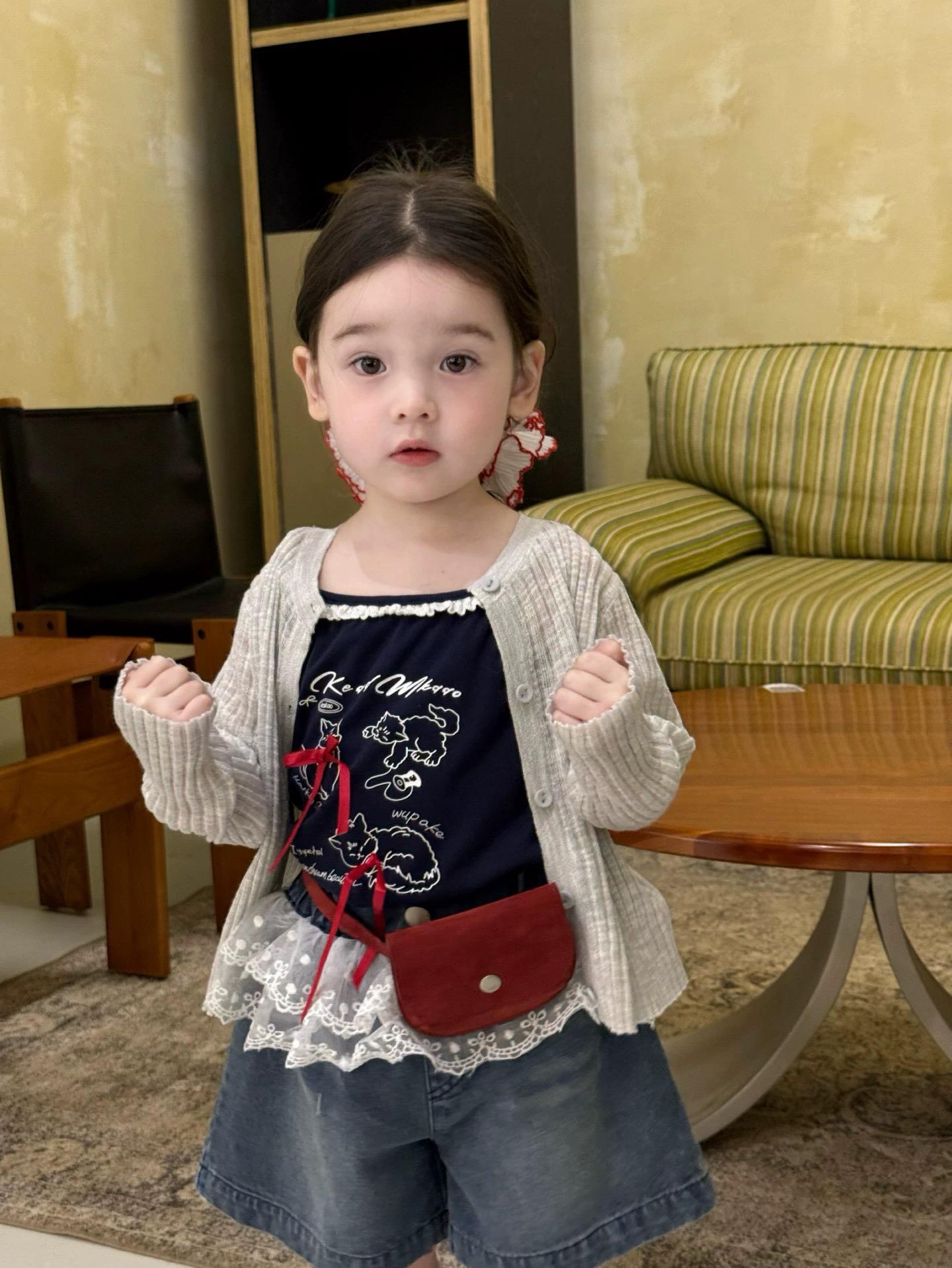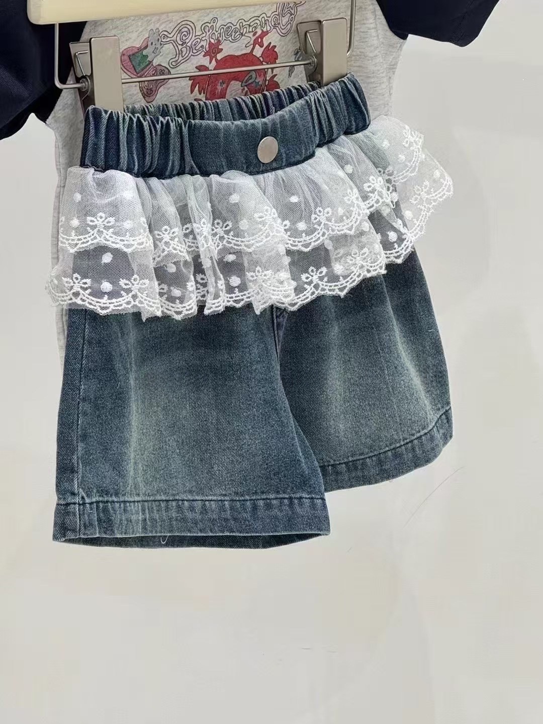 여자 2025 여름 새 스타일 서스펜더 레이스 조끼 아기 소녀 스타일 로리 귀여운 데님 스플 라이스 반바지스토어 가기