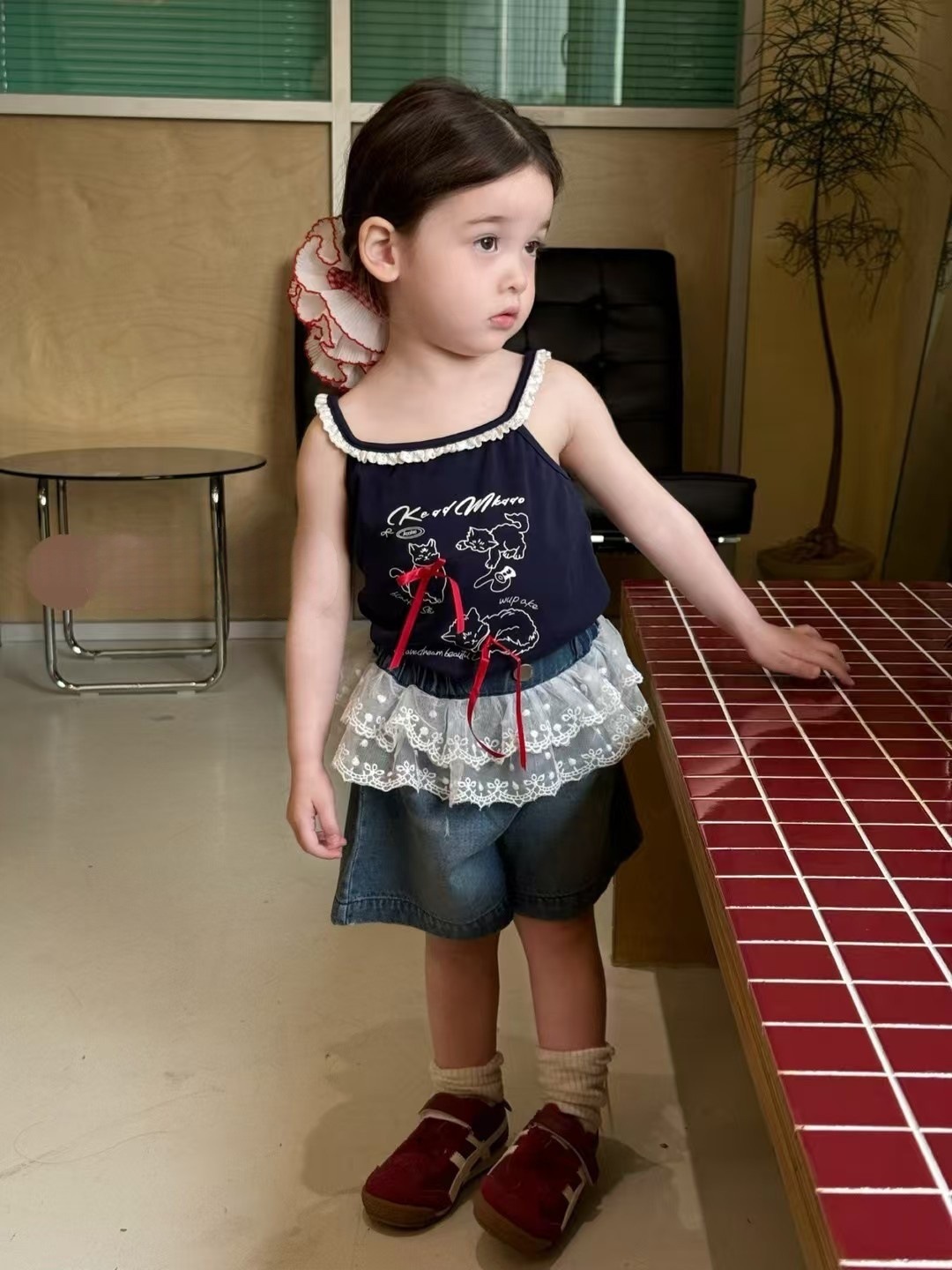 여자 2025 여름 새 스타일 서스펜더 레이스 조끼 아기 소녀 스타일 로리 귀여운 데님 스플 라이스 반바지