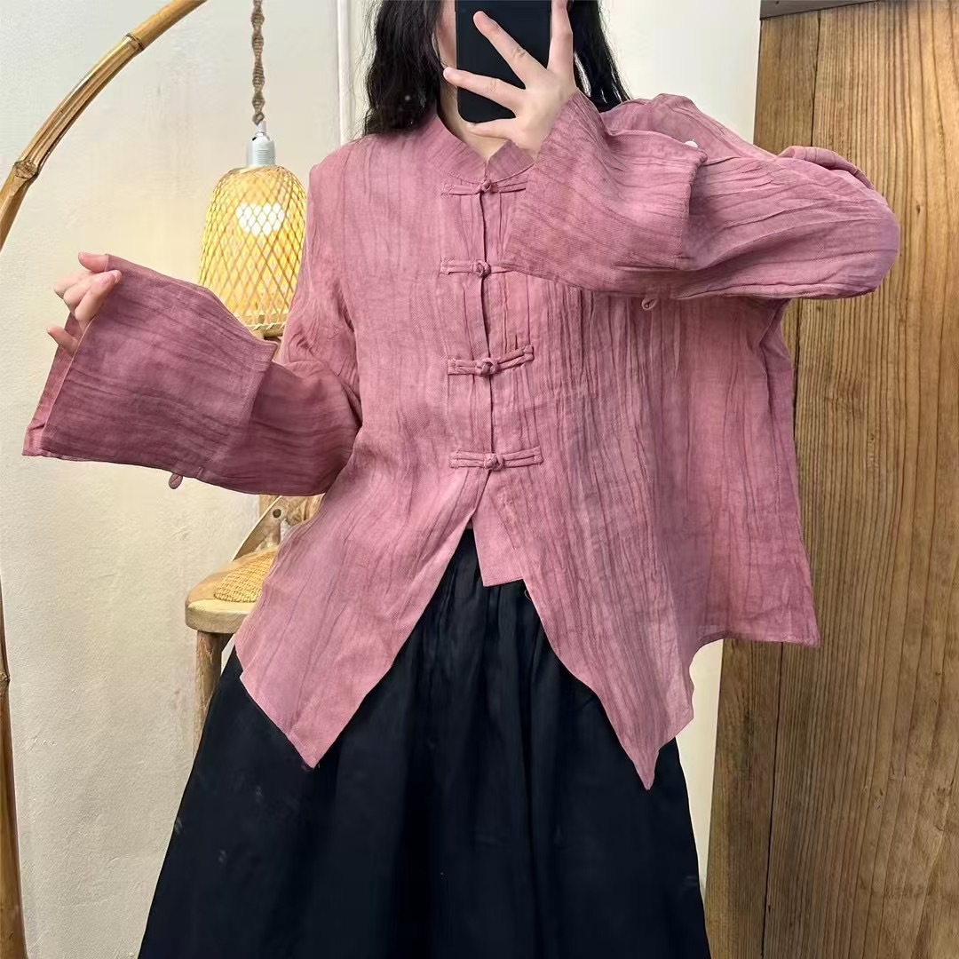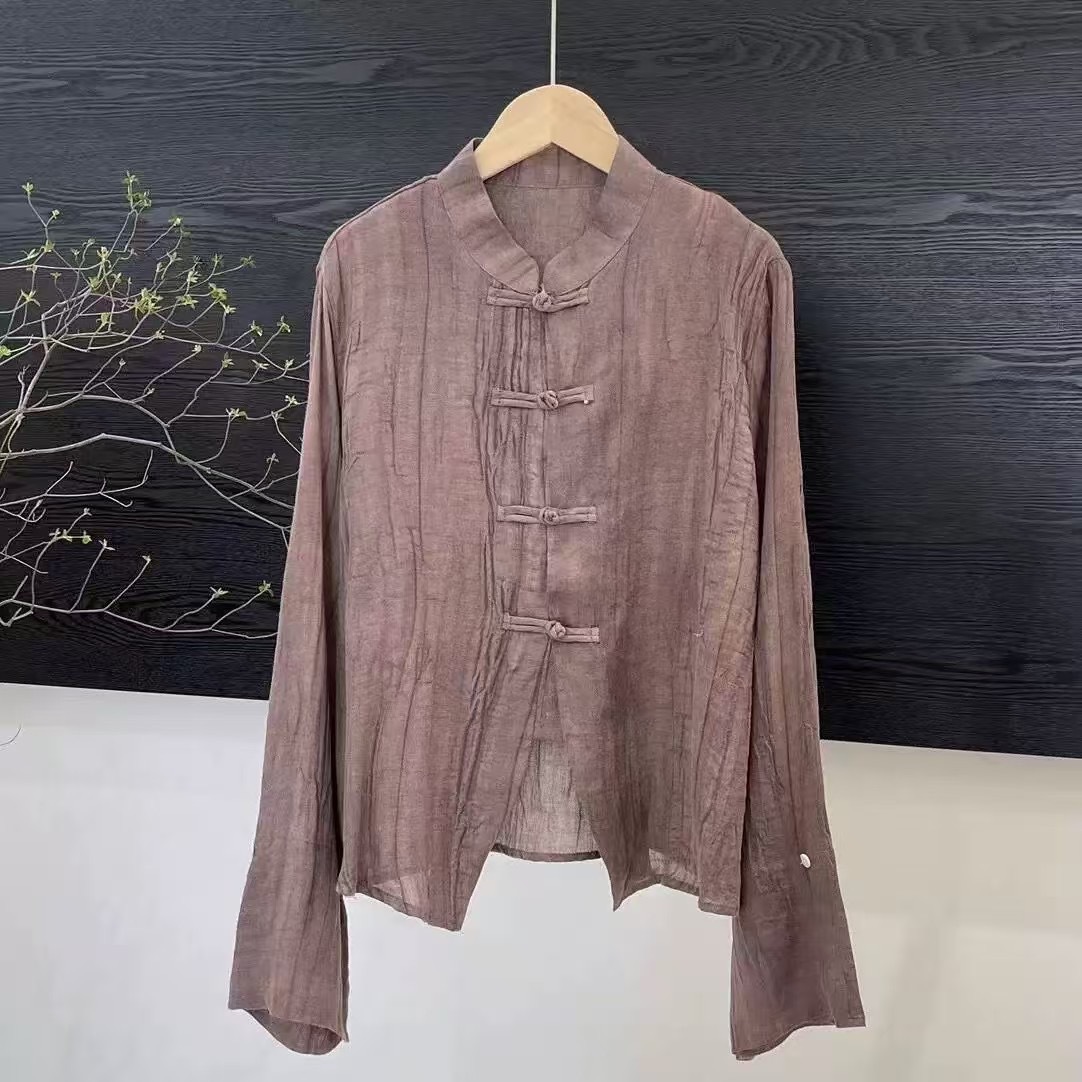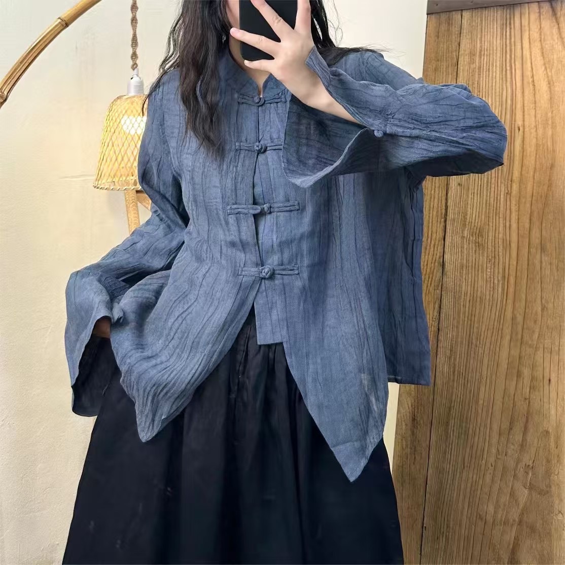 라미 타이 염색 긴팔 느슨한 얇은 예술적 복고풍 스타일 여성 틈새 스탠드 칼라 버튼 봄 새 셔츠스토어 가기