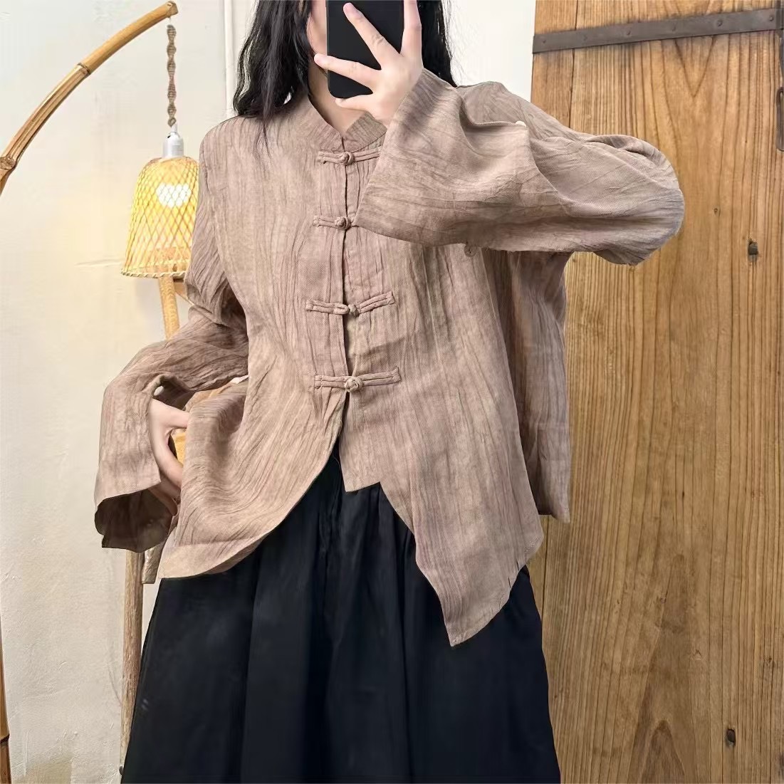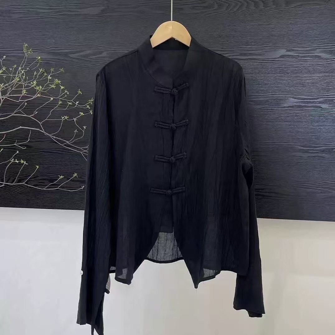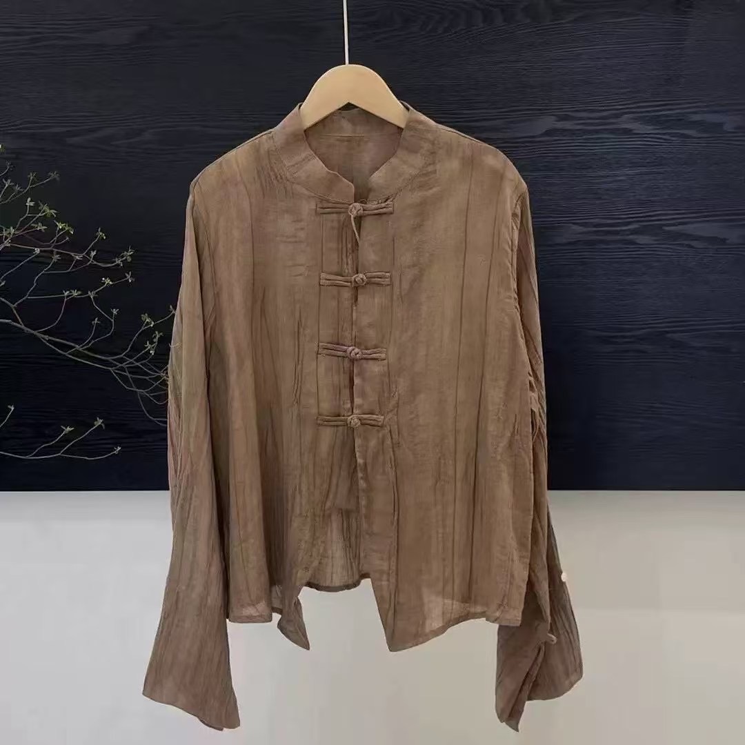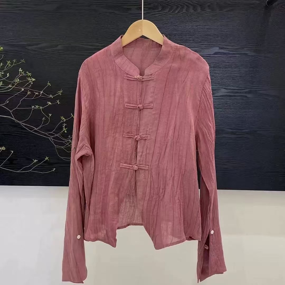 라미 타이 염색 긴팔 느슨한 얇은 예술적 복고풍 스타일 여성 틈새 스탠드 칼라 버튼 봄 새 셔츠스토어 가기