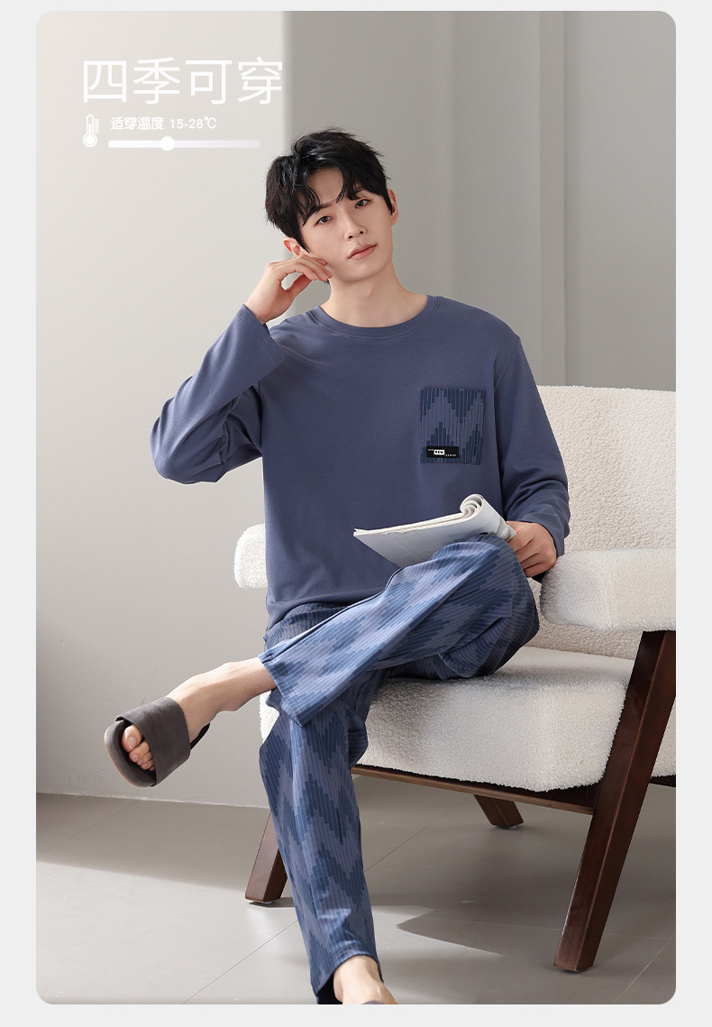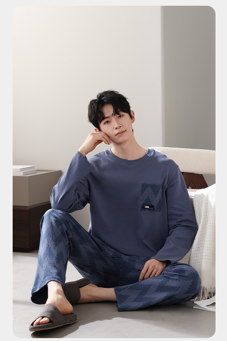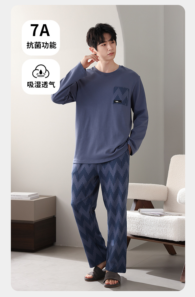 잠옷 남자의 봄과 가을 순면 단색 긴 소매 간단한 패션 남자의 사계절 플러스 사이즈 면 홈 옷스토어 가기
