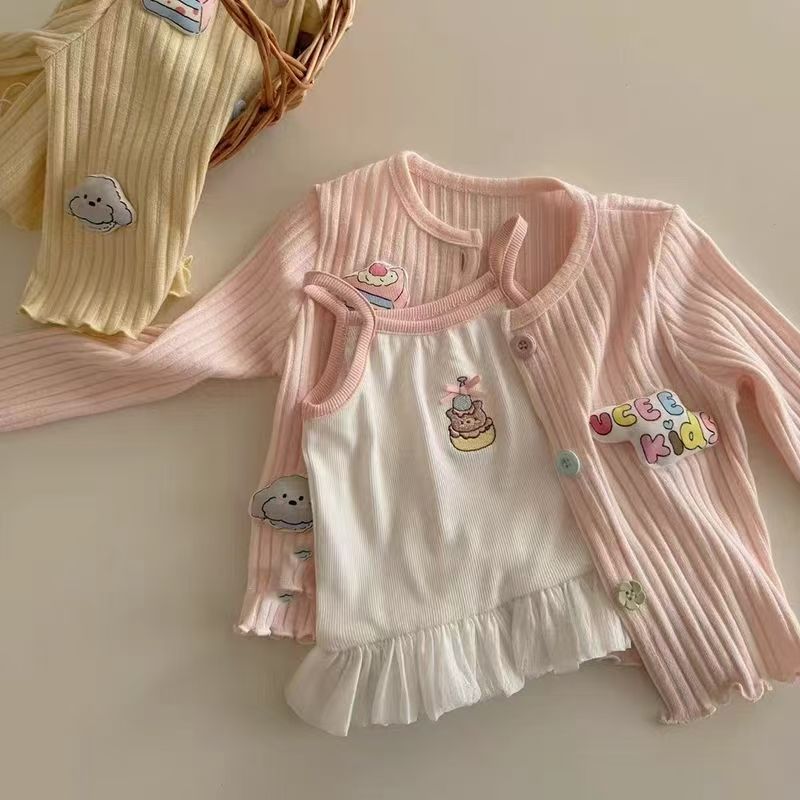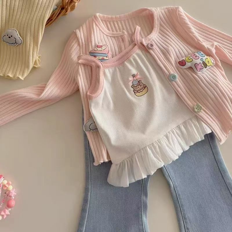 소녀 세트 2025 봄 새로운 여성의 보물 귀여운 레이스 스트랩 스타일 카디건 청바지 봄 3 피스 세트스토어 가기
