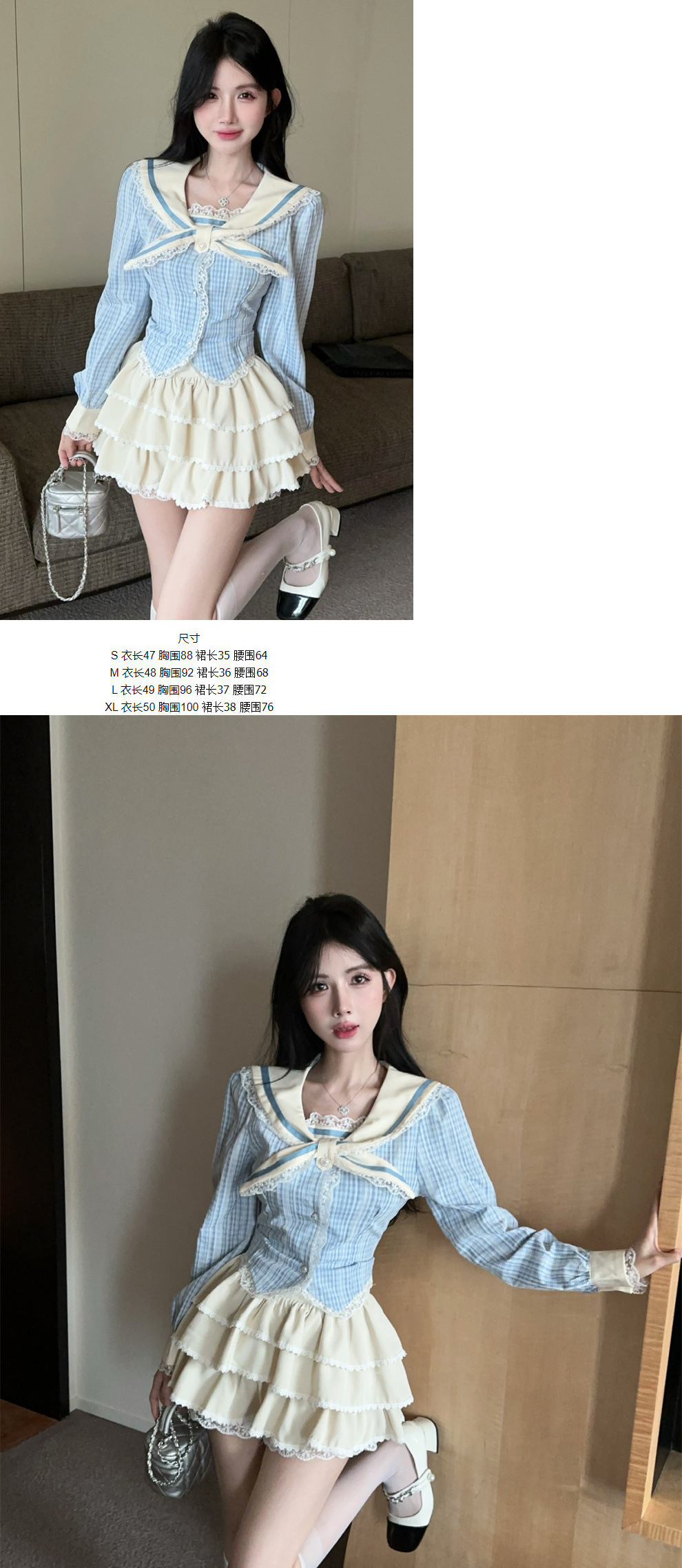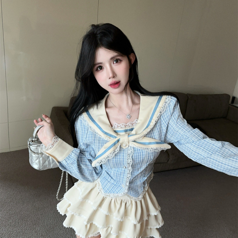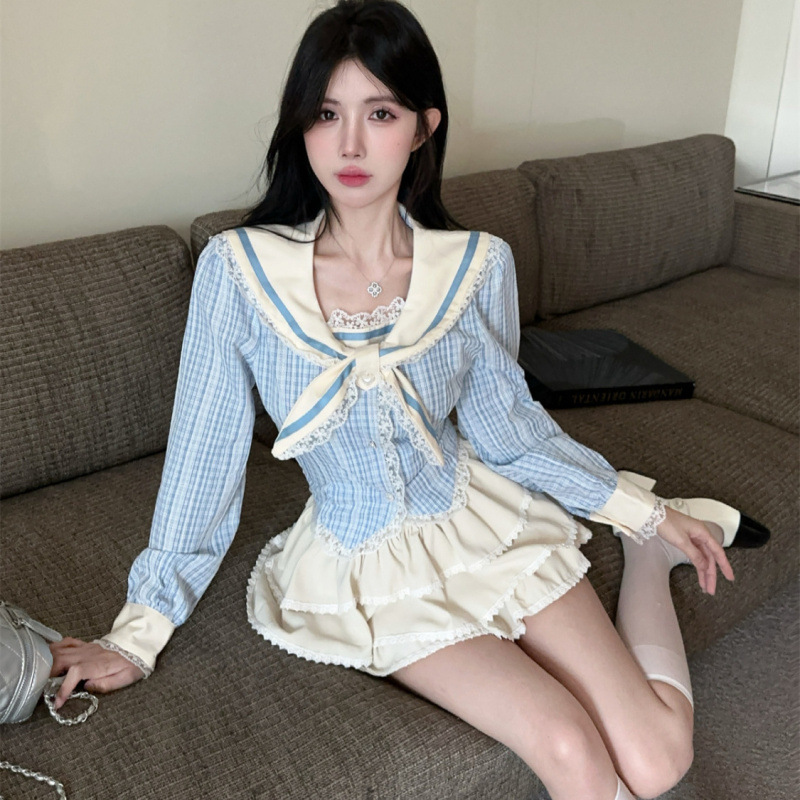 한국의 새로운 대학 스타일 JK 유니폼 세트 달콤한 나이 감소 체크 탑 하프 케이크 스커트 투피스 세트