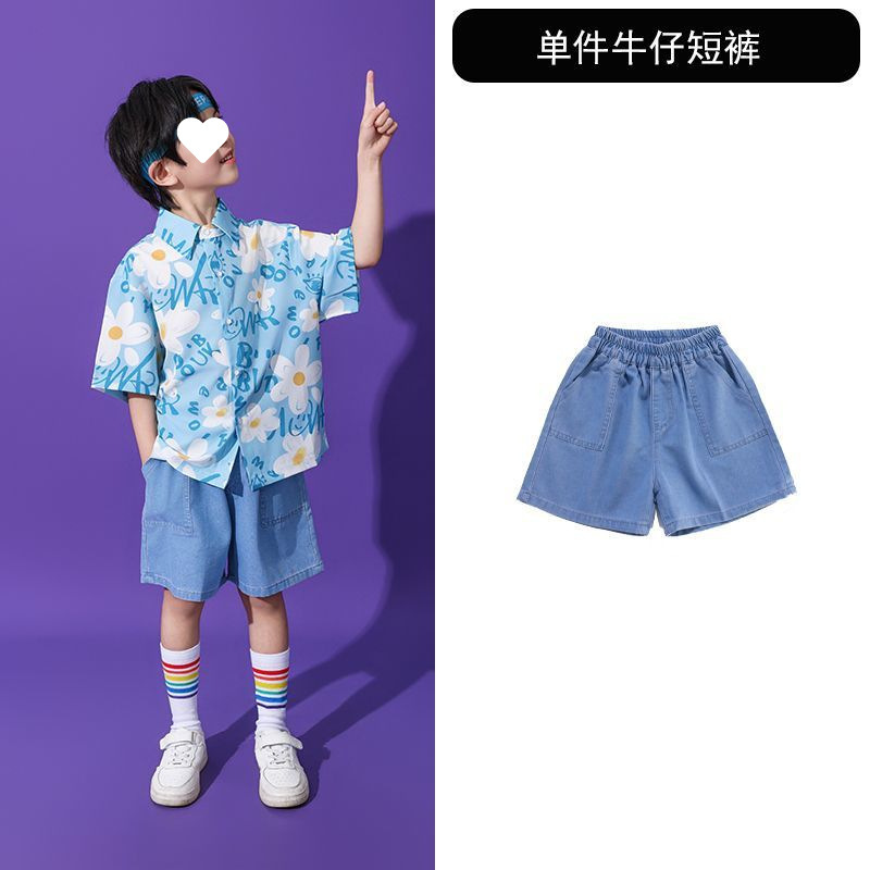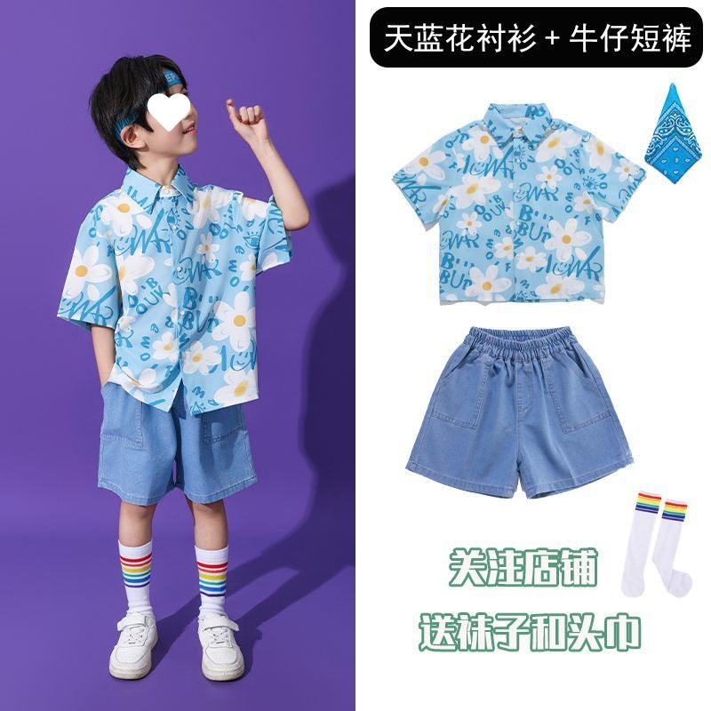 • [데님반바지+하늘색 꽃무늬 셔츠] 무료 양말과 머리스카프