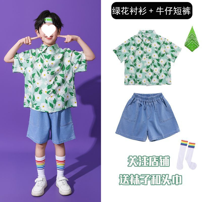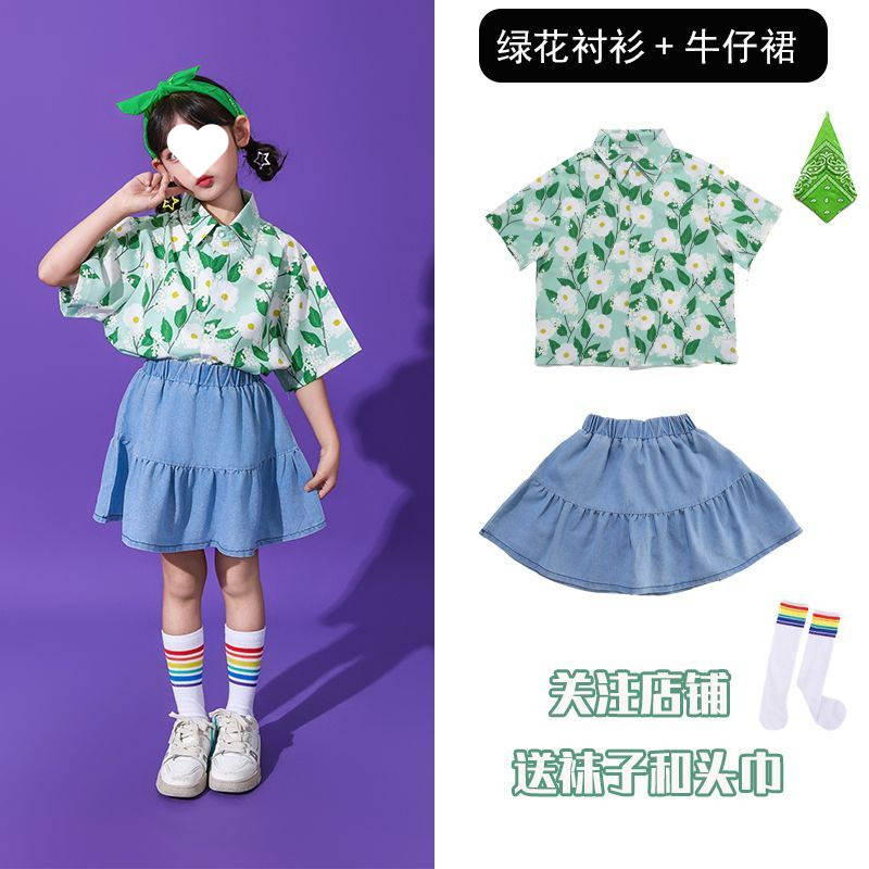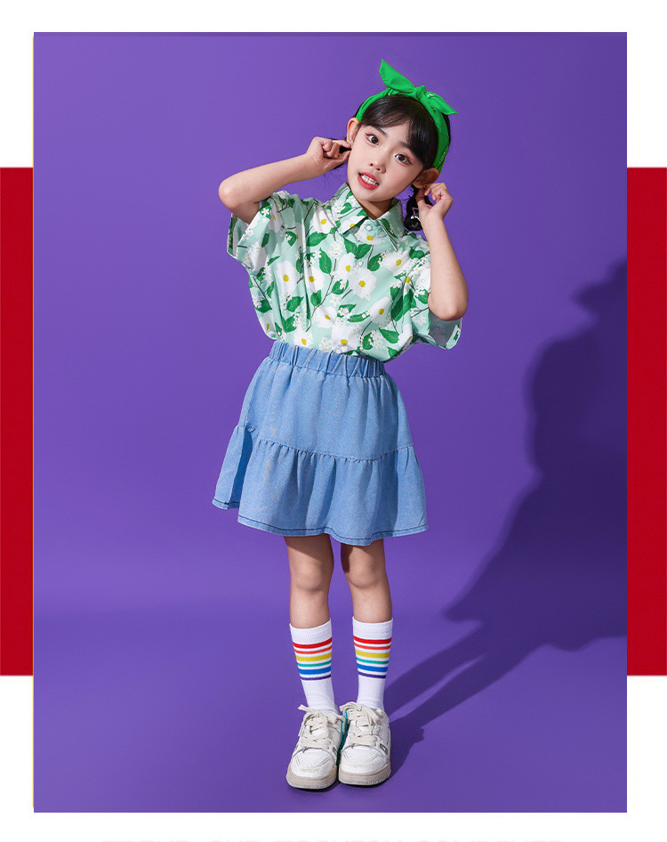 • [데님 스커트 + 그린 플로럴 셔츠] 무료 양말과 머리 스카프