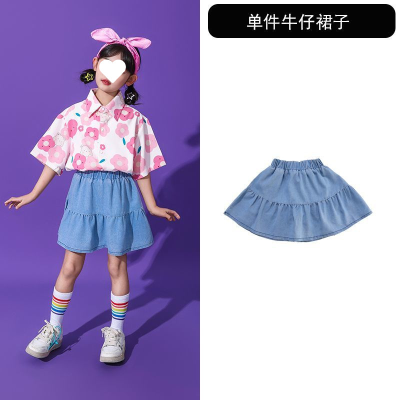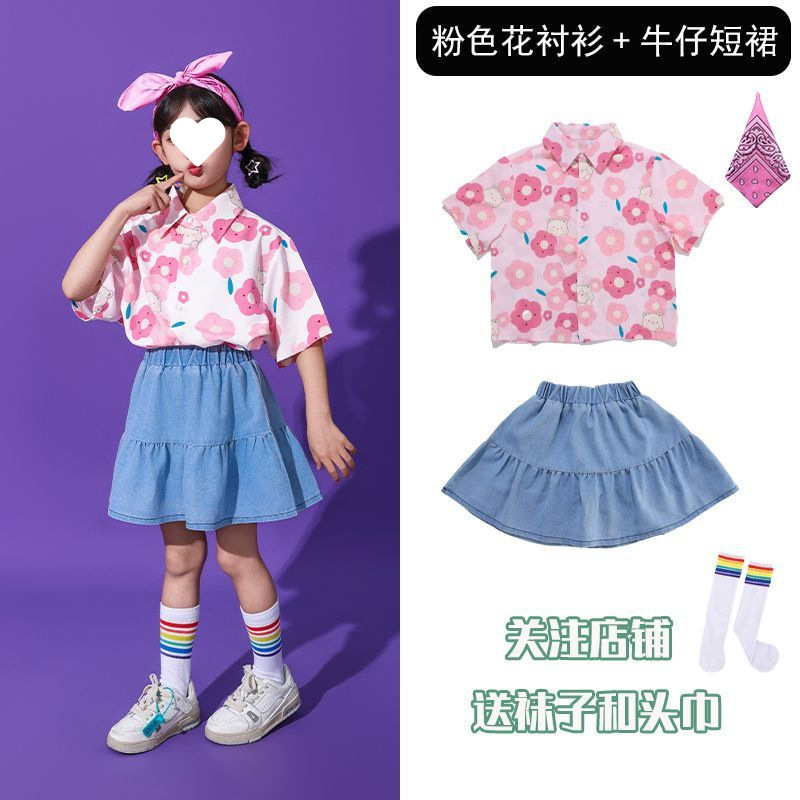 • [데님 스커트 + 핑크 꽃무늬 셔츠] 무료 양말과 머리 스카프