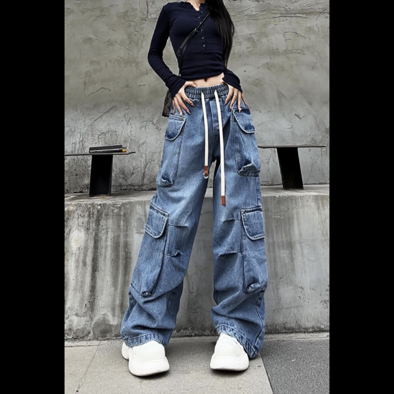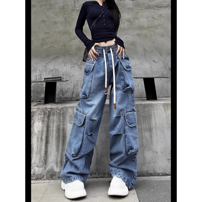 청바지 여성의 2025 봄 새로운 높은 허리 스트레이트 드로우 스트링 바지 부드러운 멀티 포켓 청바지 여성용 트렌디 바지스토어 가기