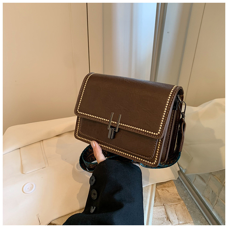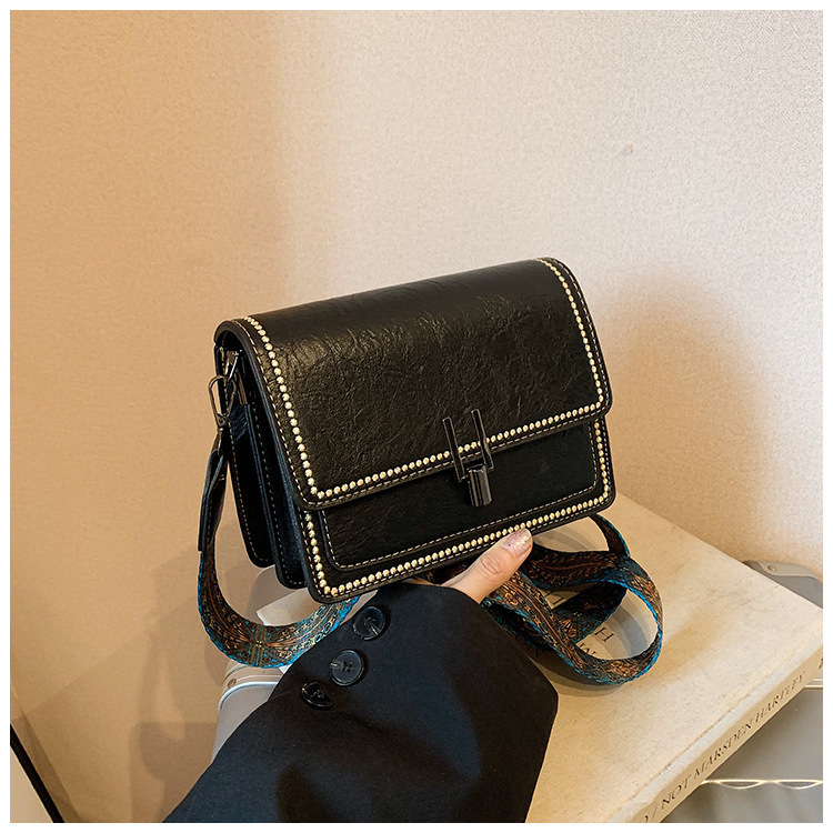 时尚简约宽肩带小方包复古潮流翻盖锁扣百搭潮流新款斜跨单肩女包
