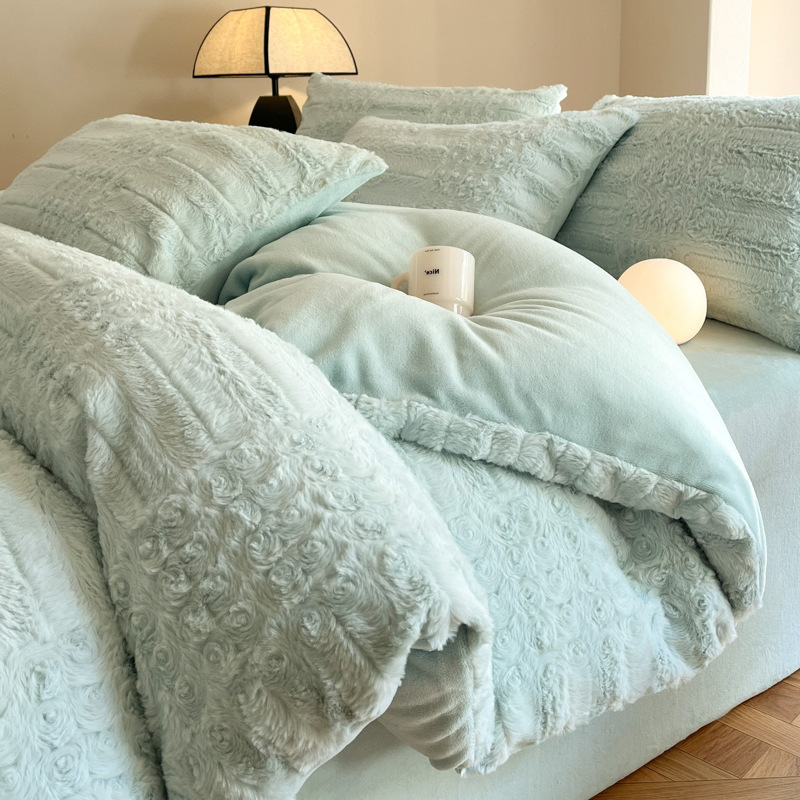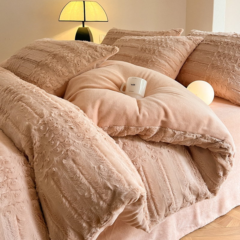 두꺼운 토끼 봉제 밀크 벨벳 가을과 겨울 따뜻한 침대 4 조각 양면 기모 이불 커버 산호 양털 침구 시트