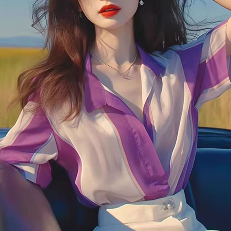 프랑스 독특한 작은 탑 슈퍼 잘 생긴 여성 여름 원피스 2025 세련된 아름다운 보라색 반팔 쉬폰 셔츠스토어 가기