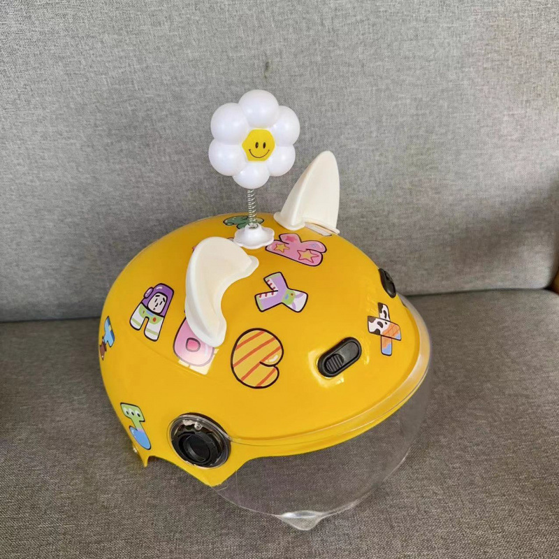 • 노란색 헬멧 + abc 스티커 + 투명 거울 + 꽃과 흰 귀