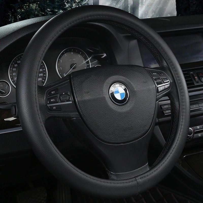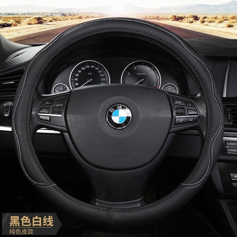 • 흰색 선이 있는 단색 가죽 스티어링 휠 커버 검정색