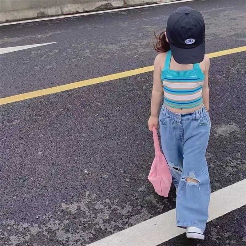 여름 소녀 조끼 슬링 아기 세련된 어린이 성격 유행 사이버 연예인 색상 매칭 줄무늬 니트 목스토어 가기