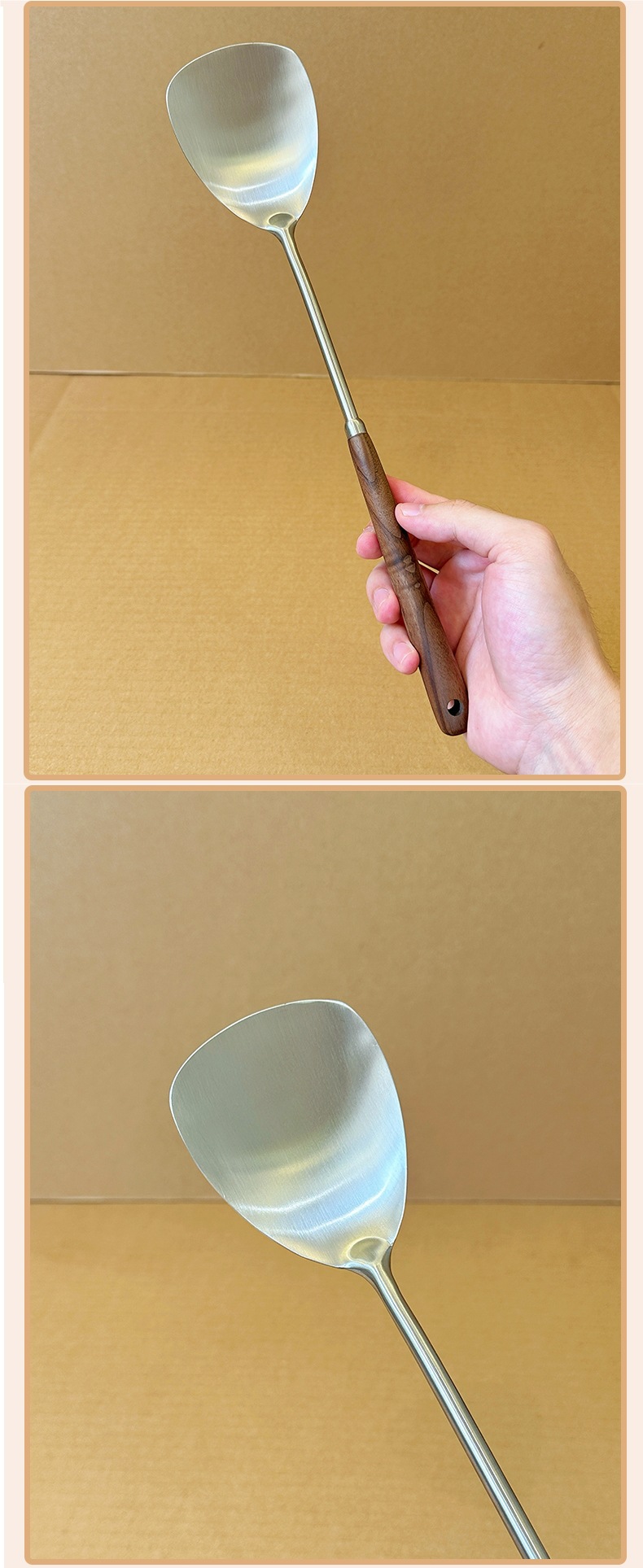 새로운 스타일-304 스테인레스 스틸 작은 볶음 삽 가정용 미니 스몰 사이즈 월넛 및 모든 스틸 튀김 볶음 삽