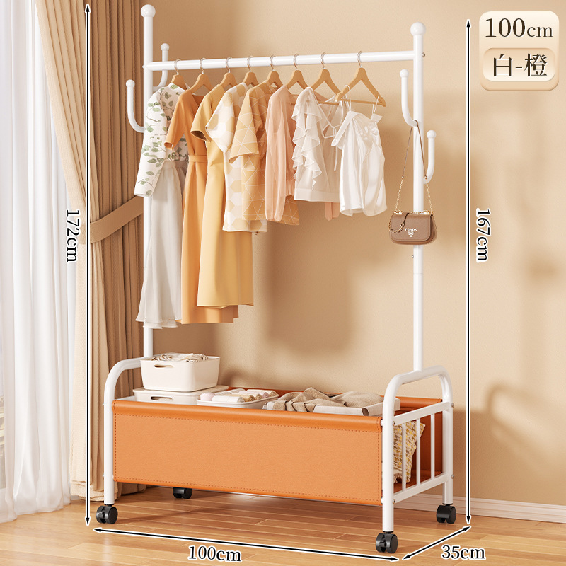 • [화이트 오렌지 100cm] 두꺼운 파이프 직경 + 옷걸이 4개 + 가죽 수납바구니 + 만능바퀴