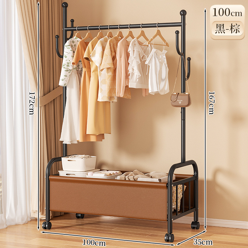 • [블랙앤브라운 100cm] 두꺼운 파이프 직경 + 옷걸이 4개 + 가죽 수납바구니 + 만능바퀴