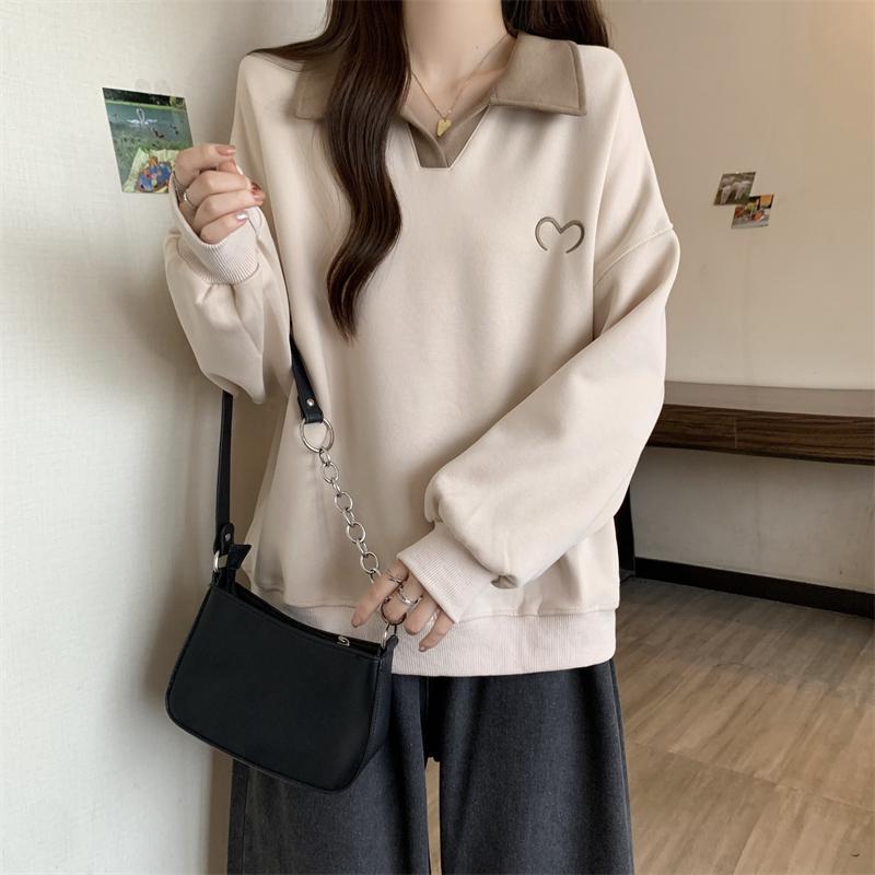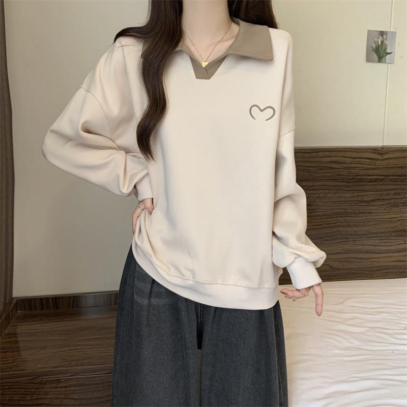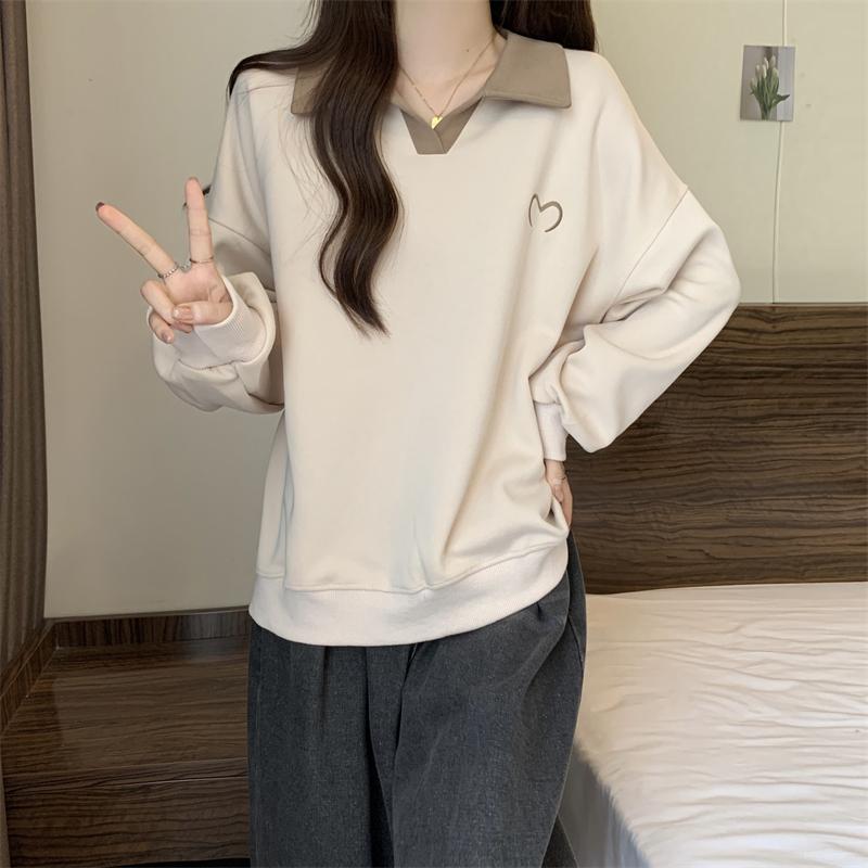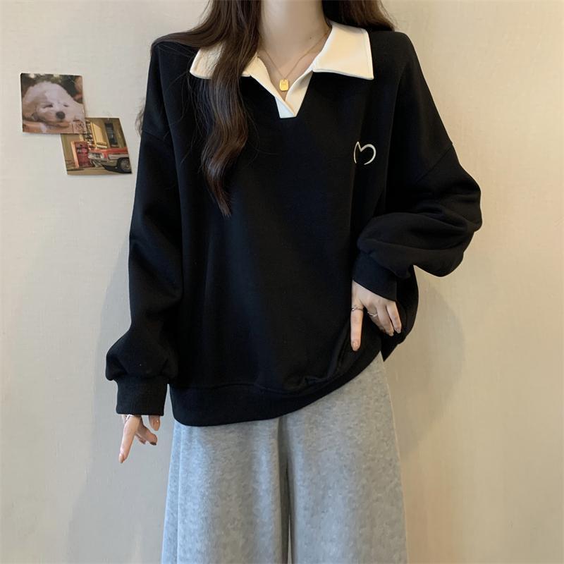 플러스 사이즈 여성 대비 폴로 칼라 스웨트 셔츠 여성의 가을 통통녀 슬리밍 느슨한 디자인 게으른 스타일 코트 탑스토어 가기