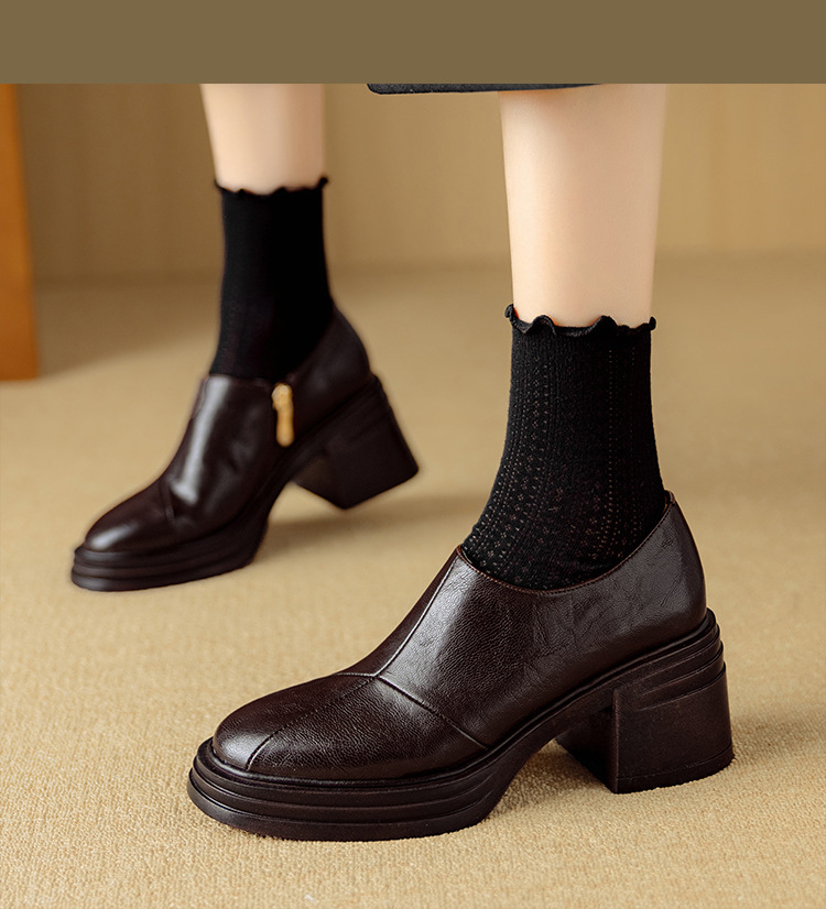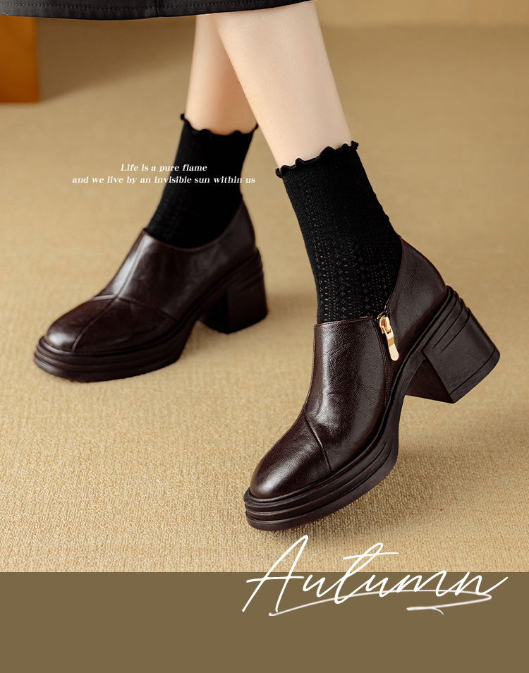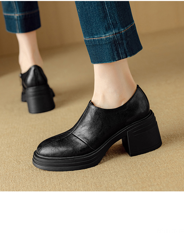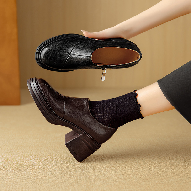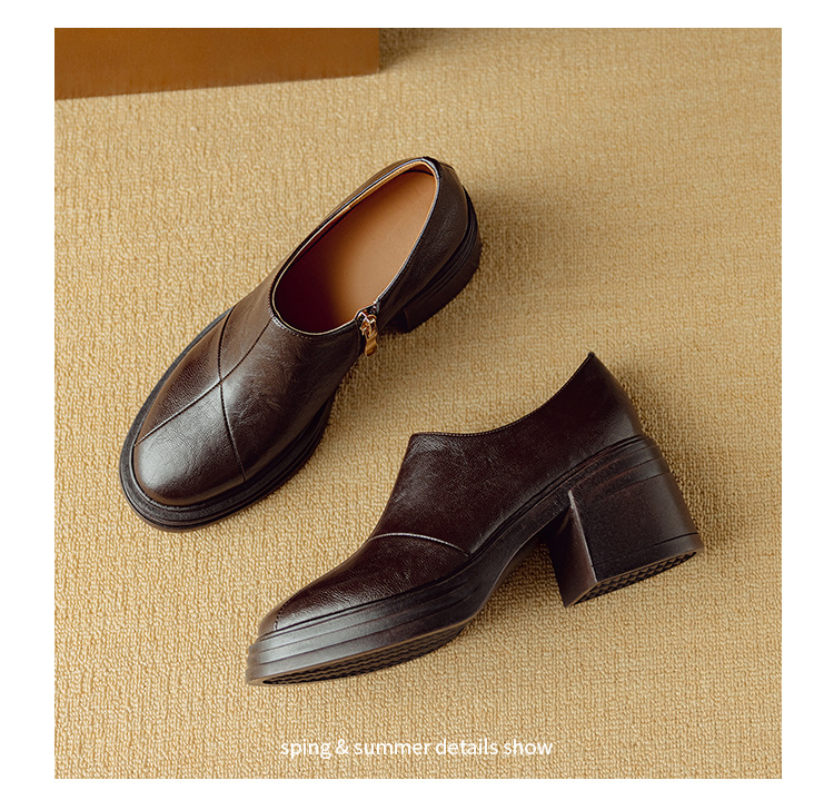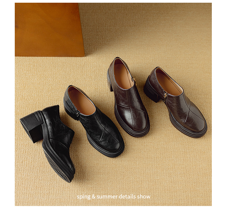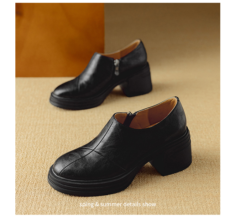 2025 새로운 봄과 가을 두꺼운 밑창 두꺼운 발 뒤꿈치 깊은 입 신발 여성 신발 사이드 지퍼 하이힐 블랙 작은 가죽 신발 여성용