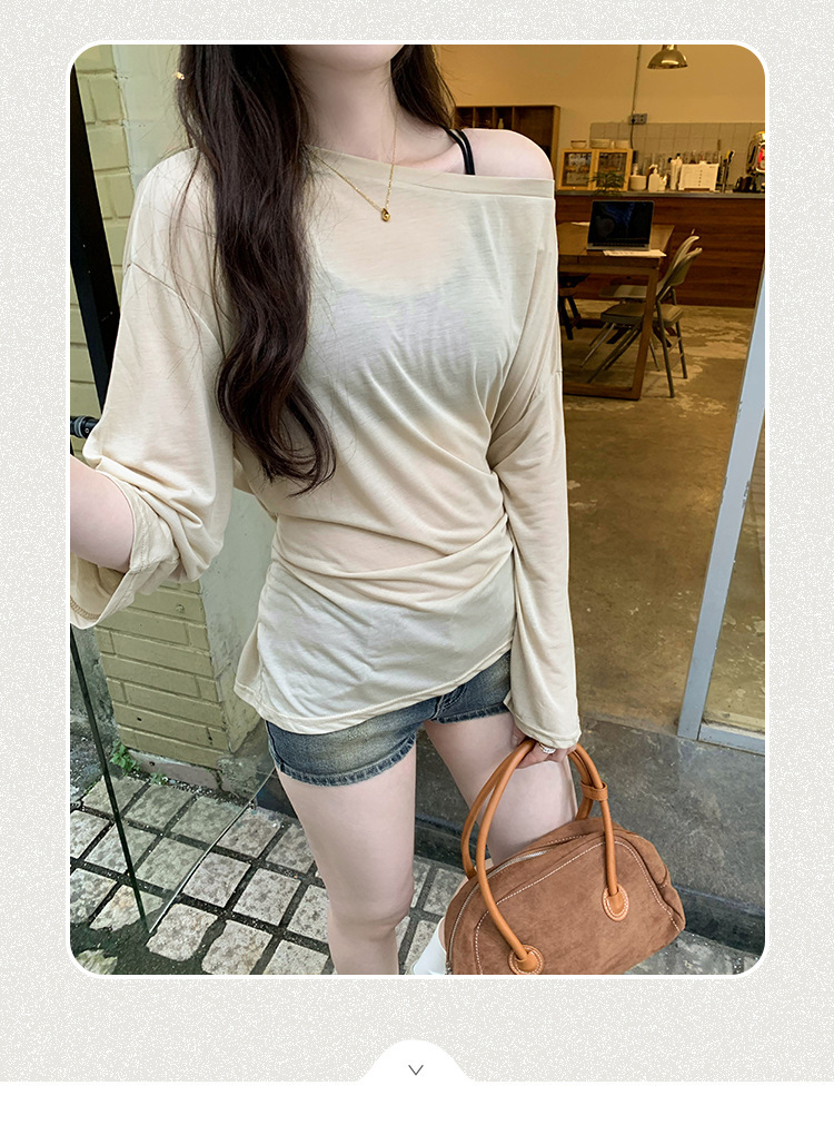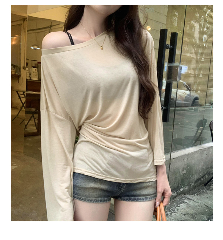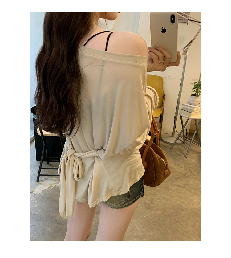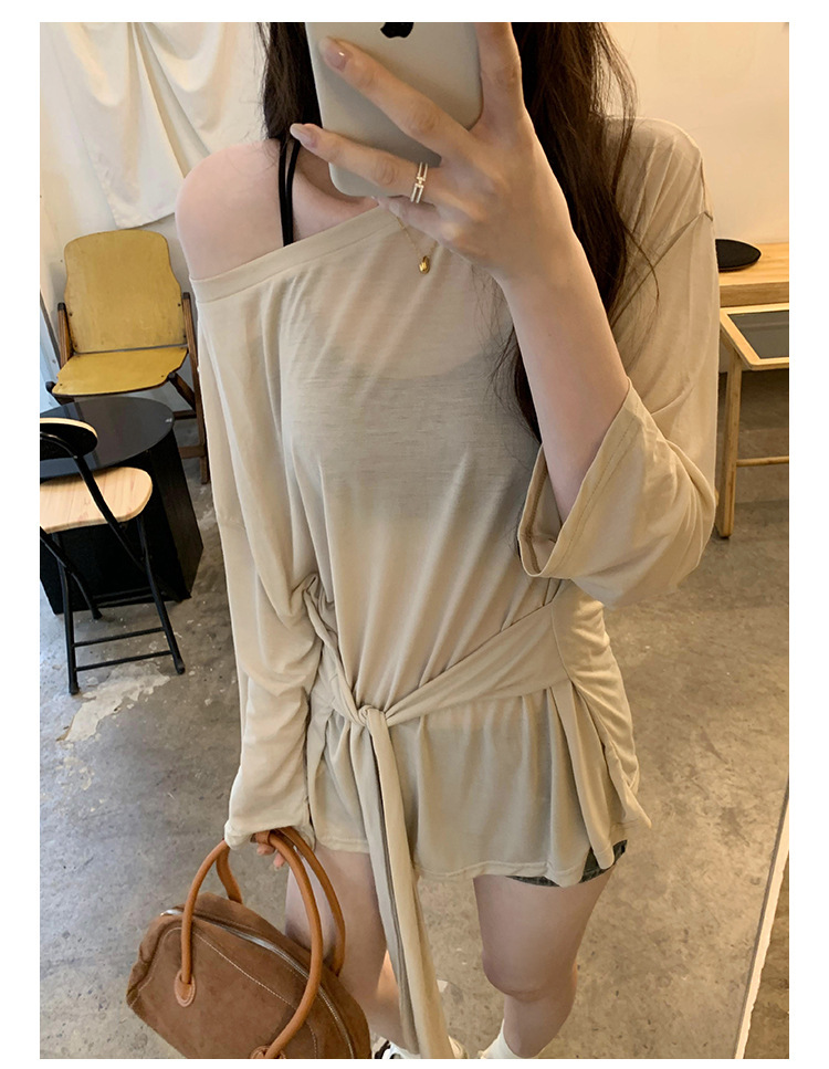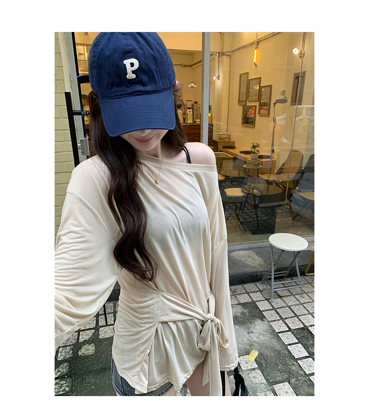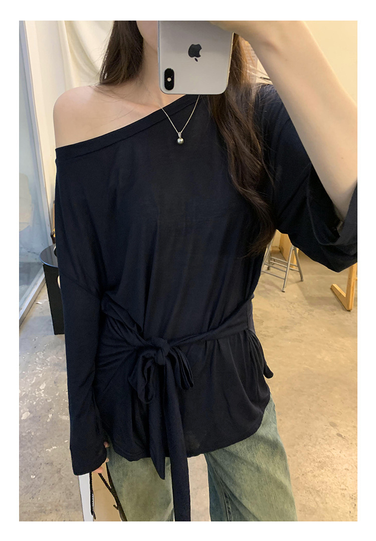 솔리드 컬러 스트랩 허리 긴 소매 태양 보호 블라우스 티셔츠 여성의 2025 가을 새로운 올 매치 슬란 트 어깨 슬림 탑