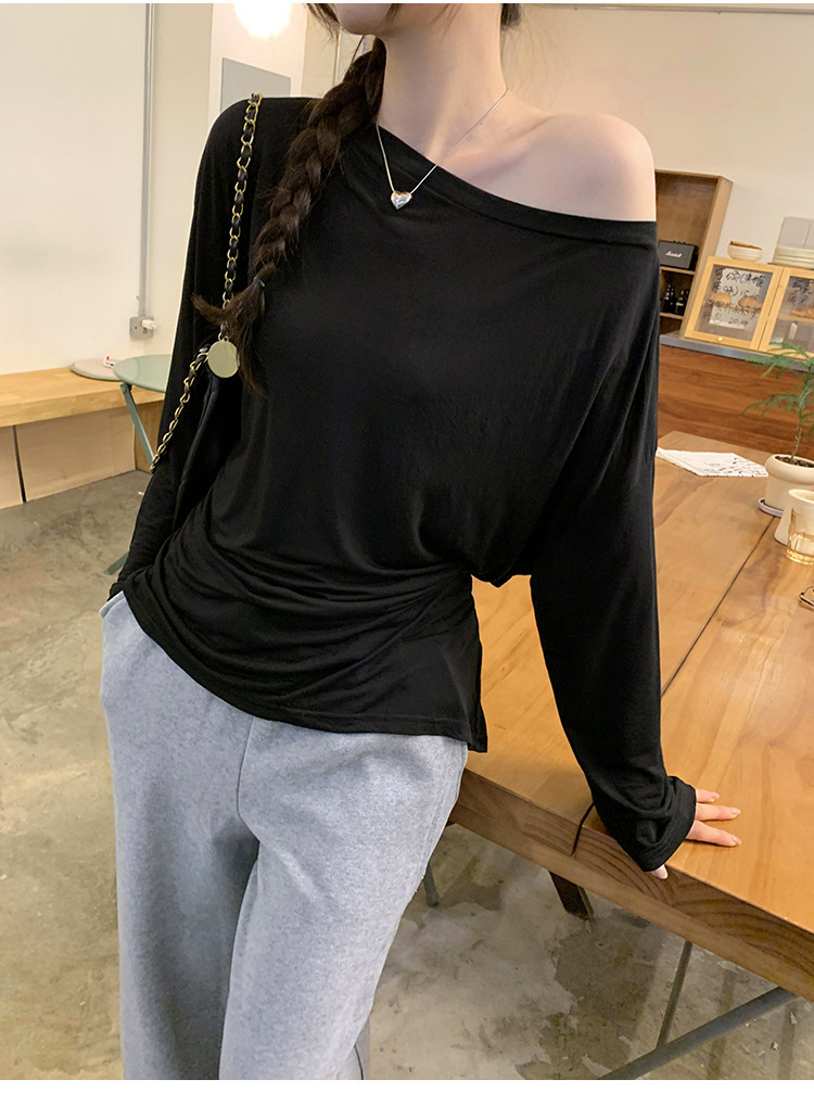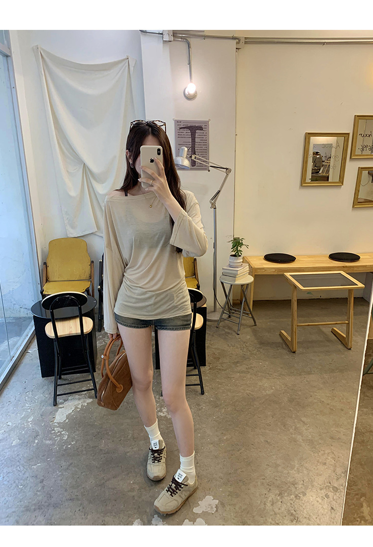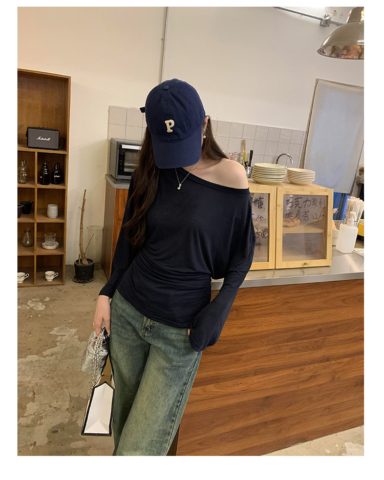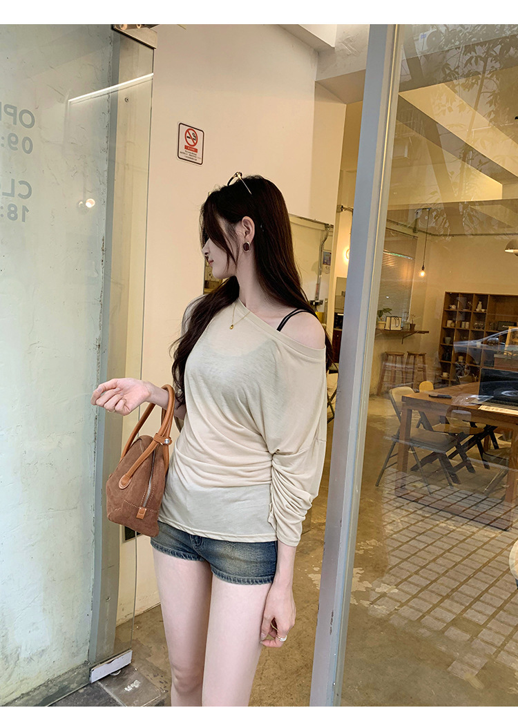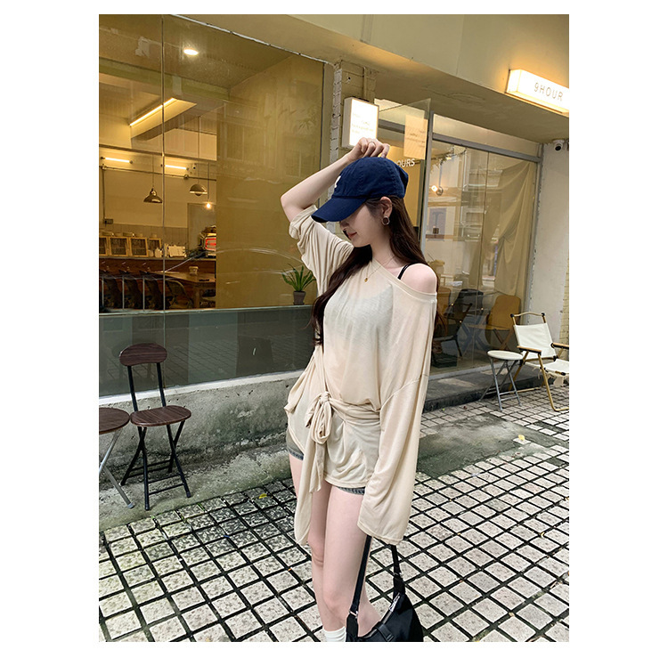 솔리드 컬러 스트랩 허리 긴 소매 태양 보호 블라우스 티셔츠 여성의 2025 가을 새로운 올 매치 슬란 트 어깨 슬림 탑