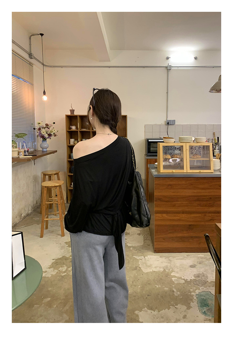 솔리드 컬러 스트랩 허리 긴 소매 태양 보호 블라우스 티셔츠 여성의 2025 가을 새로운 올 매치 슬란 트 어깨 슬림 탑스토어 가기