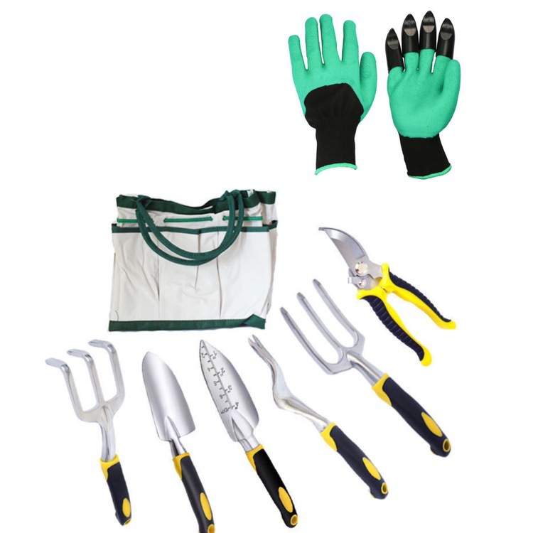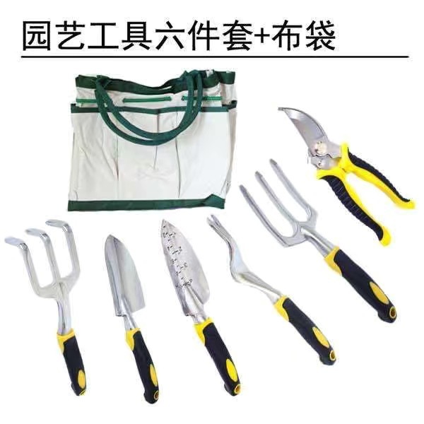 • 검정색과 노란색 손잡이 6종 세트 + 천 가방 + 원예용 장갑 1쌍