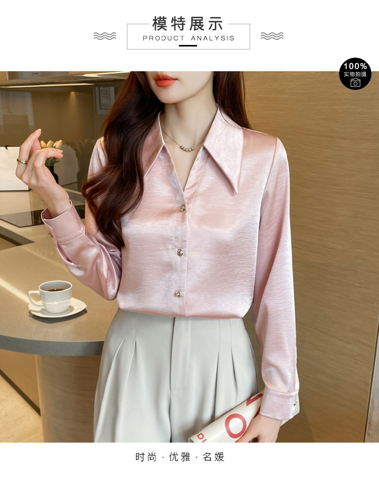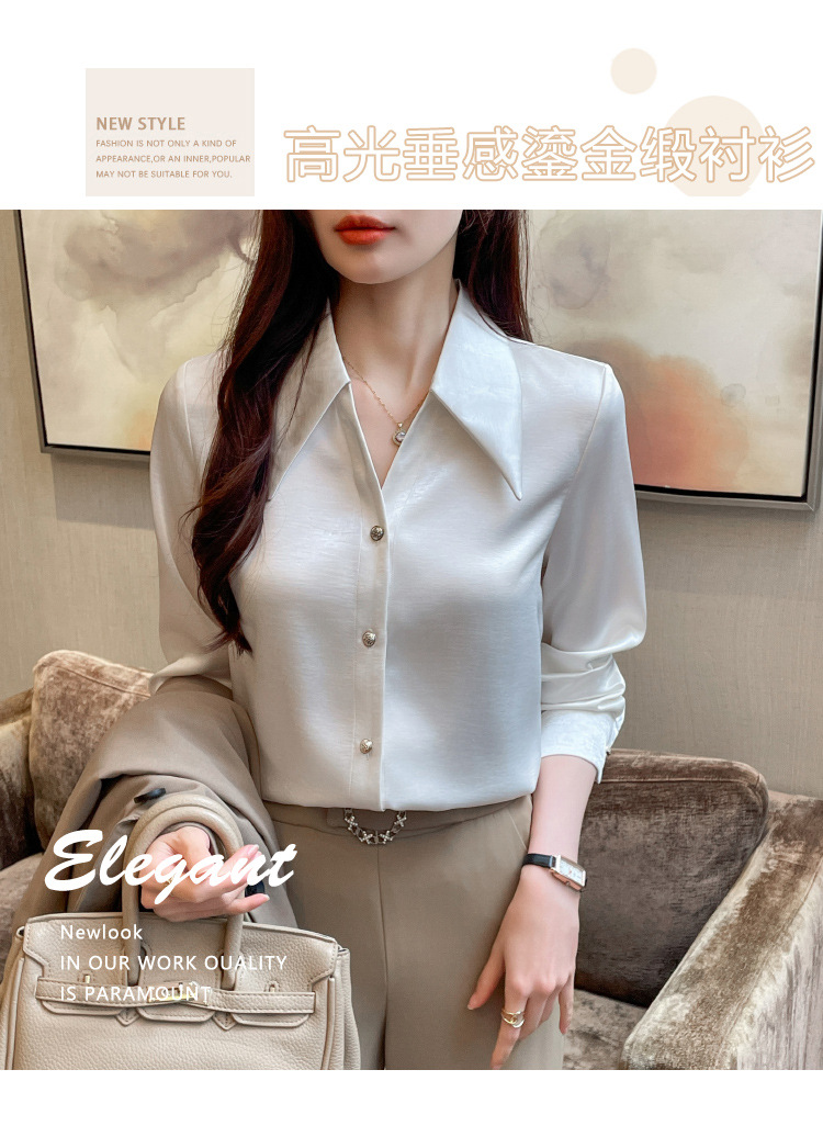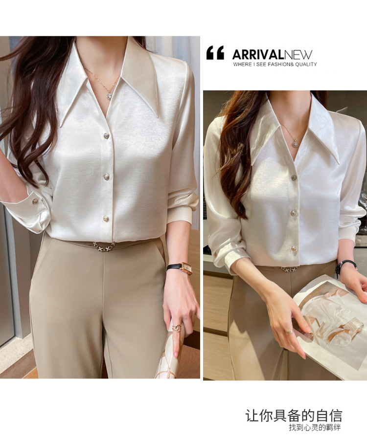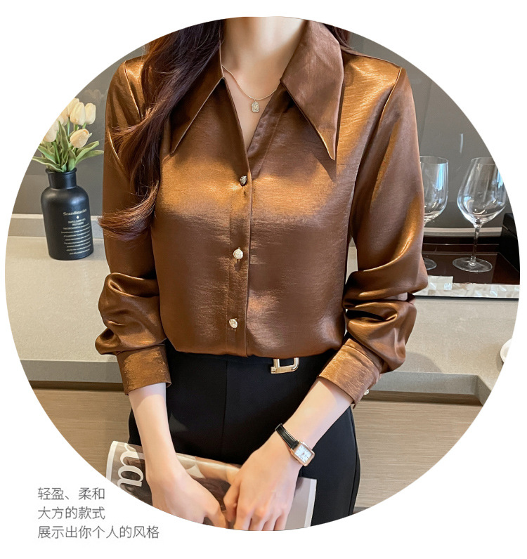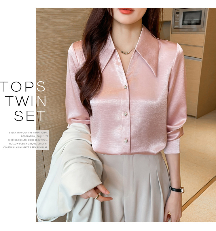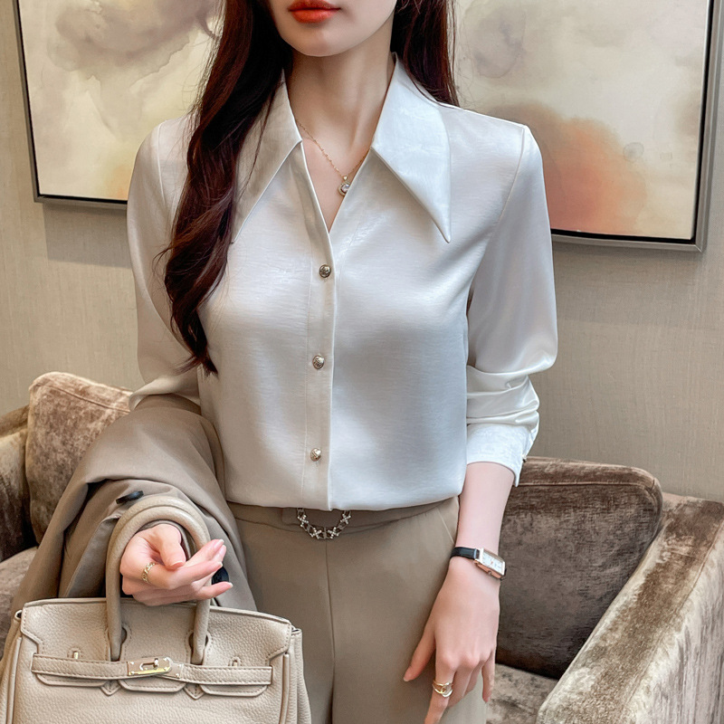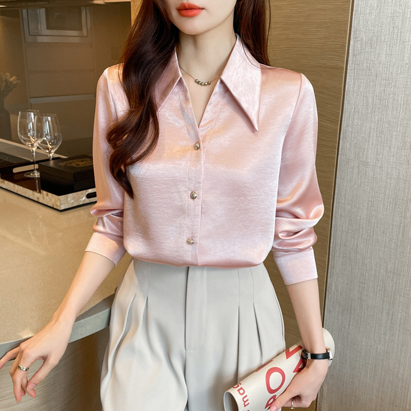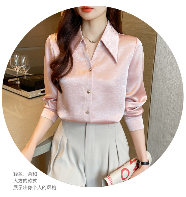 디자인 센스 새틴 셔츠 여성의 2025 년 봄과 여름 새로운 긴 소매 포장 된 V-넥 셔츠 전문 OL 통근 탑스토어 가기