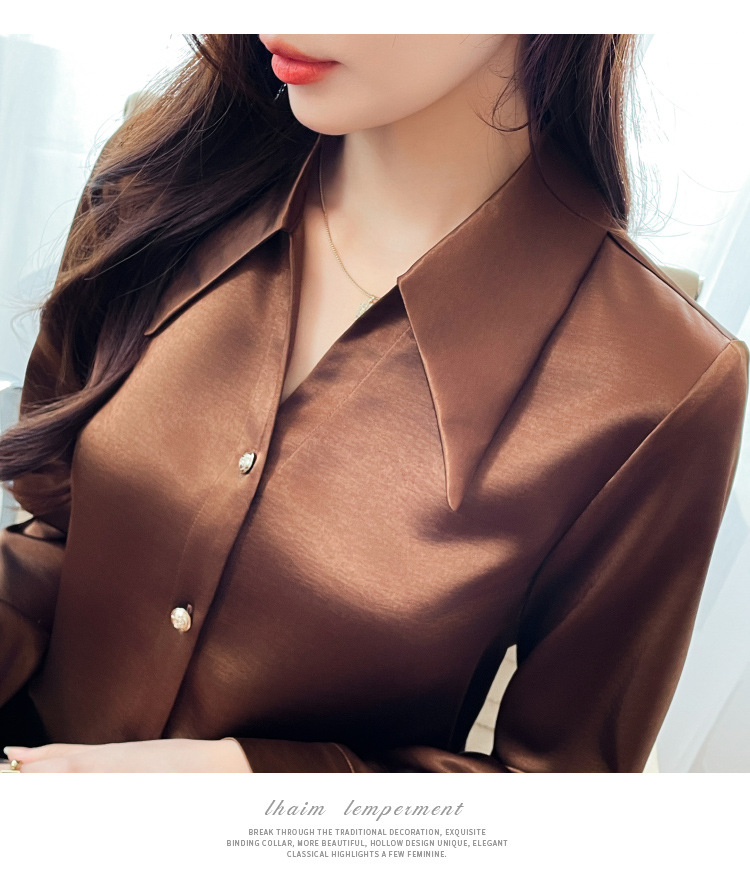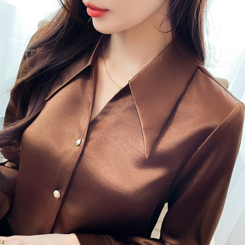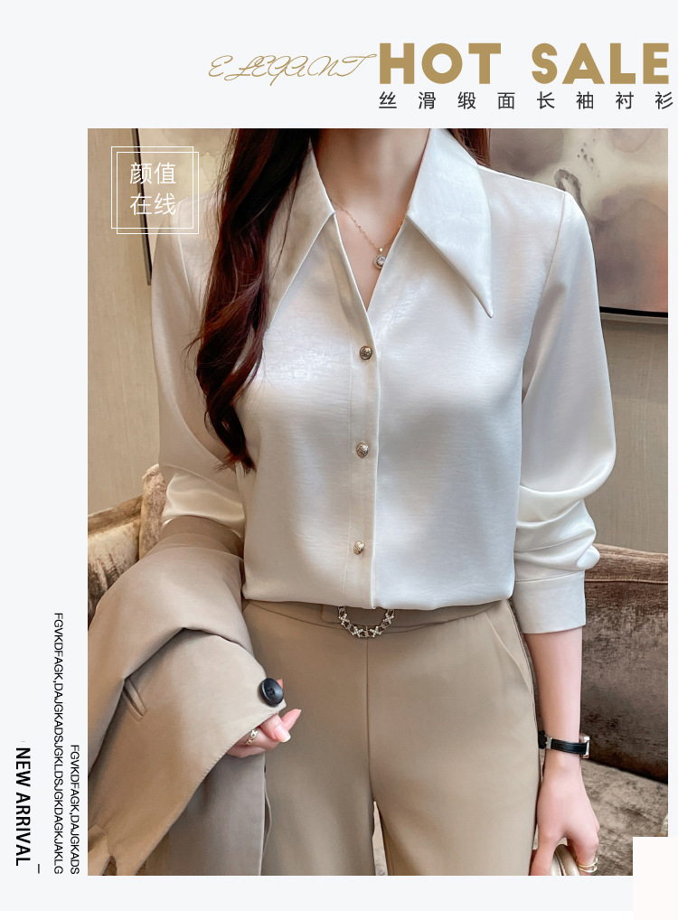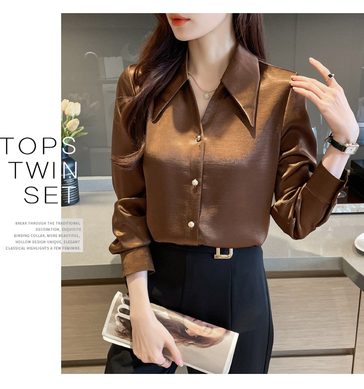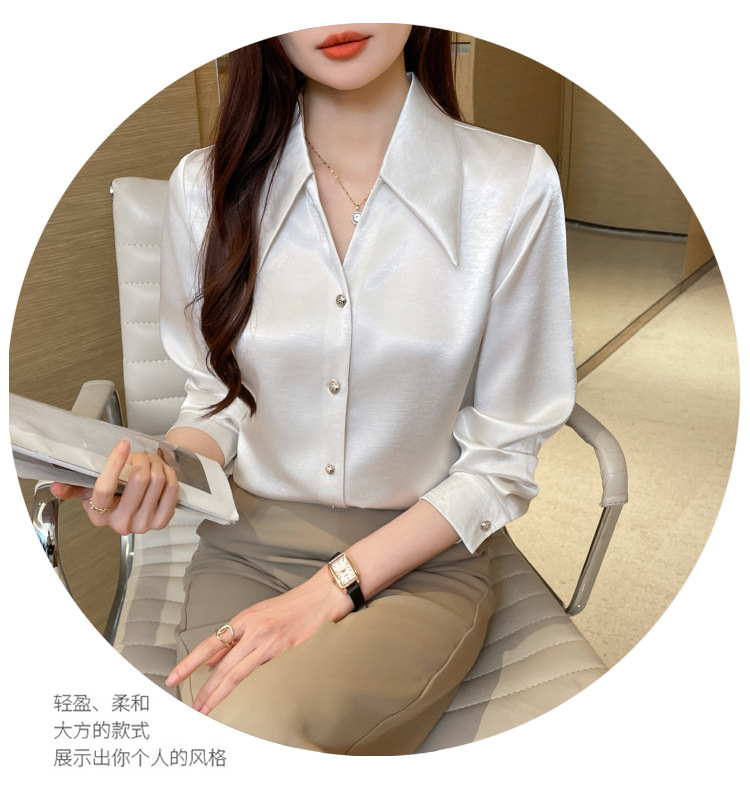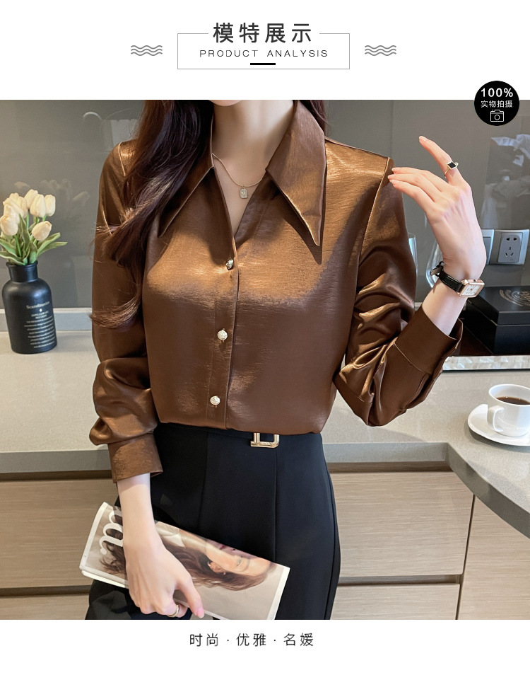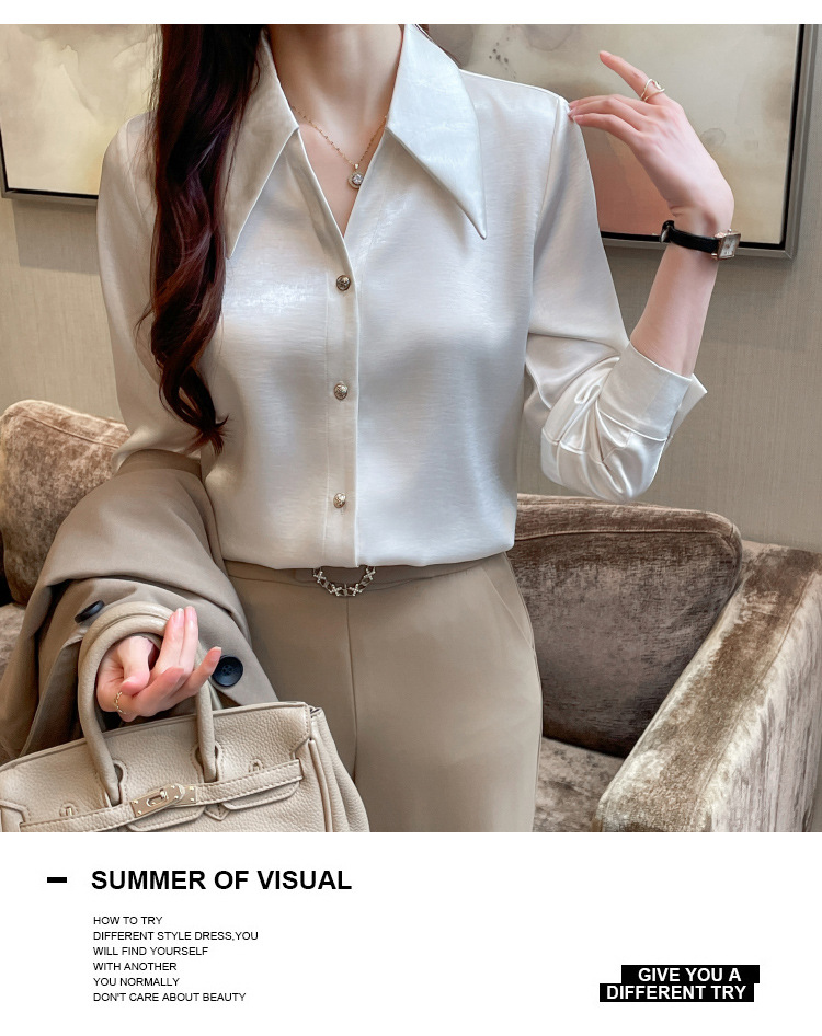 디자인 센스 새틴 셔츠 여성의 2025 년 봄과 여름 새로운 긴 소매 포장 된 V-넥 셔츠 전문 OL 통근 탑스토어 가기