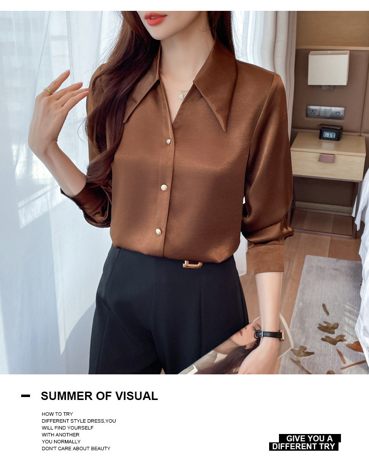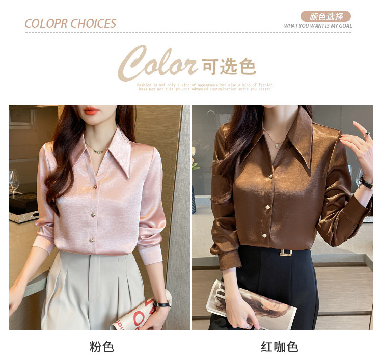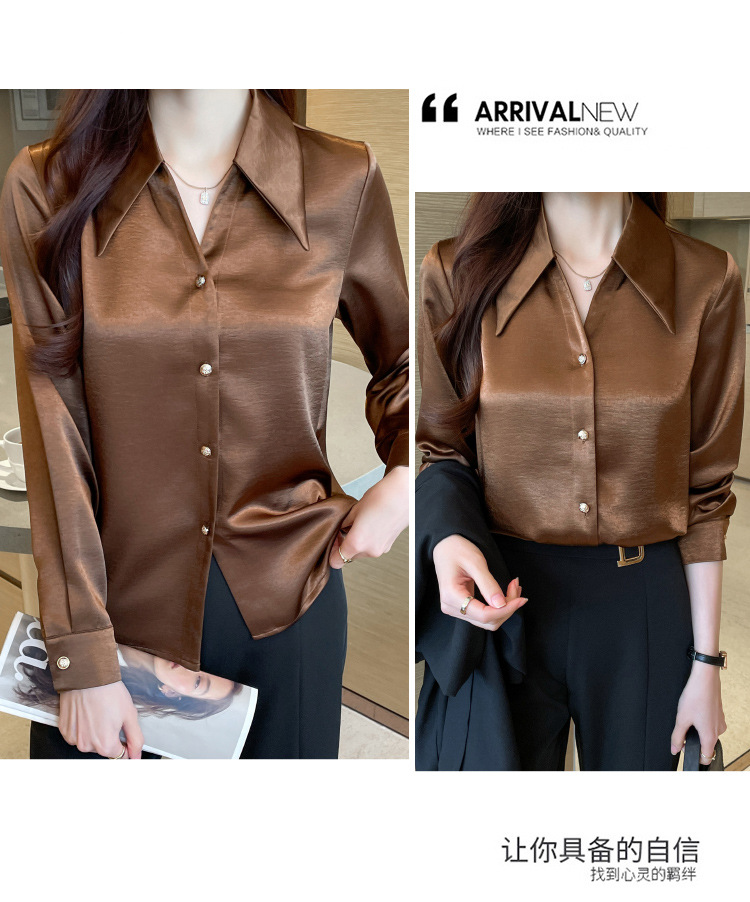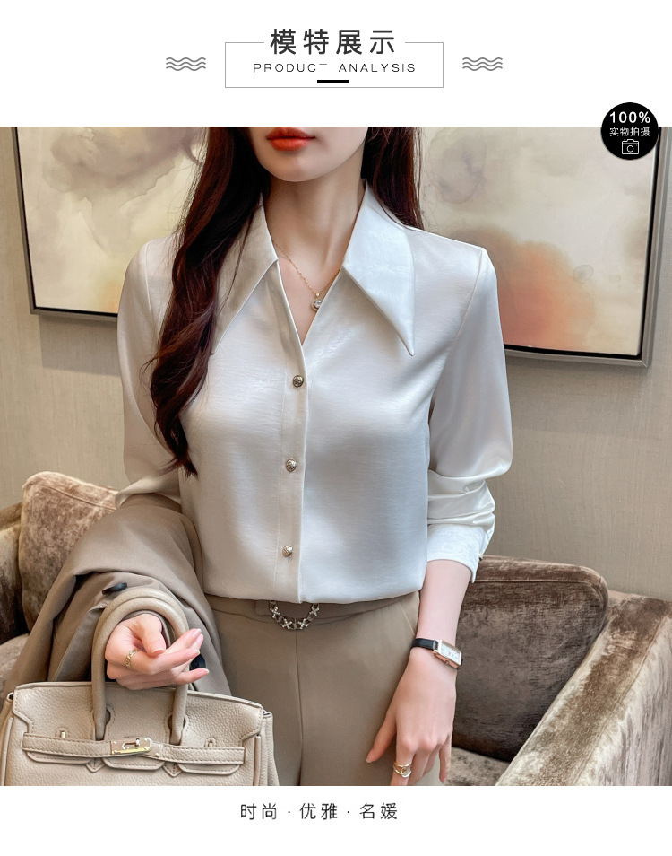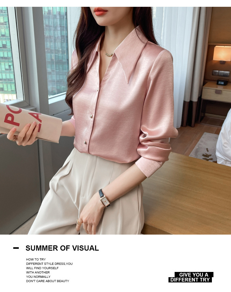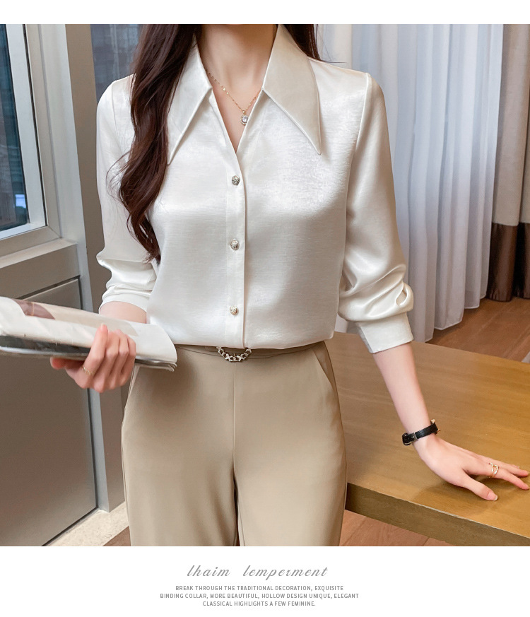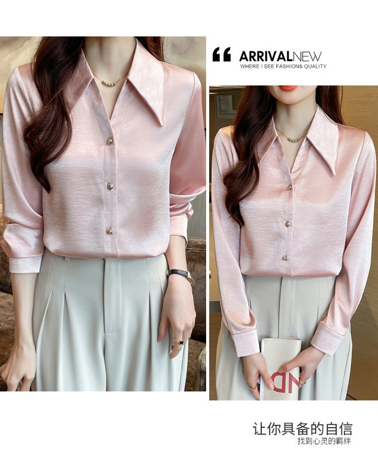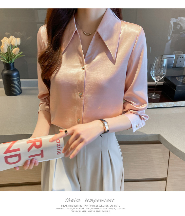 디자인 센스 새틴 셔츠 여성의 2025 년 봄과 여름 새로운 긴 소매 포장 된 V-넥 셔츠 전문 OL 통근 탑스토어 가기