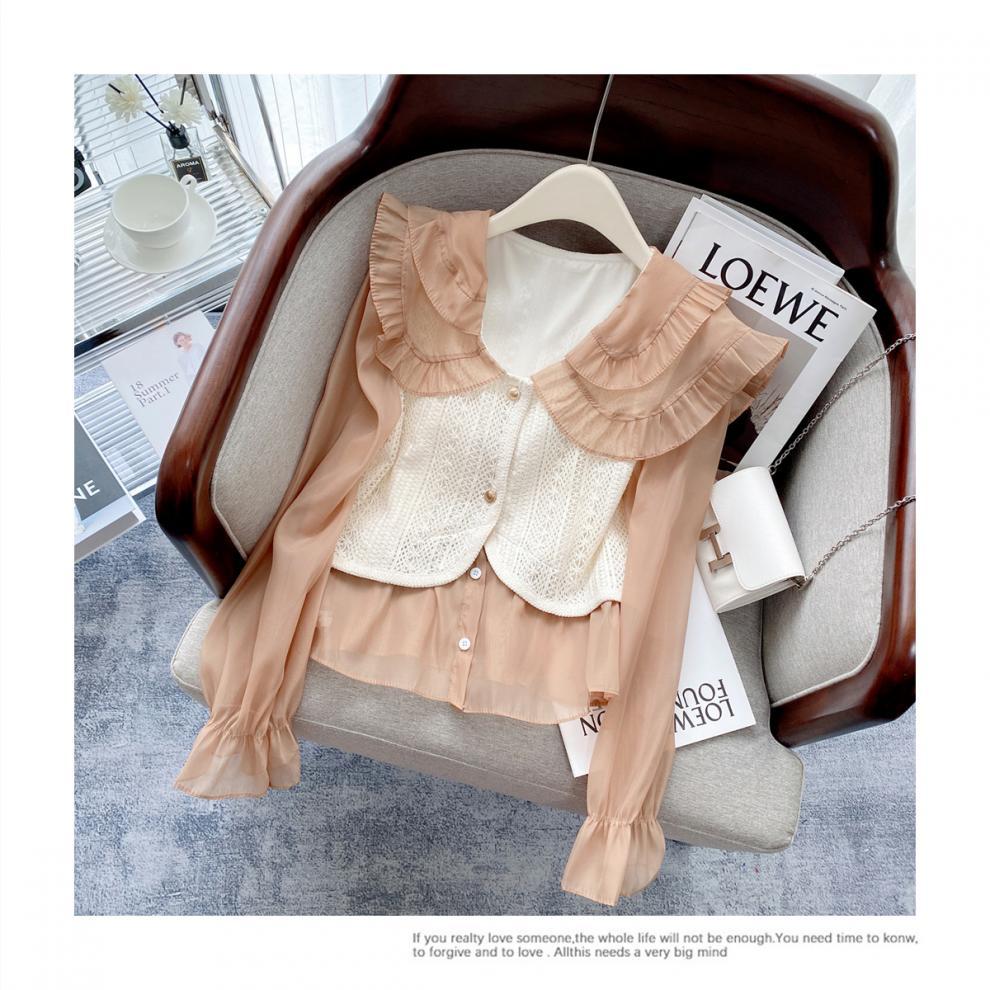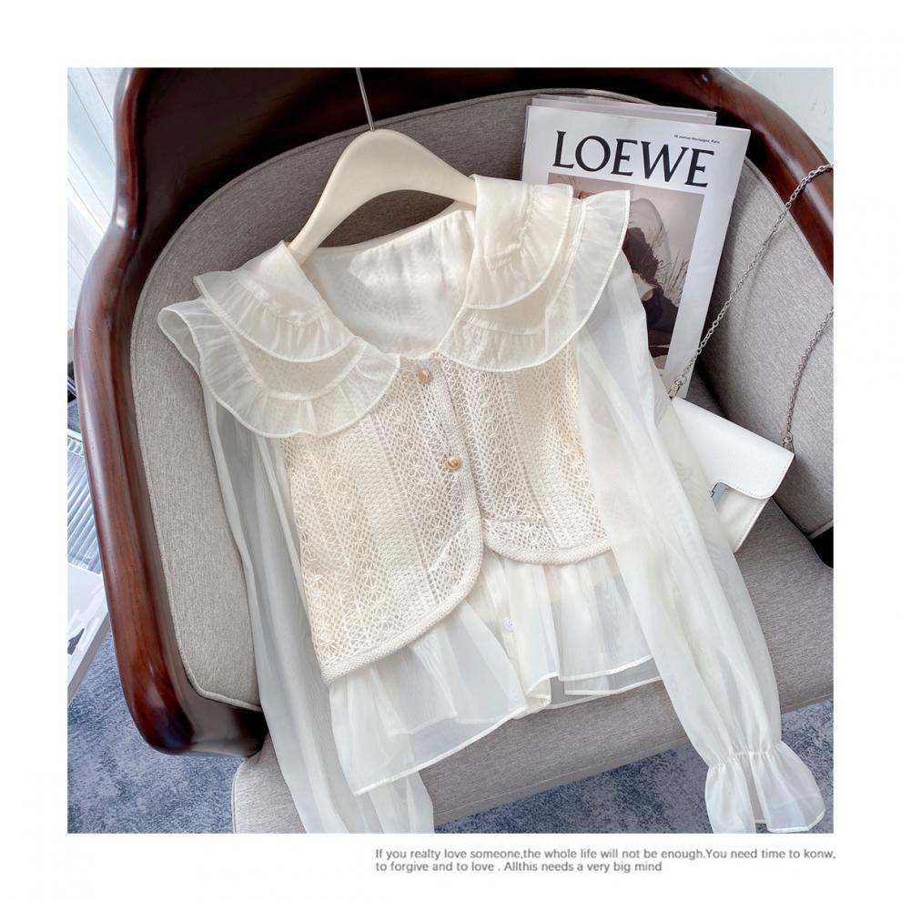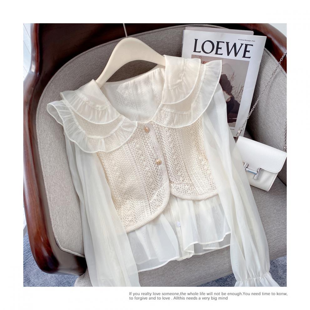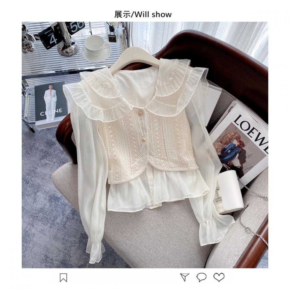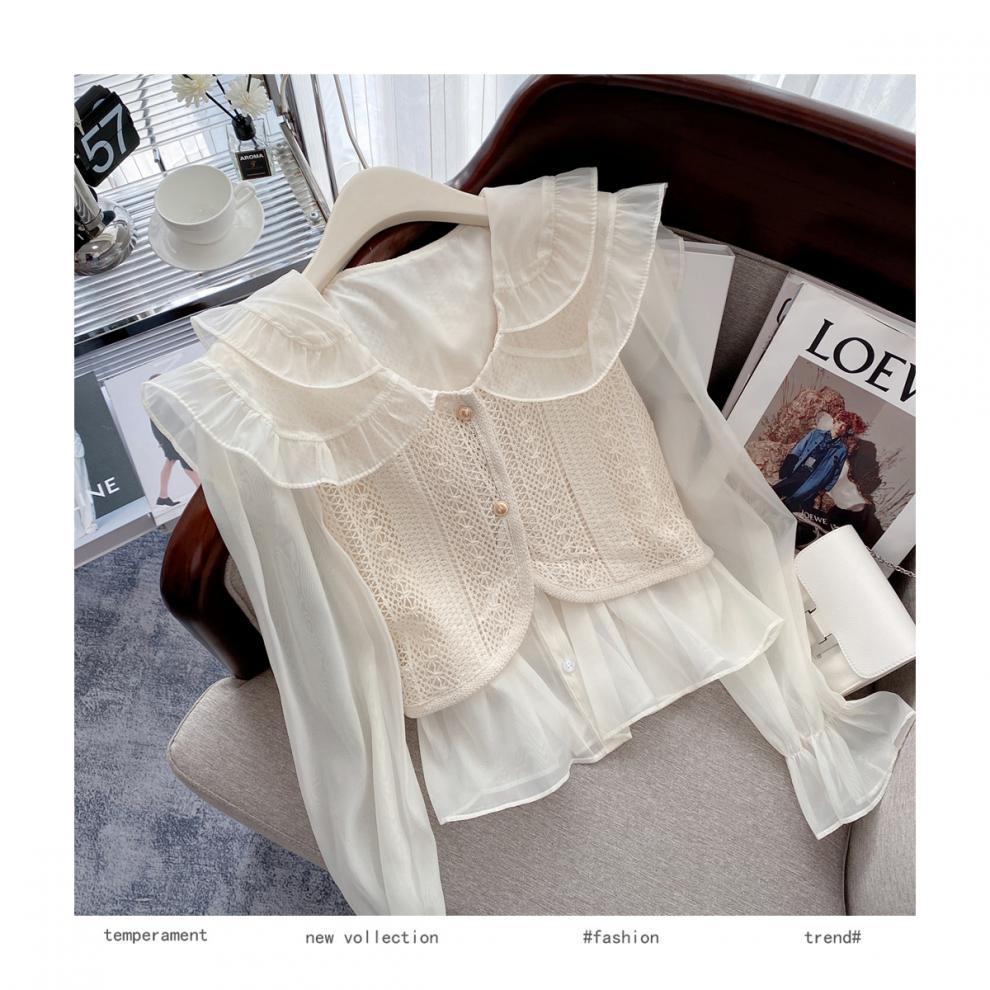 봄과 가을 프랑스 달콤한 더블 레이스 인형 칼라 셔츠 여성용 쉬폰 긴 소매 가짜 투피스 스티칭 조끼 탑
