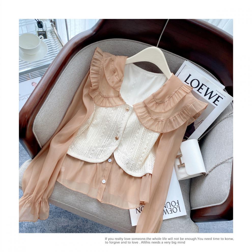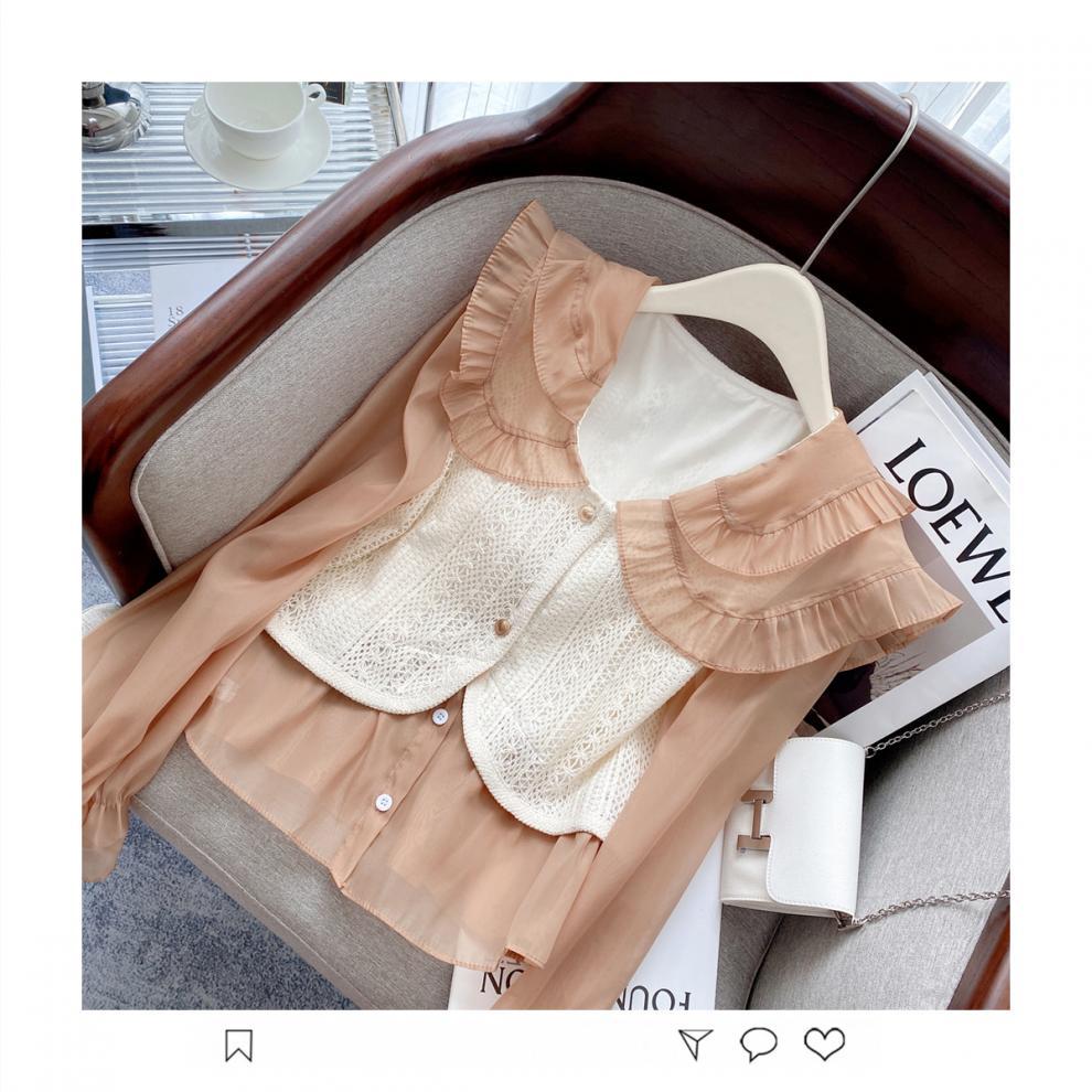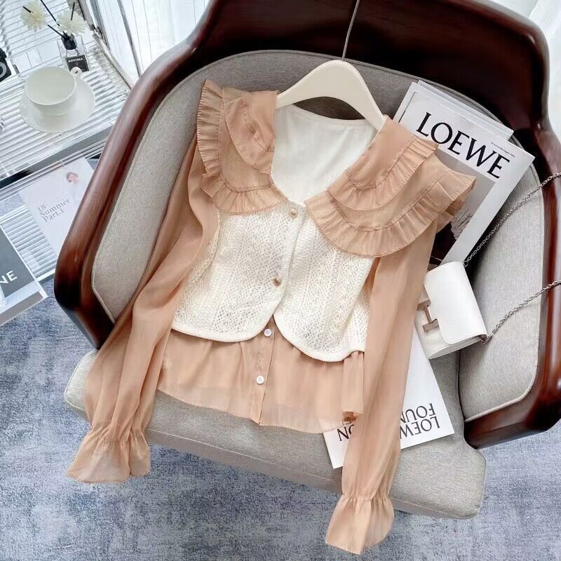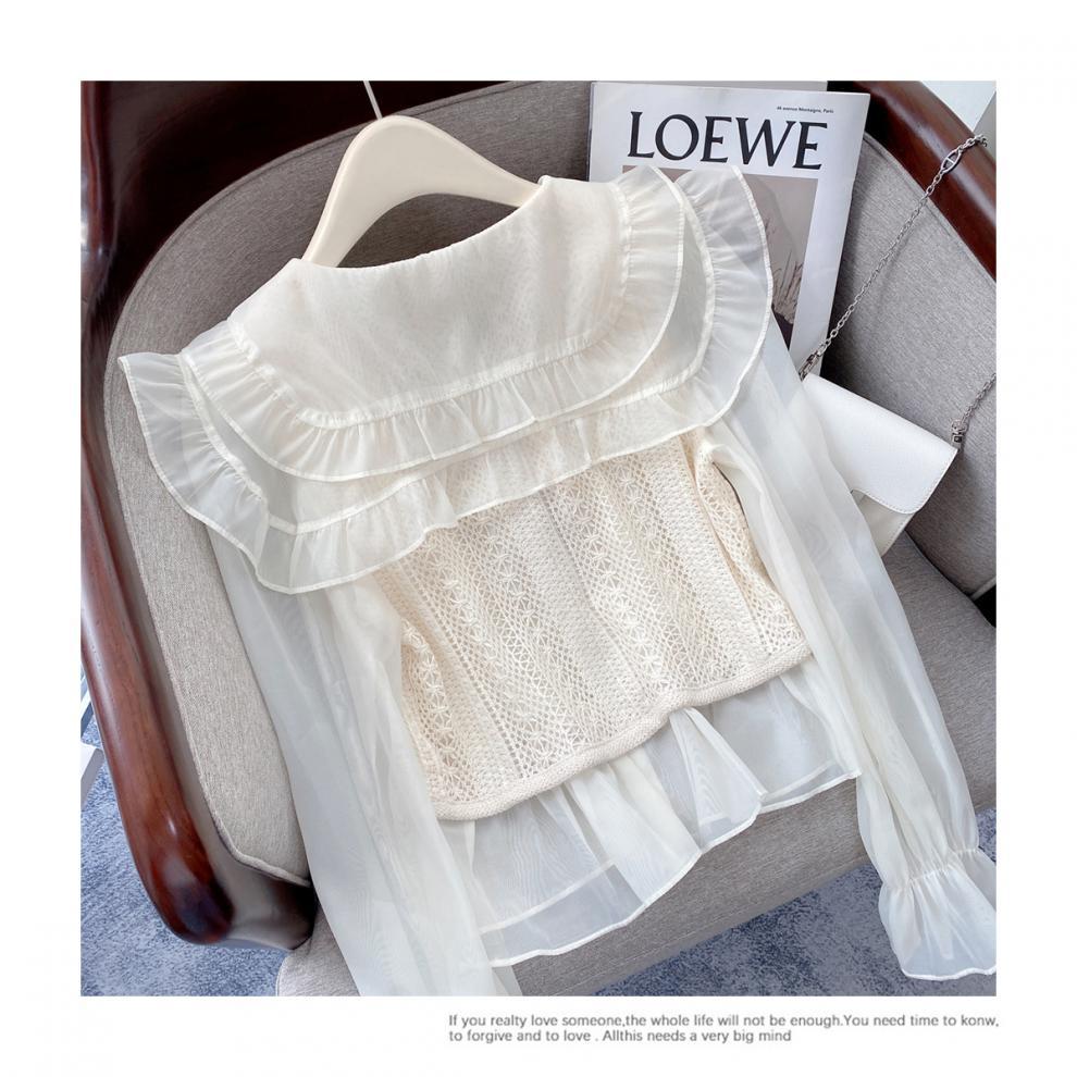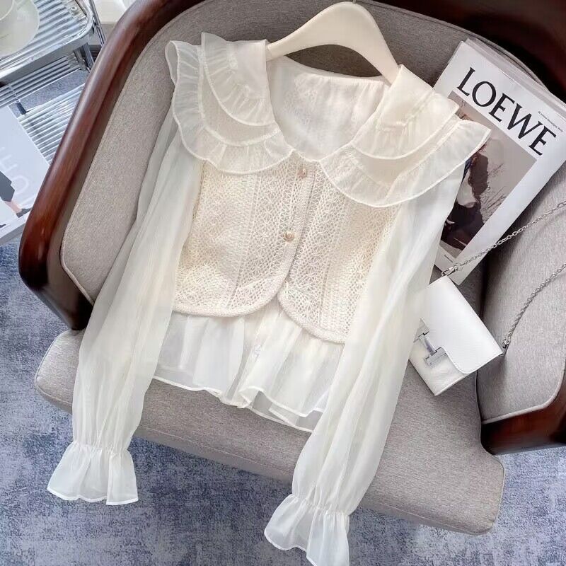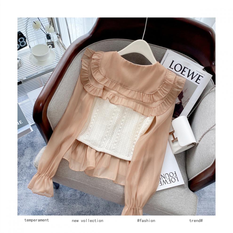 봄과 가을 프랑스 달콤한 더블 레이스 인형 칼라 셔츠 여성용 쉬폰 긴 소매 가짜 투피스 스티칭 조끼 탑